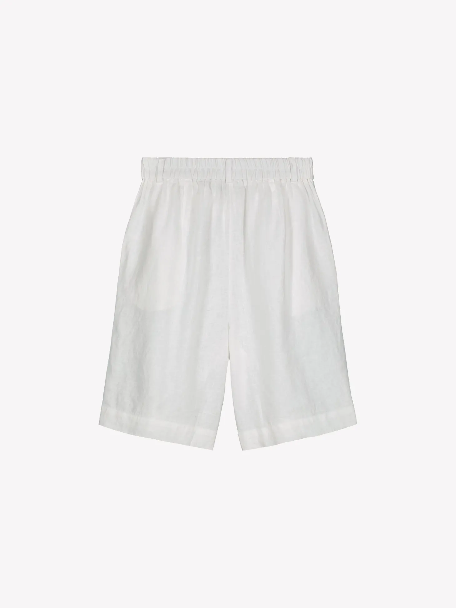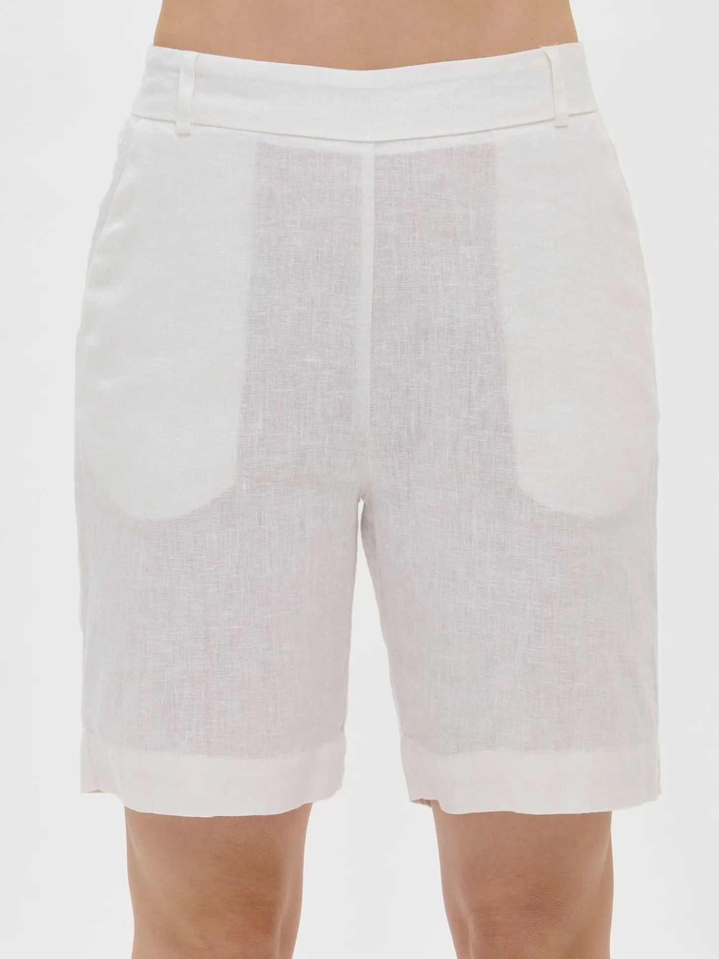 Naisten klassiset valkoiset Liine-pellavashortsit. Tyylikkäät ja ajattomat pellavashortsit ovat kesän luottovaate. Shortseissa on leveä vyötärökaitale ja takana kuminauha. Shortseissa on sivuissa taskut ja leveä käänne lahkeensuissa. Shortsien lahkeen sisäpituus koossa 38 on noin 24 cm. Materiaali on kudottua pellavakangasta, joka on kestävää ja hengittävää. Pellavalle on ominaista luonnollinen pieni rypistyminen. Tuote on esipesty tuotannossa, joten se ei kutistu ensimmäisessä pesussa.