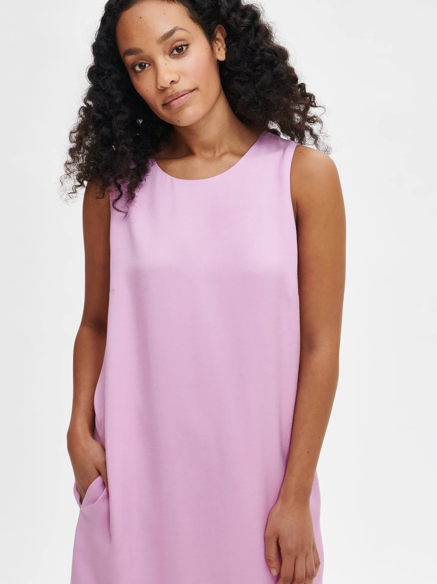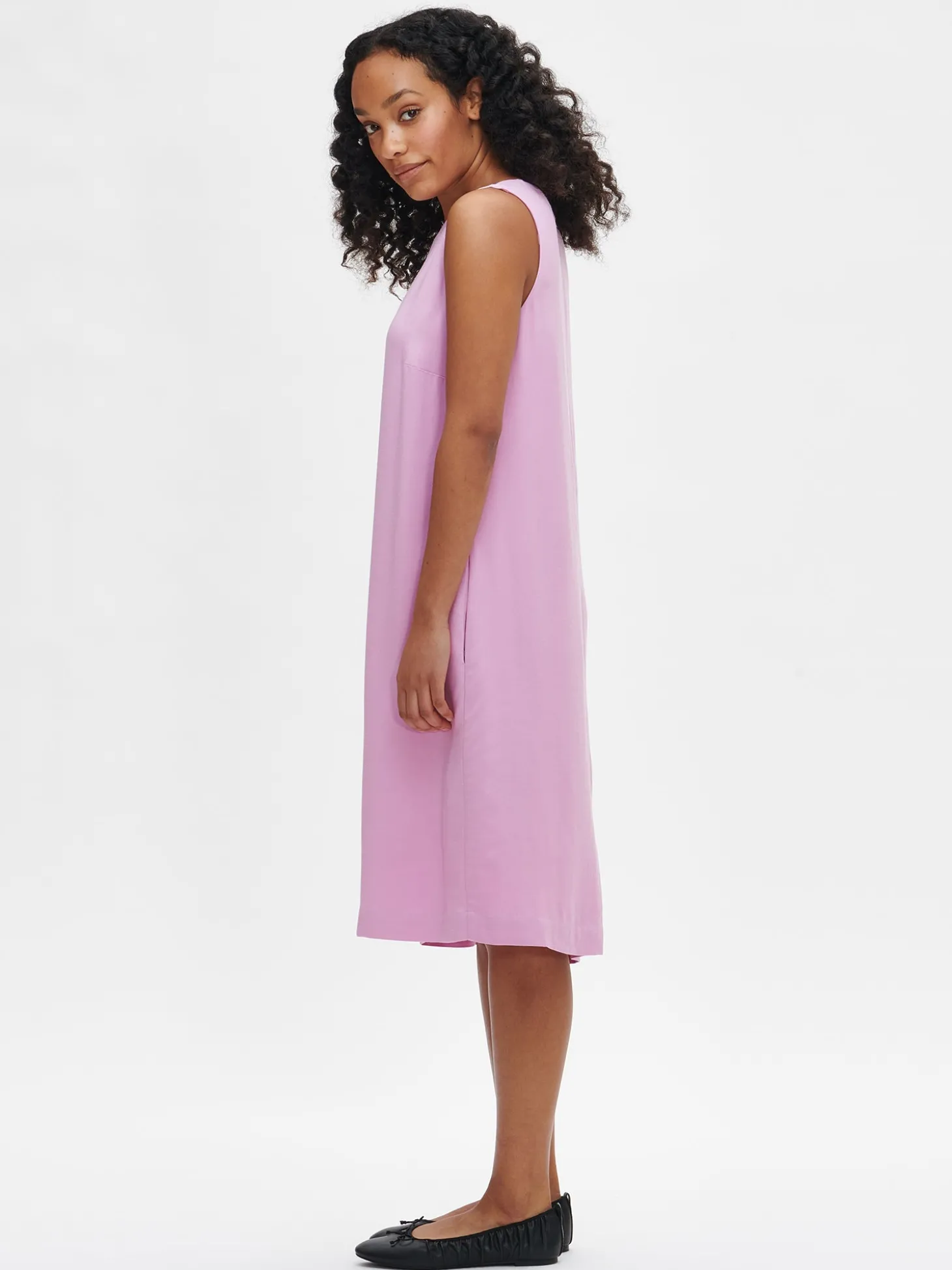 Naisten kaunis vaaleanpunainen Lila-mekko. Kevyesti A-linjaisessa mekossa on vuori, vetoketju takana, rintamuotolaskokset ja sivusaumassa taskut. Mekon pituus koossa 38 on noin 98 cm. Materiaali on laadukasta ja miellyttävän tuntuista viskoosi-pellava-kangasta. Kankaan pinta on twill sidoksinen ja pinnassa on hienostunut, himmeä kiilto. Materiaalille on ominaista 3-5% kutistuminen ensimmäisessä pesussa. Vuorin materiaali on 100 % viskoosia.