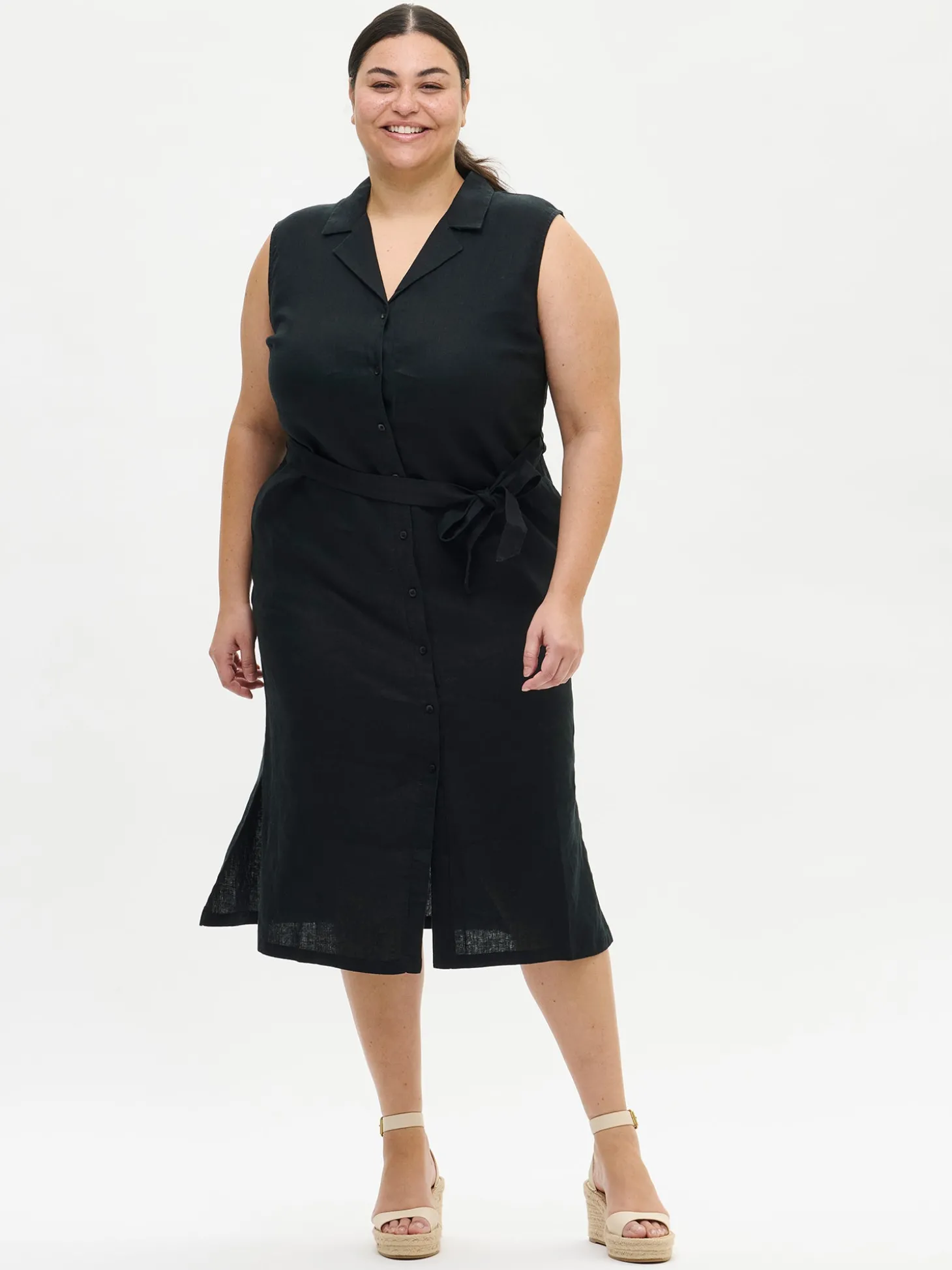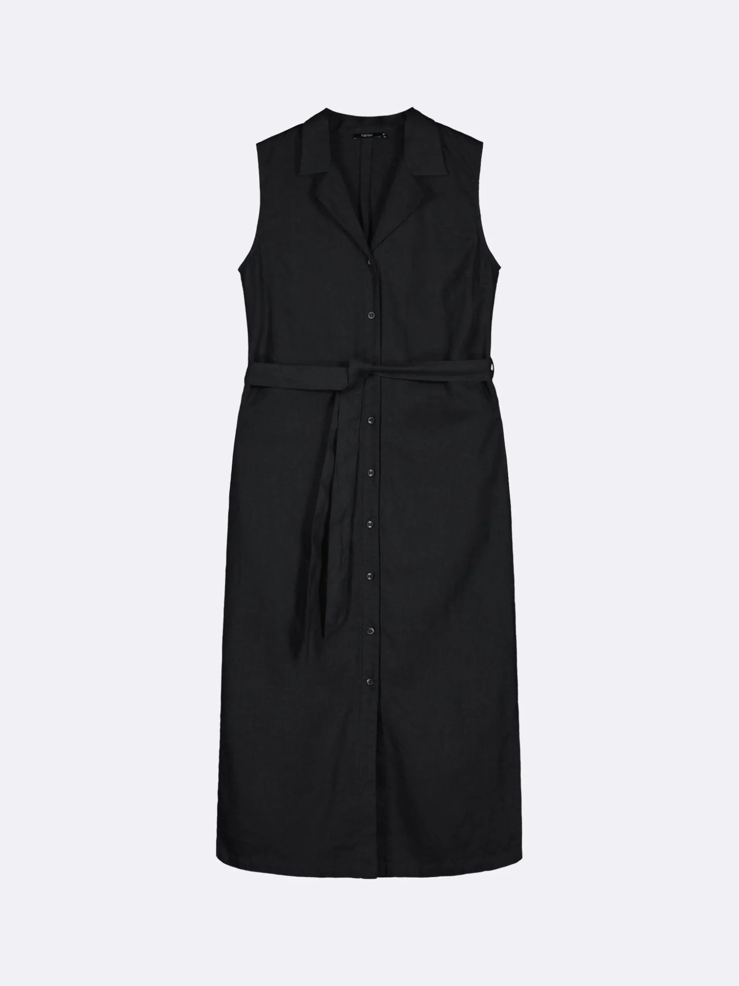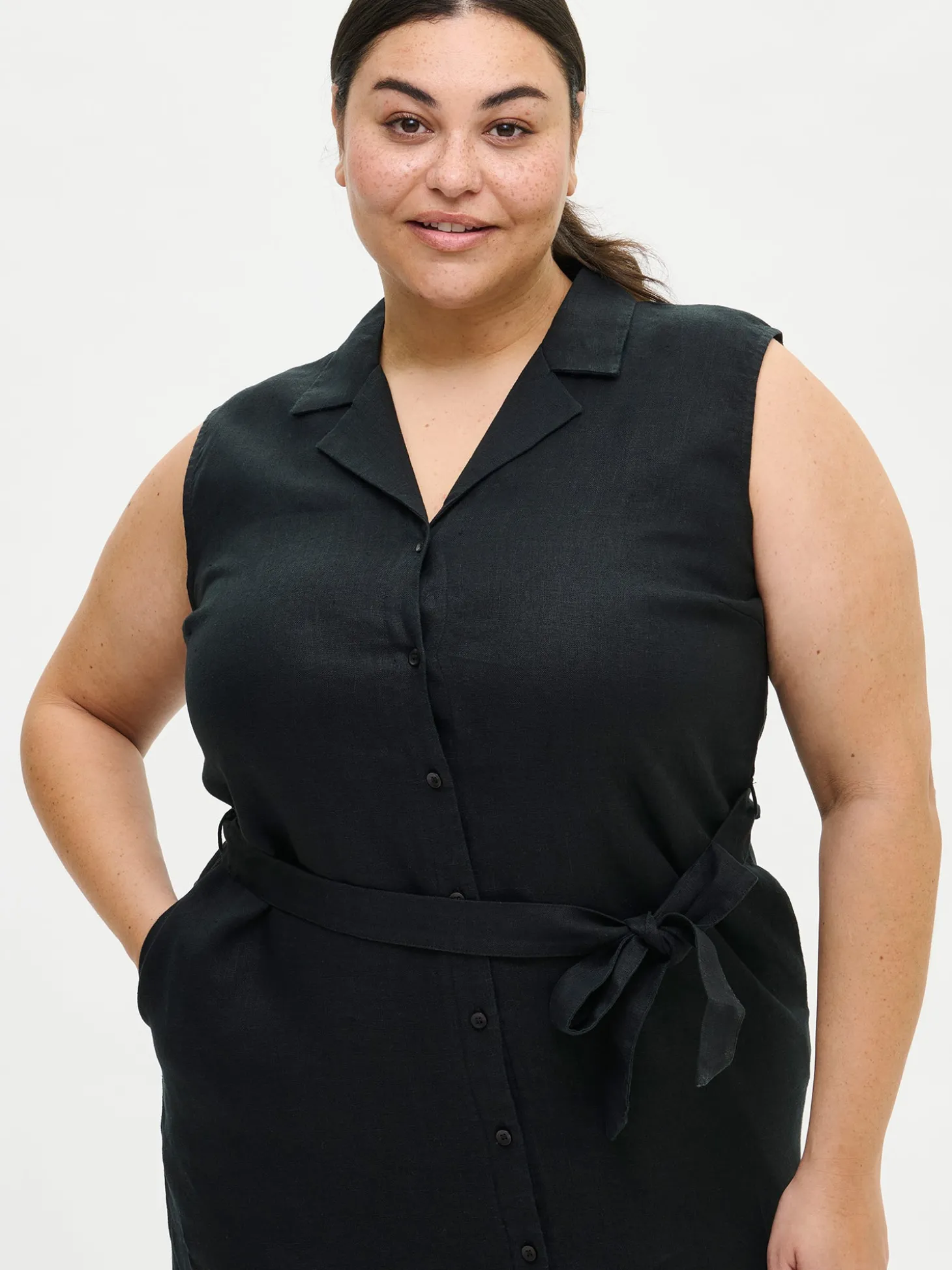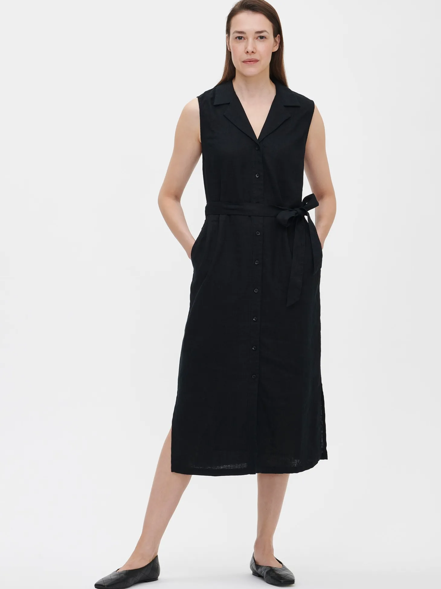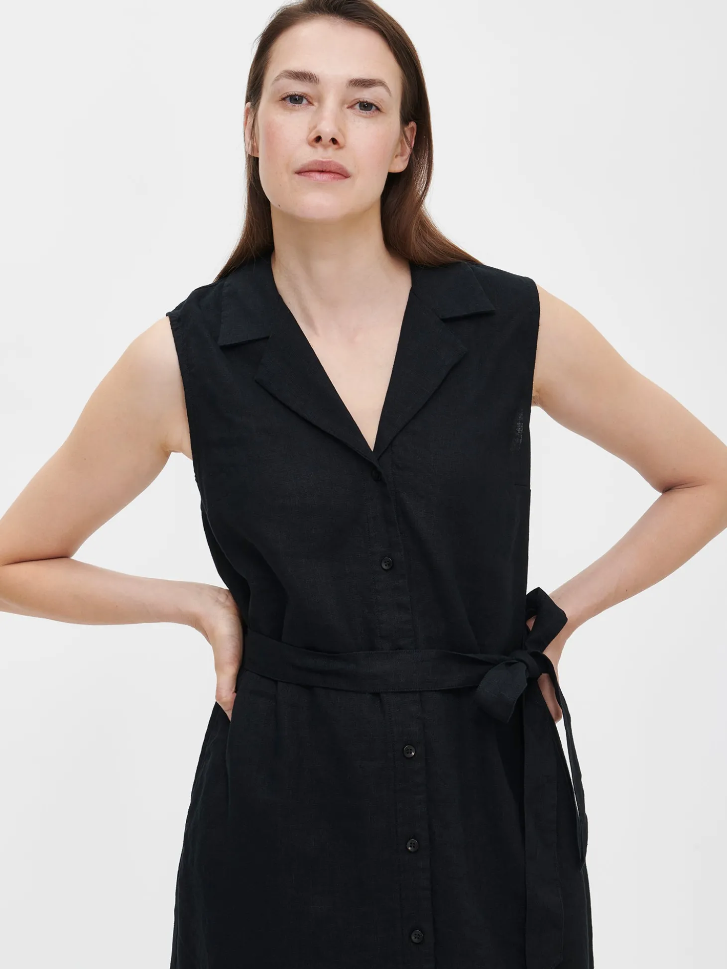 Naisten hihaton musta Lin-pellavamekko vyöllä ja kauluksilla. Klassisen tyylikäs Lin-pellavamekko sopii sekä arkeen että juhlaan. Hihattomassa mekossa on kauniisti muotoiltu kaulus, nappilista edessä ja sivutaskut. Vyötäröllä on irrotettava vyö ja helmassa korkeat sivuhalkiot. Mekon pituus koossa 38 on noin 125 cm. Materiaali on kudottua pellavakangasta, joka on kestävää ja hengittävää. Pellavalle on ominaista luonnollinen pieni rypistyminen. Tuote on esipesty tuotannossa, joten se ei kutistu ensimmäisessä pesussa.