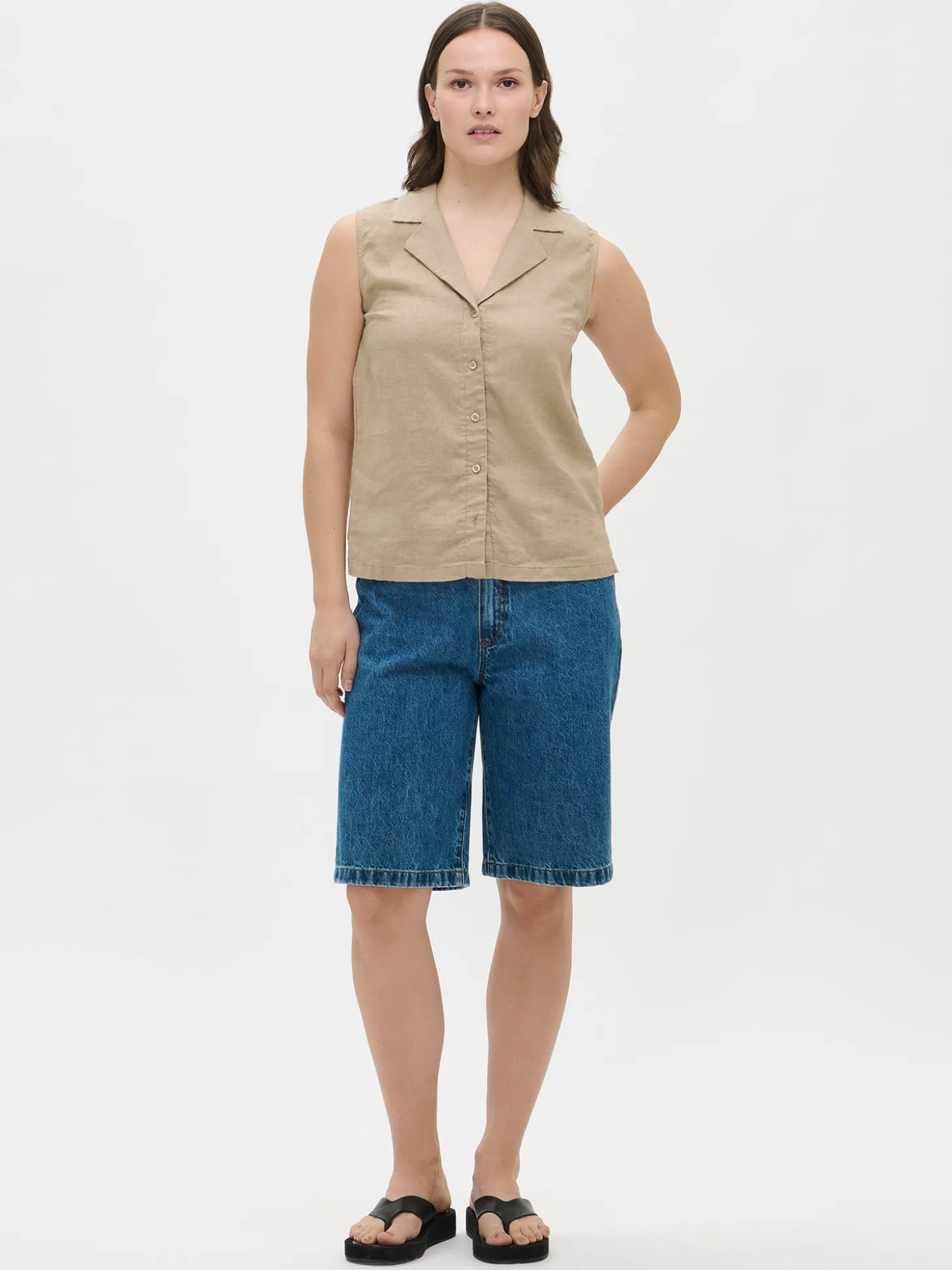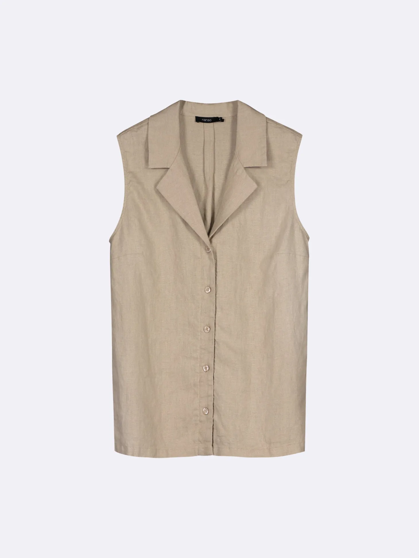 Naisten tyylikäs beige Lin-pellavatoppi. Ajaton pellavatoppi on ihana vaate vuoden ympäri. Yhdistä Lin-toppi samanvärisiin ja viimeistele asu . Lin-topissa on kauniisti muotoiltu kaulus, nappilista edessä ja sivuhalkiot. Topin pituus koossa 38 on noin 65 cm. Materiaali on kudottua pellavakangasta, joka on kestävää ja hengittävää. Pellavalle on ominaista luonnollinen pieni rypistyminen. Tuote on esipesty tuotannossa, joten se ei kutistu ensimmäisessä pesussa.