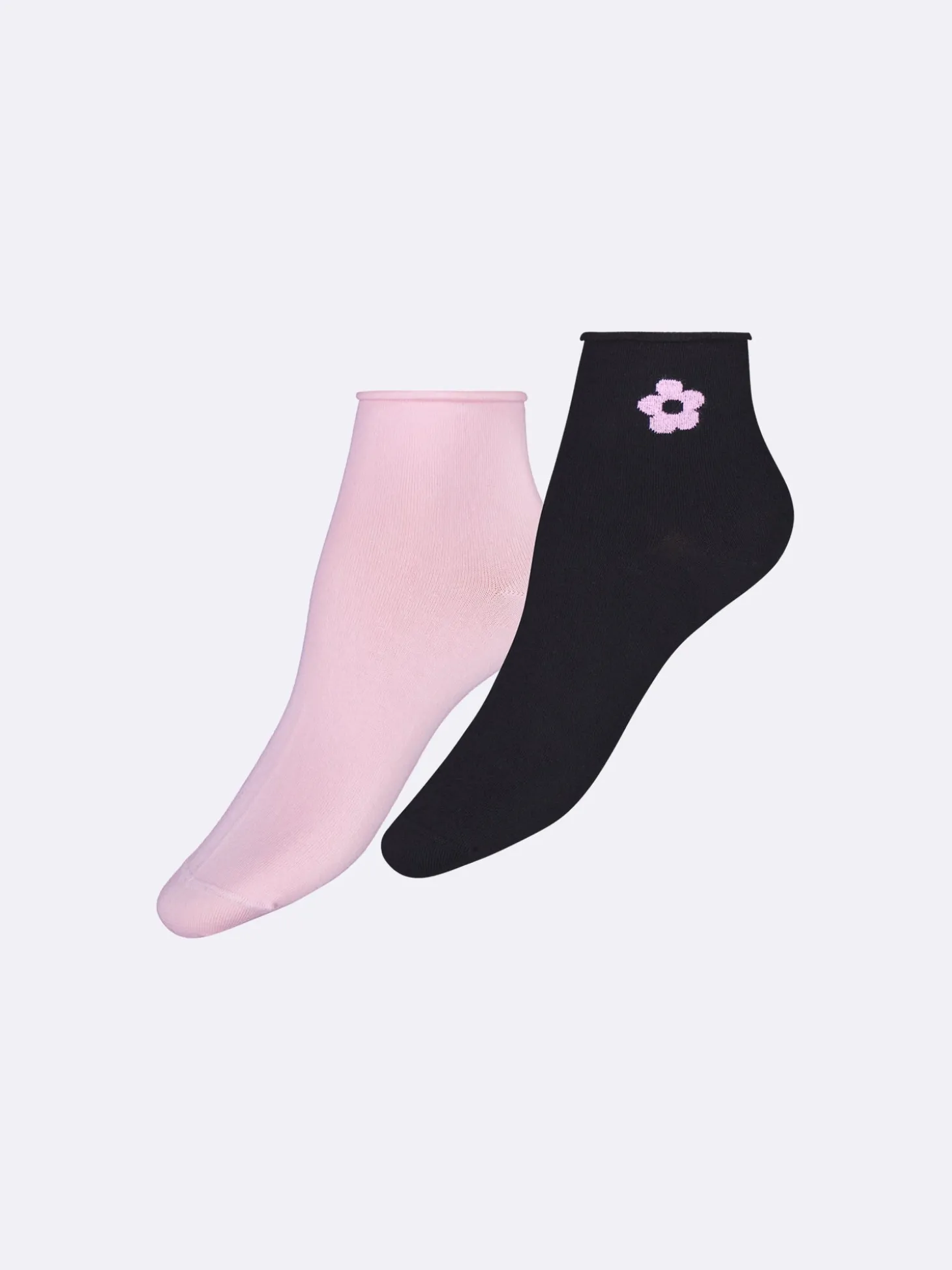 Voguen korkealaatuiset lyhytvartiset nilkkasukat luomupuuvillasta. Kahden parin pakkauksessa toisessa parissa on kaunis kukkakuvio nilkalla ja toinen pari on yksivärinen.
