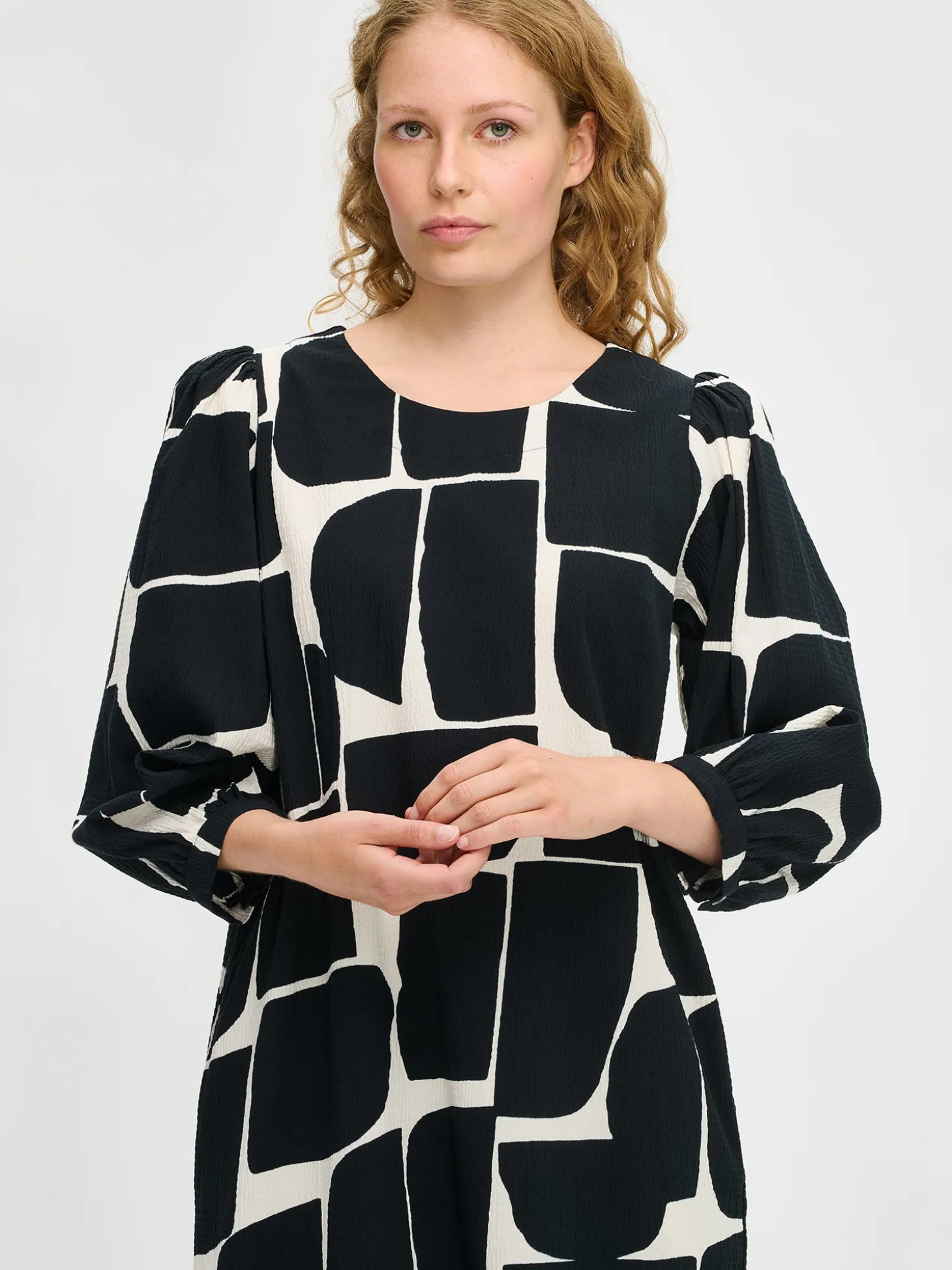 Naisten kuviollinen Muuri-mekko. Mekossa on alavaralla viimeistelty pyöreä pääntie. 3/4 pituiset hihat poimuttuvat runsaasti olalla ja säädettävän listan yläpuolelta. Sivusaumoissa on käytännölliset taskut. Mekon pituus koossa 38 on noin 95 cm. Laadukas kudottu puuvillakangas, jossa on hieman elastaania, antaa ryhdikkyyttä ja mukavaa joustoa. Ajaton Muuri-mekko on tyylikäs valinta, joka toimii sellaisenaan tai asustettuna niin arjessa kuin juhlassakin.