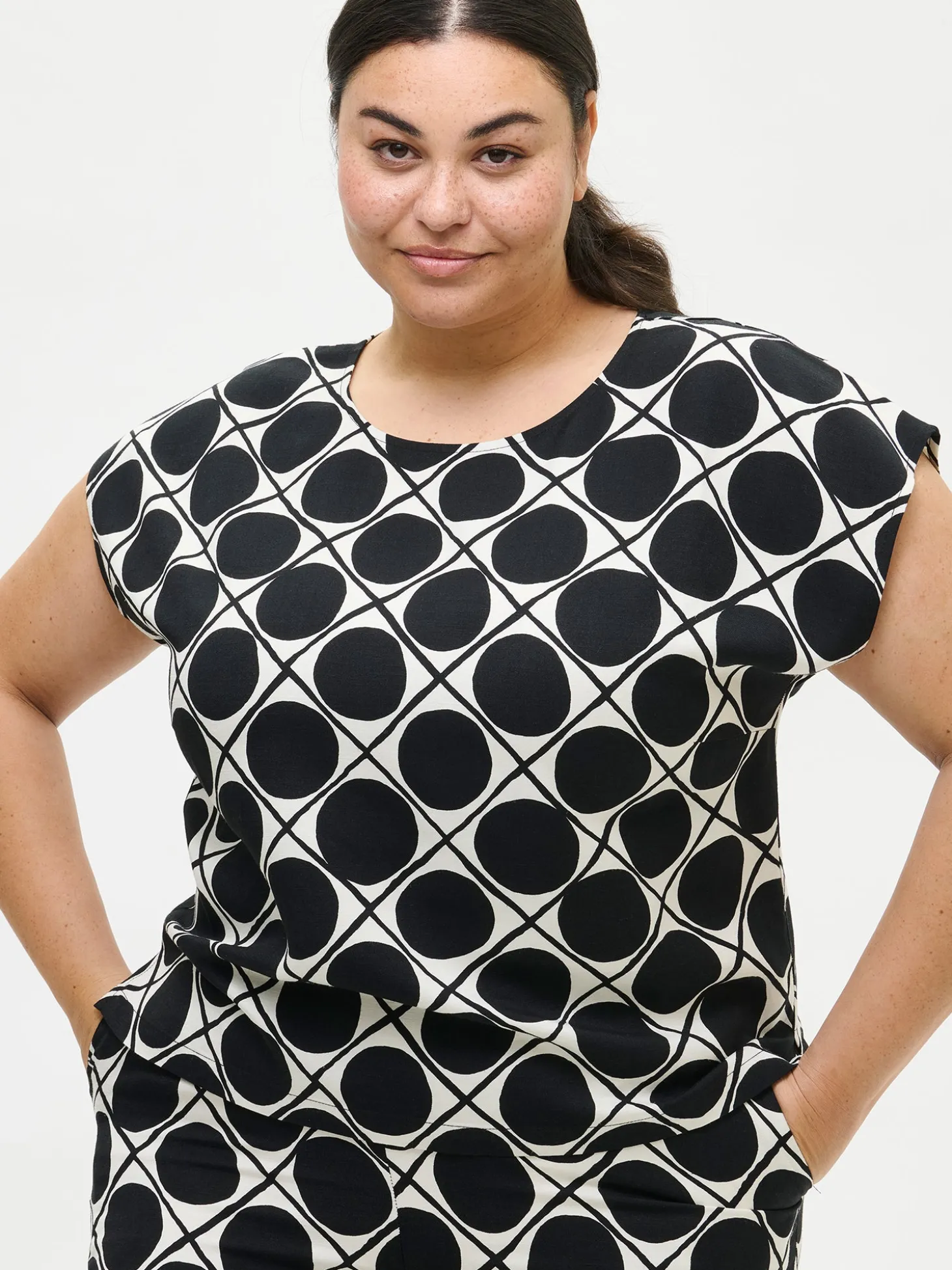 Naisten rento kuosillinen musta Napoli-pusero. Yhdistä tyylikäs Napoli-toppi yhteensopiviin . Laatikkomaisessa puserossa on kantilla viimeistelty pyöreä pääntie, suora helma ja halkiot sivuissa. Puseron pituus koossa 38 on noin 58 cm. Materiaali on laadukasta ja miellyttävän tuntuista kudottua viskoosi-pellava-kangasta. Kankaan pinta on twill sidoksinen ja pinnassa on hienostunut, himmeä kiilto. Materiaalille on ominaista 3-5 % kutistuminen ensimmäisessä pesussa.