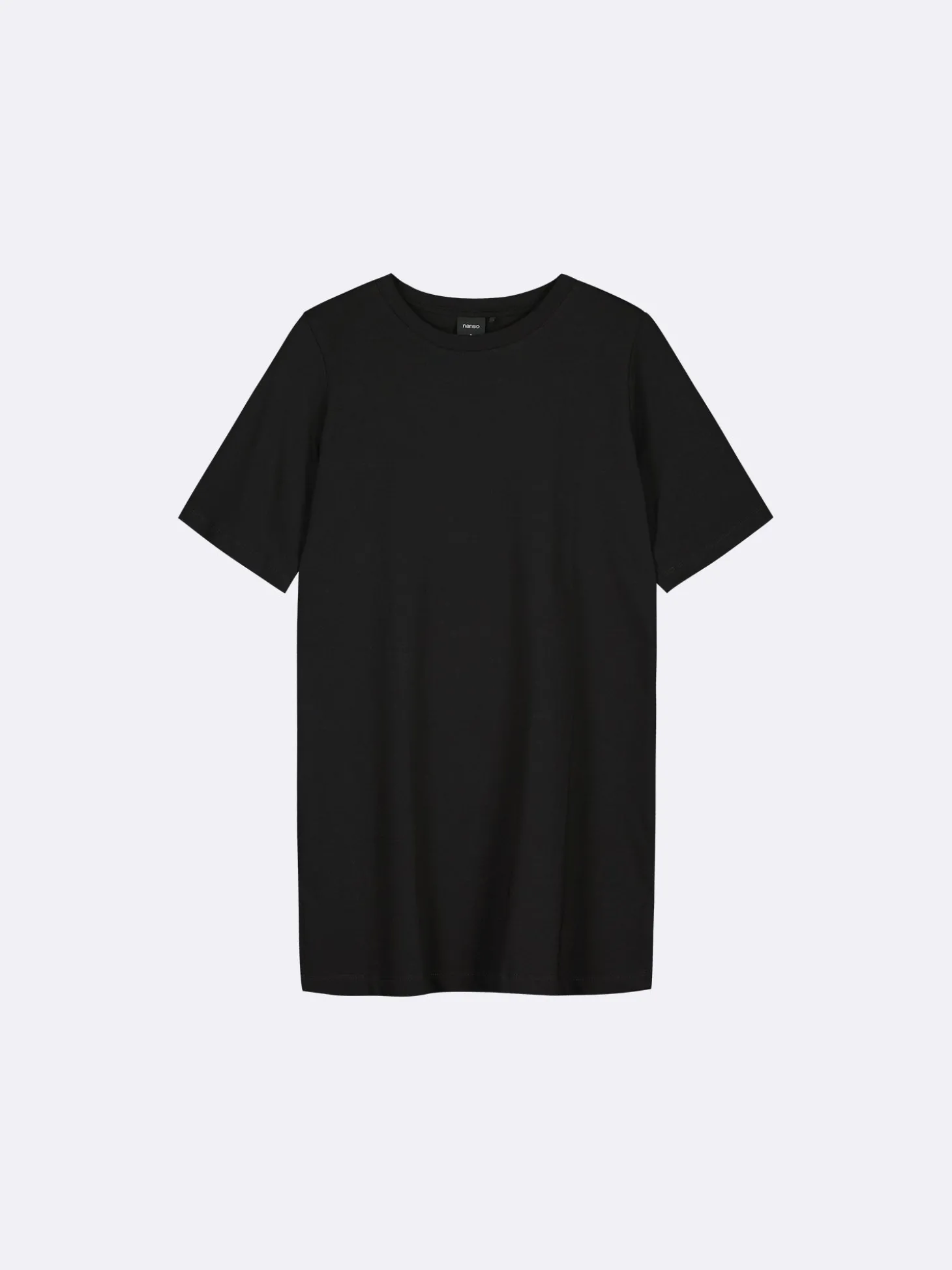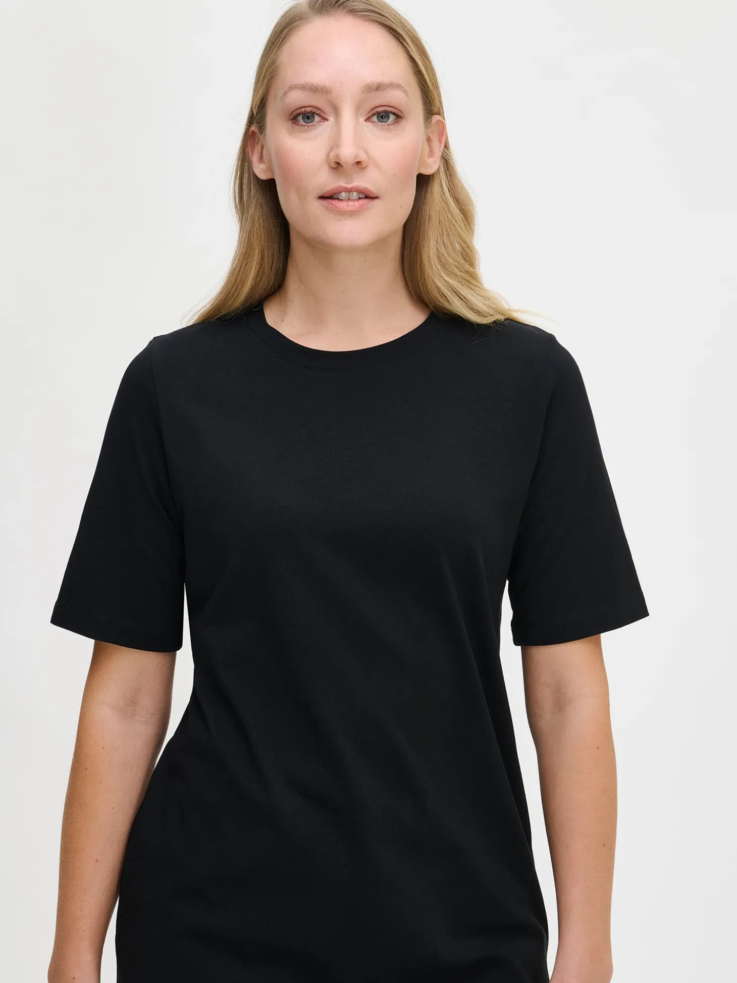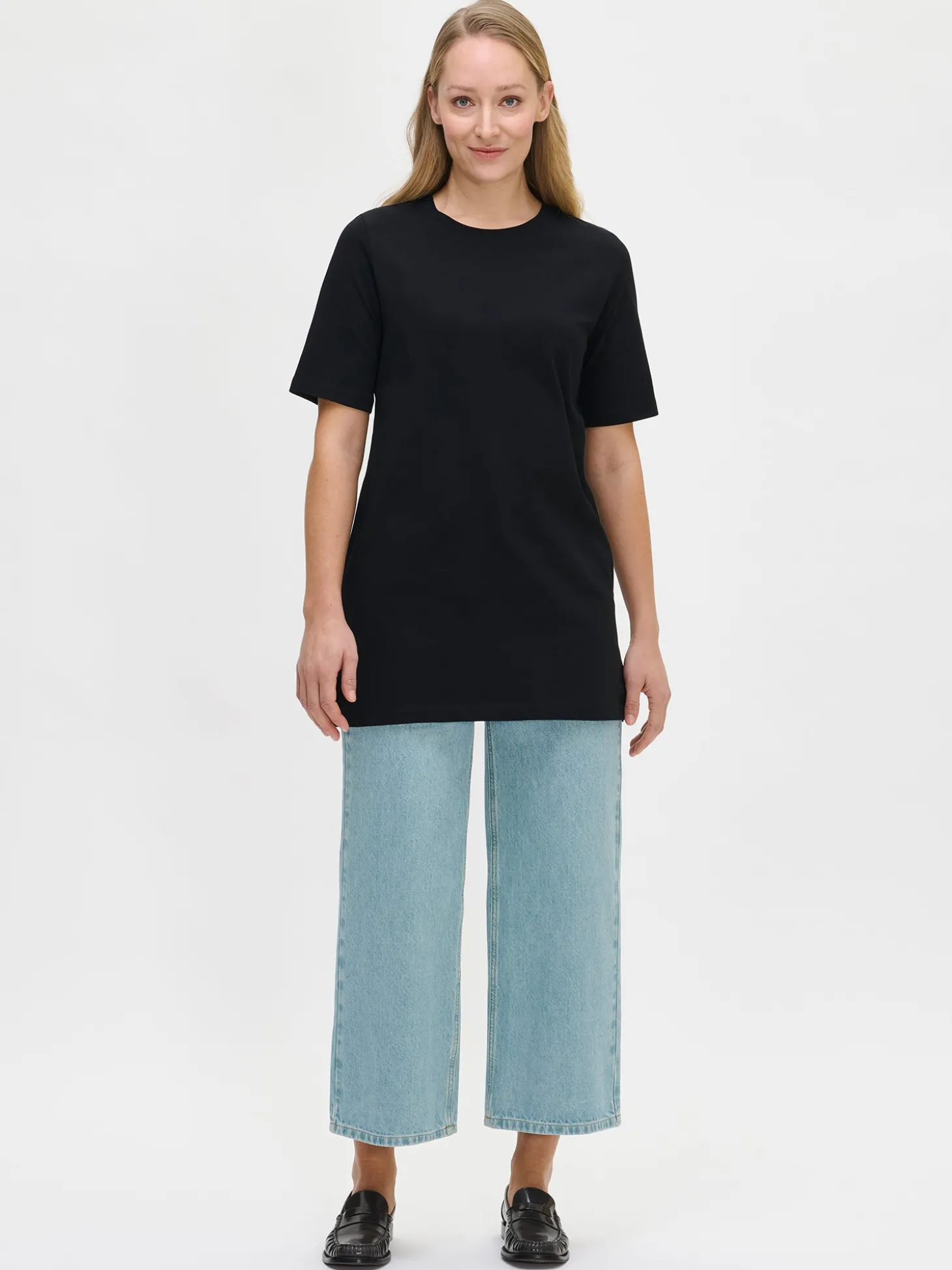 Naisten laadukas pitkä musta Normi-t-paita. Trendikäs pitkä t-paita sopii niin housujen kuin hameidenkin kanssa. Suoralinjaisessa t-paidassa on pyöreä ribbi pääntie, 1/4 pituiset hihat, sivuhalkiot helmassa. T-paidan pituus koossa M on noin 80 cm. Materiaali on 100 % laadukasta luomupuuvillaa, joka pysyy hyvänä käytössä.