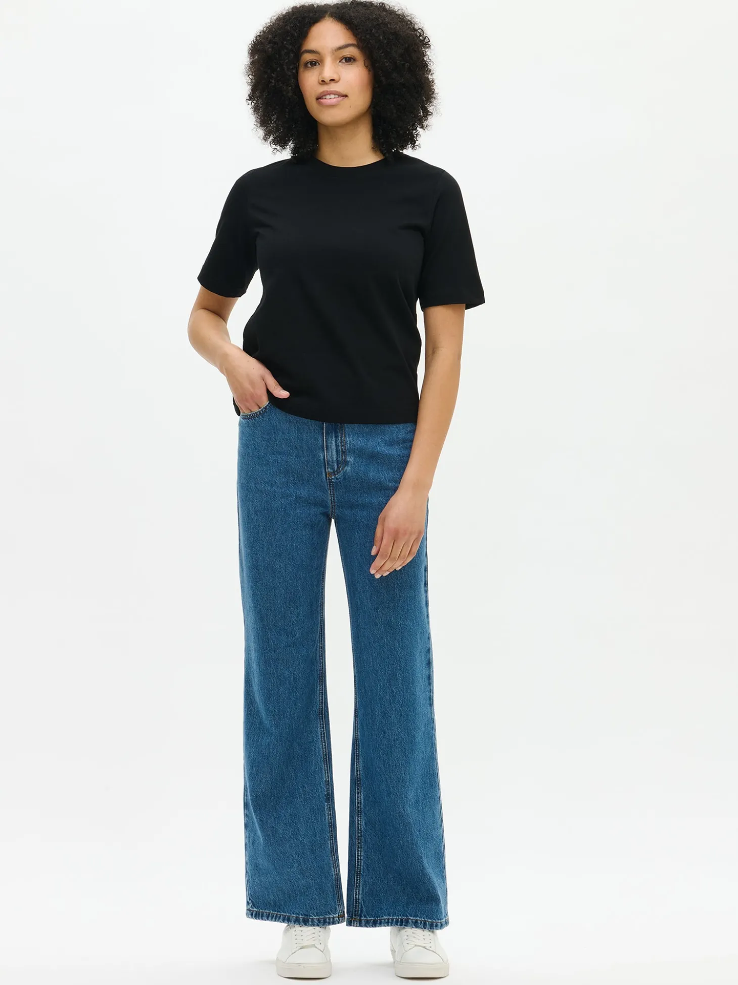 Naisten laadukas musta Normi-t-paita. T-paita on monikäyttöinen ja varma valinta kaikkiin asukokonaisuuksiin – puet sen sitten housujen, hameiden tai mekkojen kanssa, laadukas ja ajaton t-paita näyttää aina hyvältä. Suoralinjaisessa t-paidassa on pyöreä ribbi pääntie ja 2/4 pituiset hihat. T-paidan pituus koossa M on noin 65 cm. Materiaali on 100 % laadukasta luomupuuvillaa, joka pysyy hyvänä käytössä.