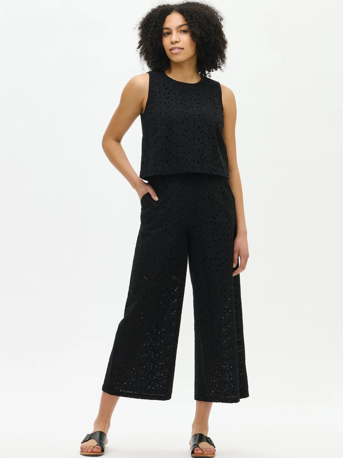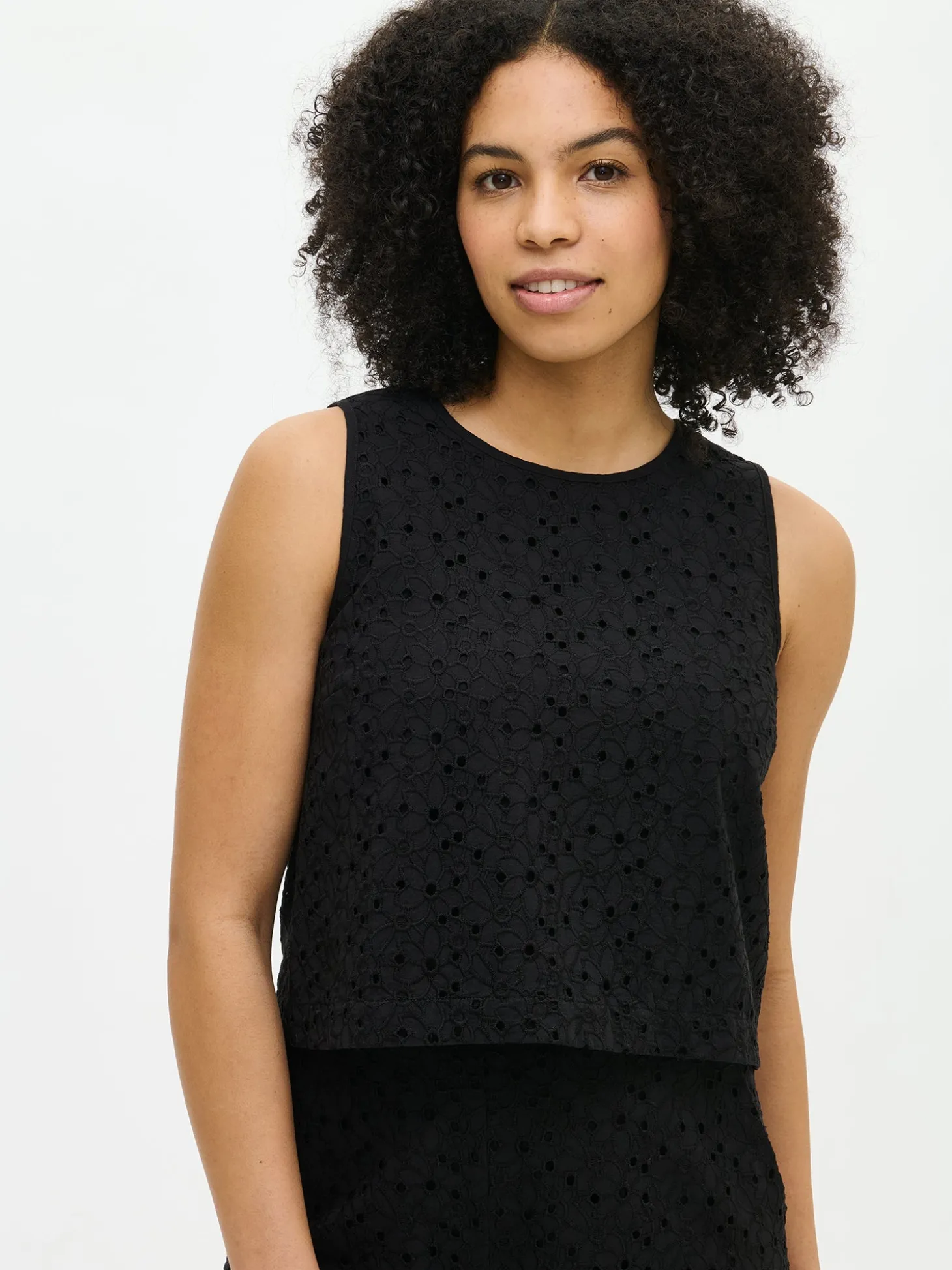 Naisten kaunis musta brodeerattu Nuppu-pusero. Puserossa on kantilla viimeistellyt käden tiet sekä pyöreä pääntie. Edessä on rintamuotolaskokset ja takana halkio napilla. Puseron pituus koossa 38 on noin 50 cm. Materiaali on kudottua puuvilla-popliinikangasta, jossa on kaunis brodeeraus. Materiaali on kevyttä ja hengittävää. Puserossa on ohut puuvillavuori.