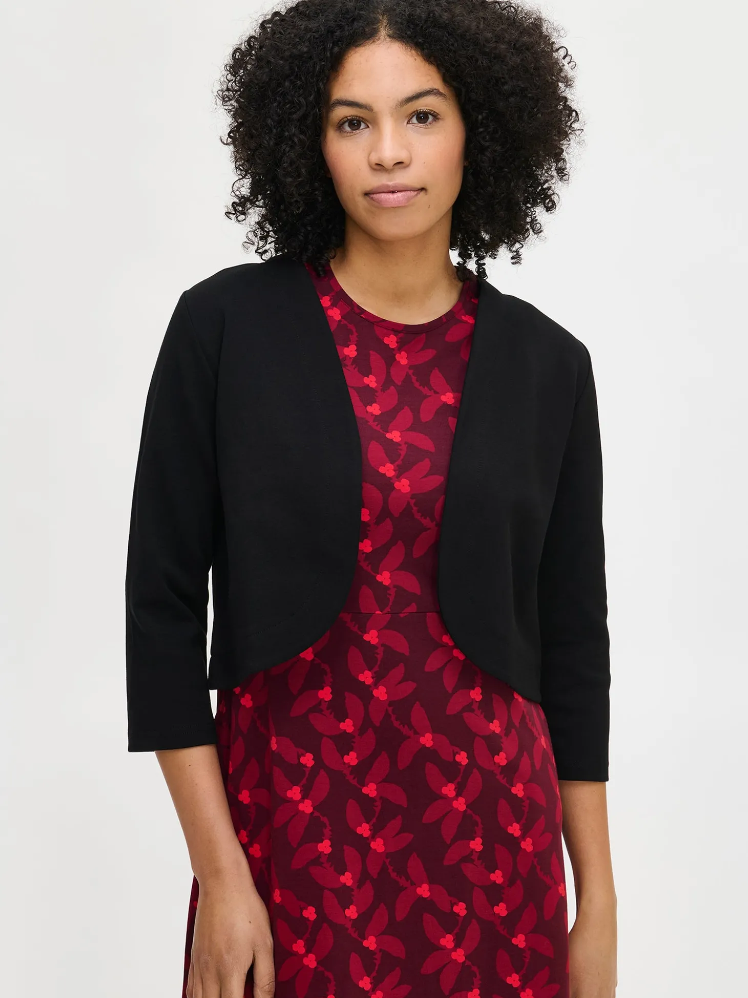 Naisten yksivärinen Opera-bolero. Boleron pääntie ja helma on huoliteltu alavaralla, helma on hieman kaareva ja hihat ovat 3/4 pituiset. Boleron pituus koossa M on noin 50 cm. Materiaali on miellyttävän tuntuista, paksumpaa interlock-neulosta. Ajaton ja monikäyttöinen bolero viimeistelee asun kauniisti.