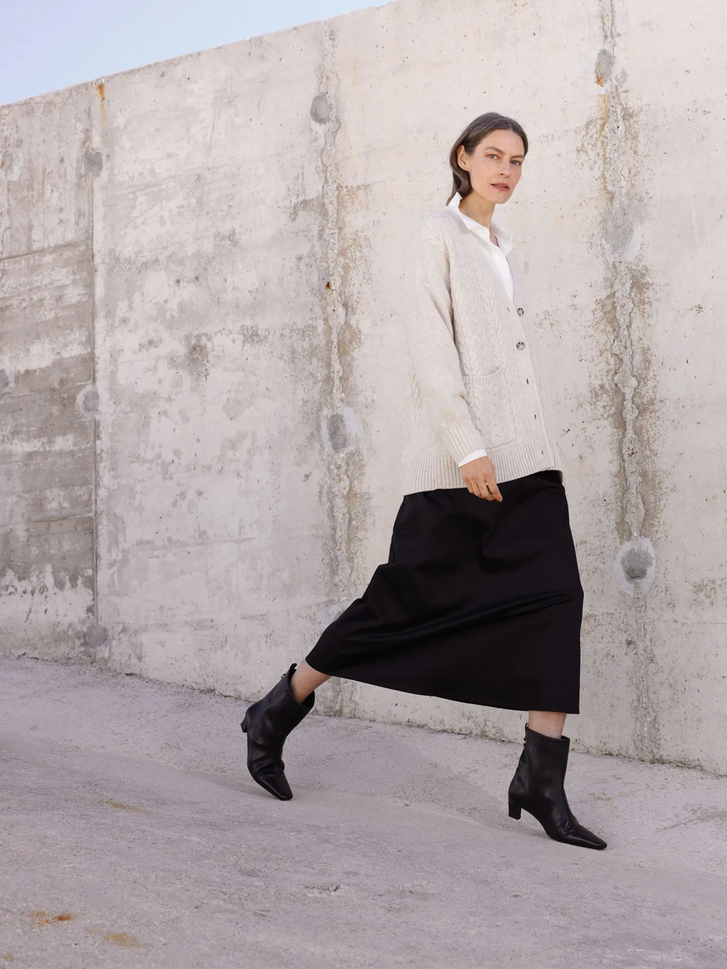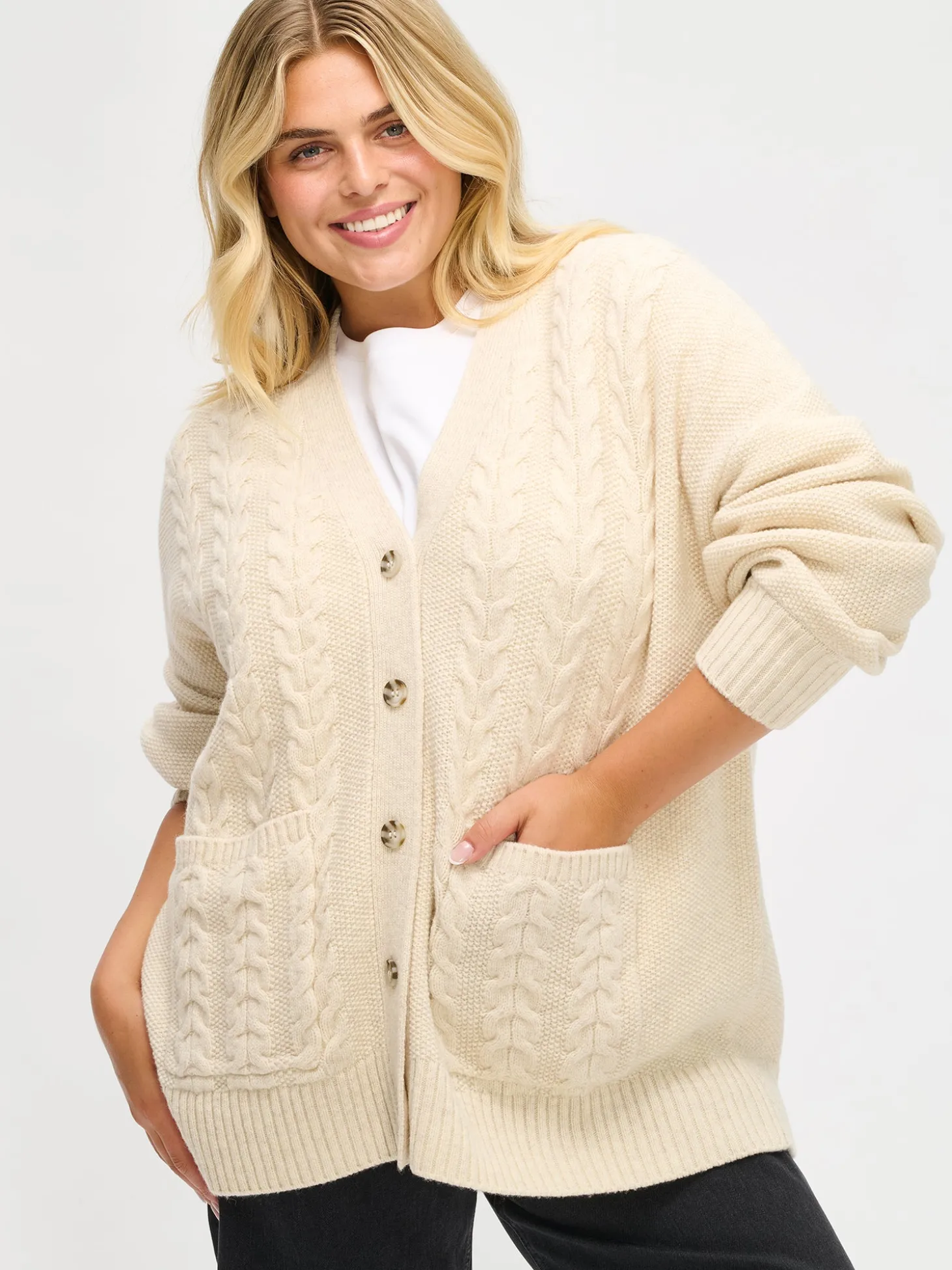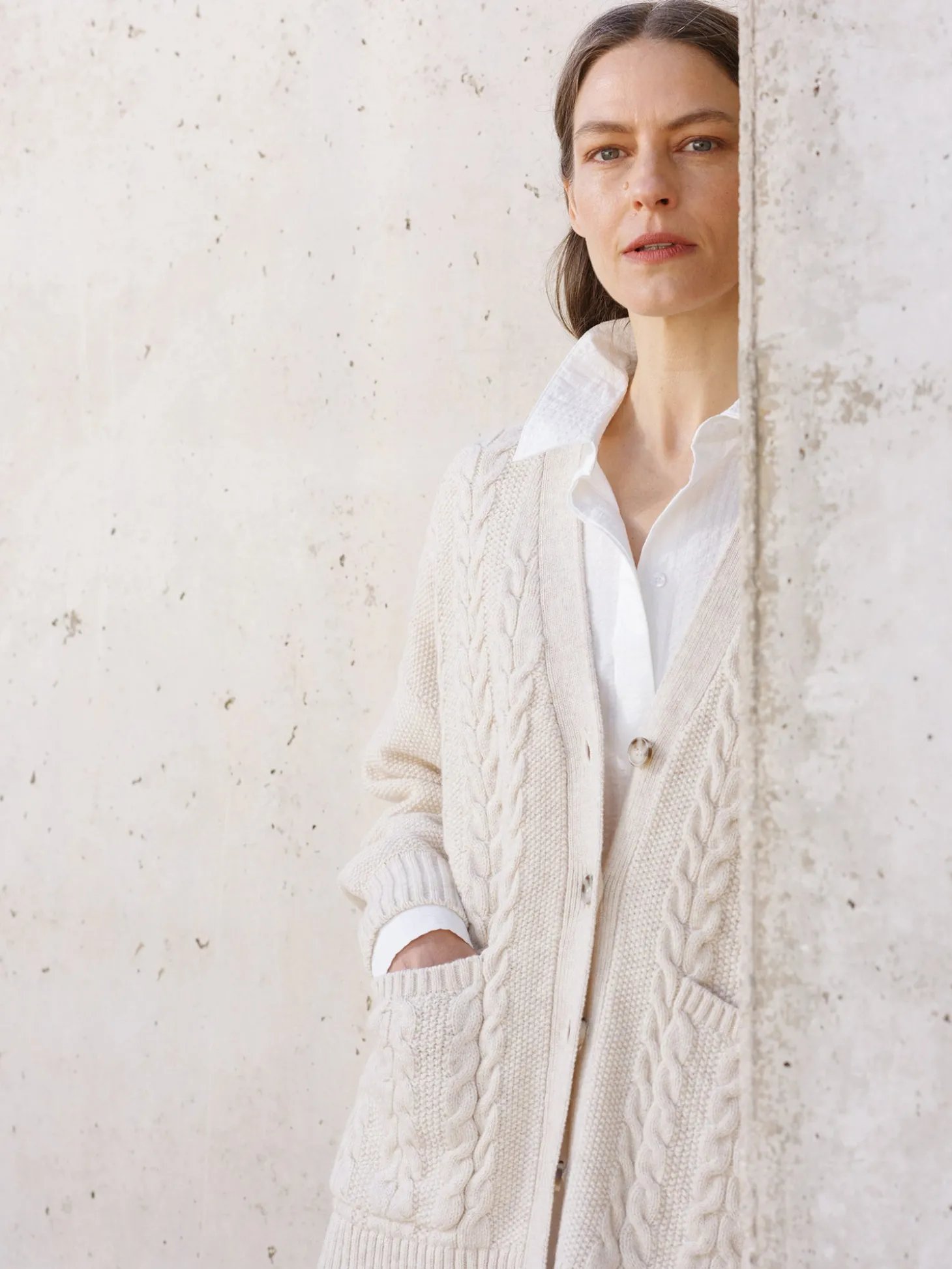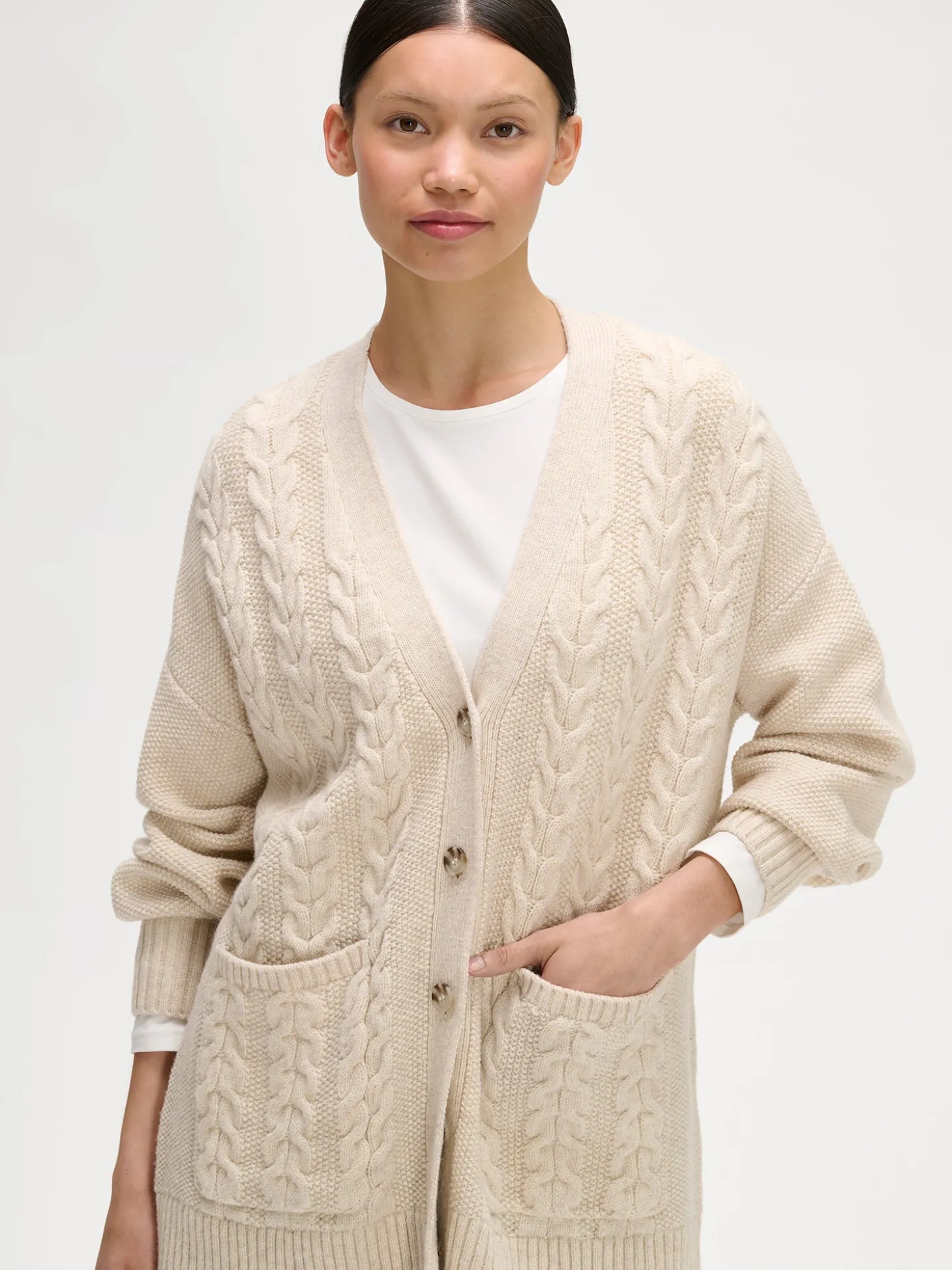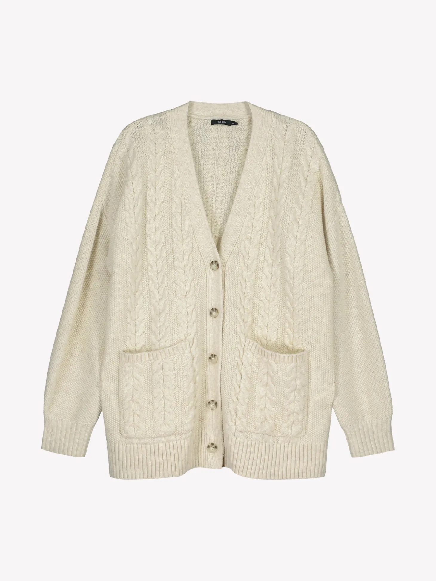 Naisten beige lämmin Palmikko-neuletakki. Muotoonneulotussa neuletakissa on täyspitkät hihat, edessä napitus ja paikkataskut. Neuletakissa on kaunis neulottu palmikkokuvio ja sen pituus koossa M on noin 70 cm. Neulos on pehmeän ja miellyttävän tuntuista villa-polyamidi sekoitetta. Tuotteen valmistuksessa on käytetty sertifioitua villaa.