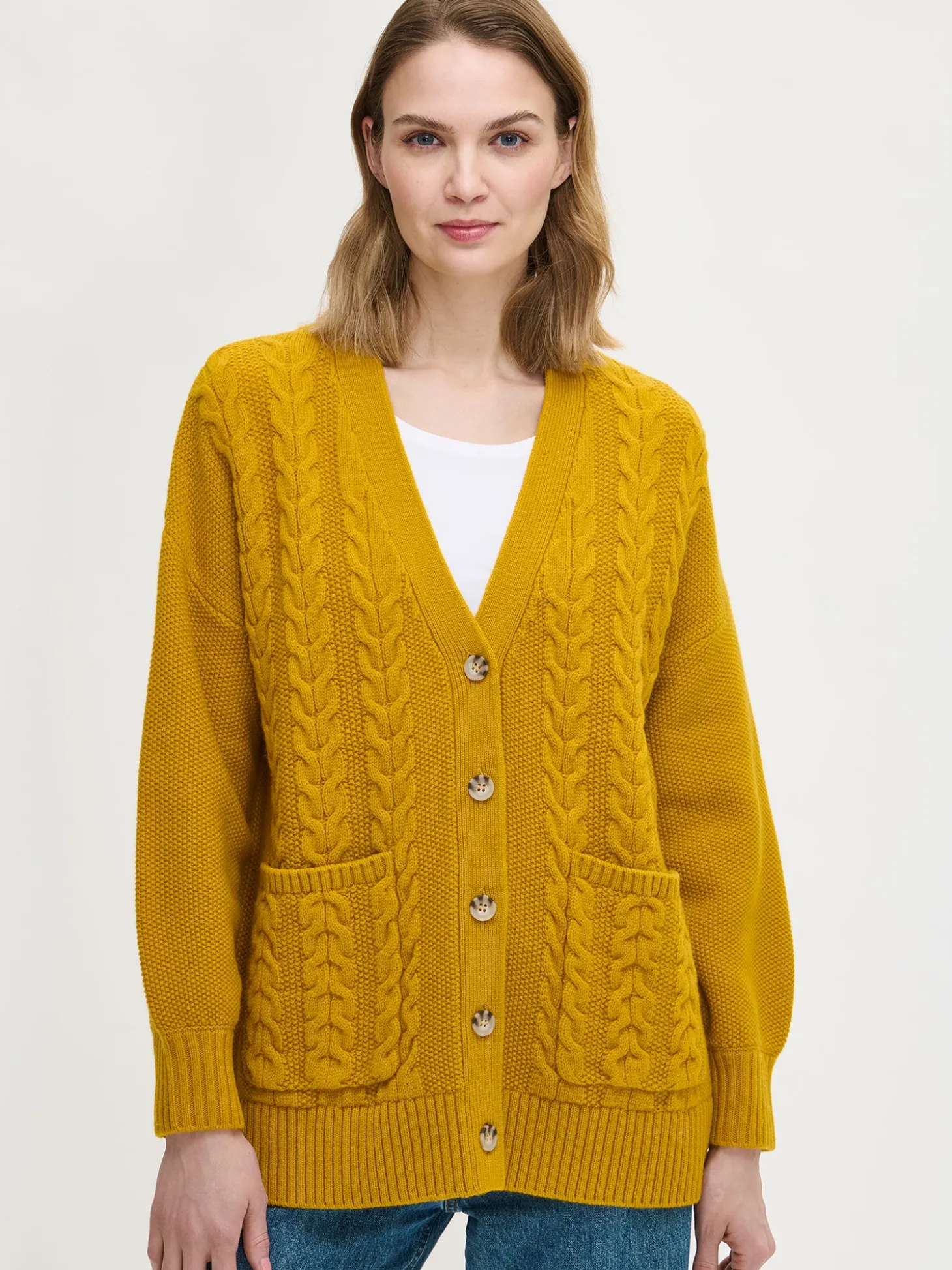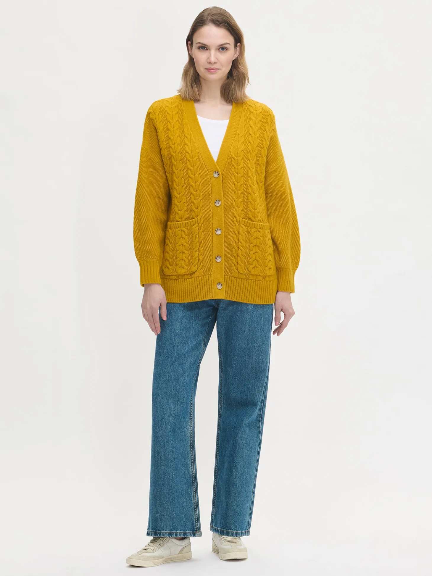 Naisten keltainen lämmin Palmikko-neuletakki. Muotoonneulotussa neuletakissa on täyspitkät hihat, edessä napitus ja paikkataskut. Neuletakissa on kaunis neulottu palmikkokuvio ja sen pituus koossa M on noin 70 cm. Neulos on pehmeän ja miellyttävän tuntuista villa-polyamidi sekoitetta. Tuotteen valmistuksessa on käytetty sertifioitua villaa.