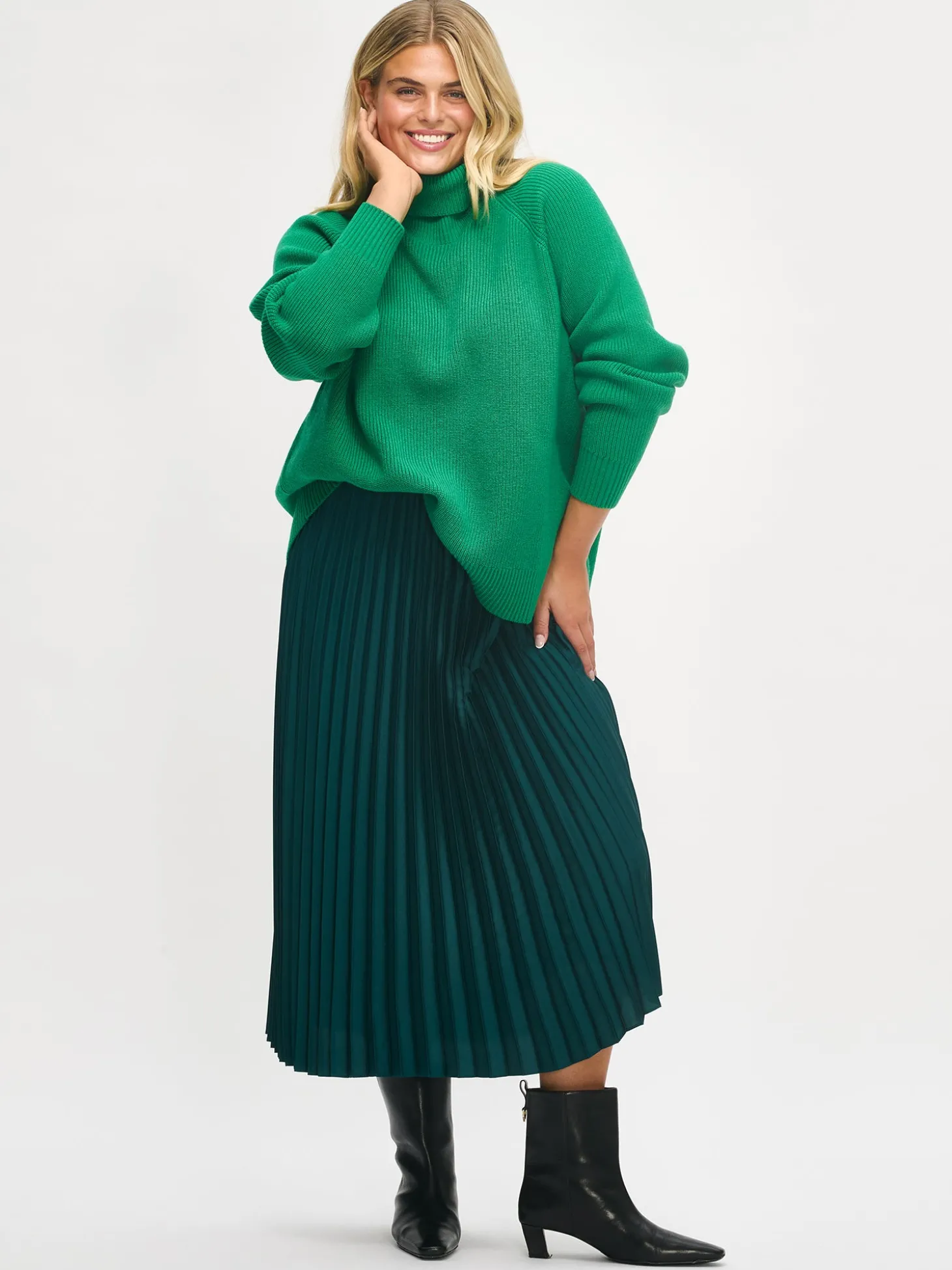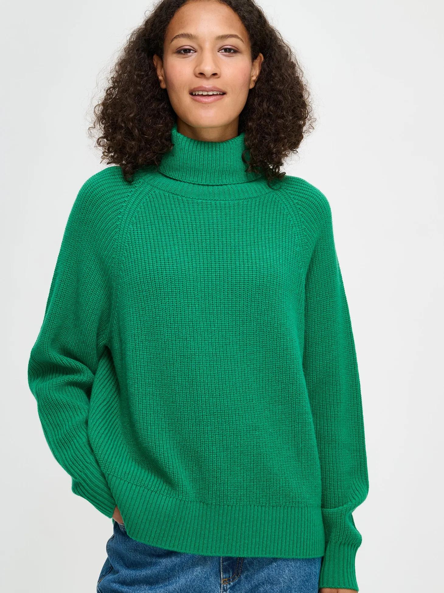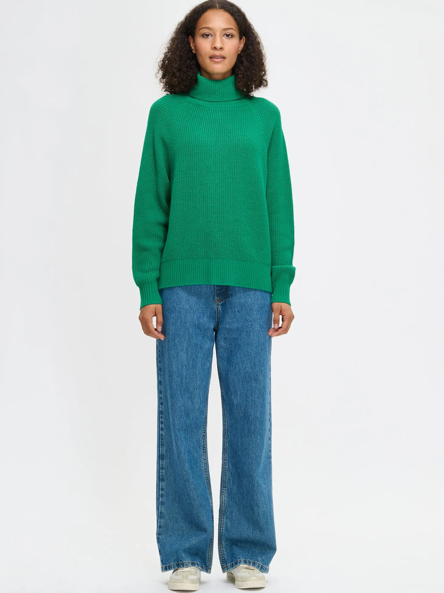 Naisten lämmin, vihreä Pamela-neulepusero. Yksivärisessä neulepuserossa on poolopääntie ja täyspitkät raglanhihat. Neulepuseron pituus koossa M on noin 60 cm. Neulepusero on puolipatenttineulosta. Neulos on pehmeän ja miellyttävän tuntuista villa-viskoosi- polyamidi sekoitetta. Tuotteen valmistuksessa on käytetty sertifioitua villaa. Neuleen hoito-ohjeet löydät