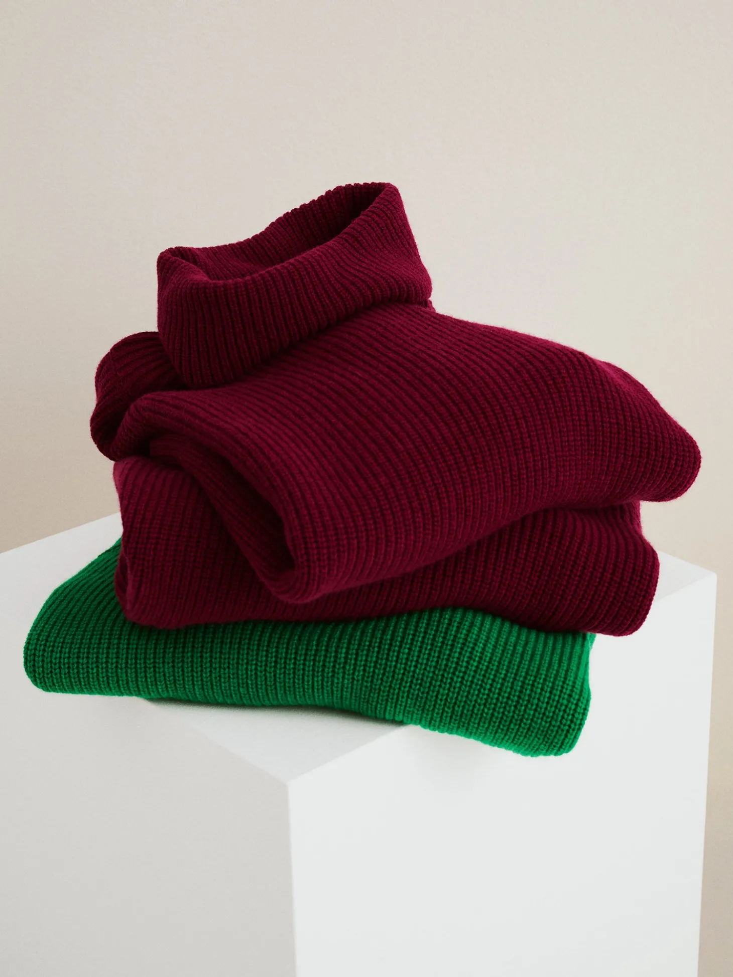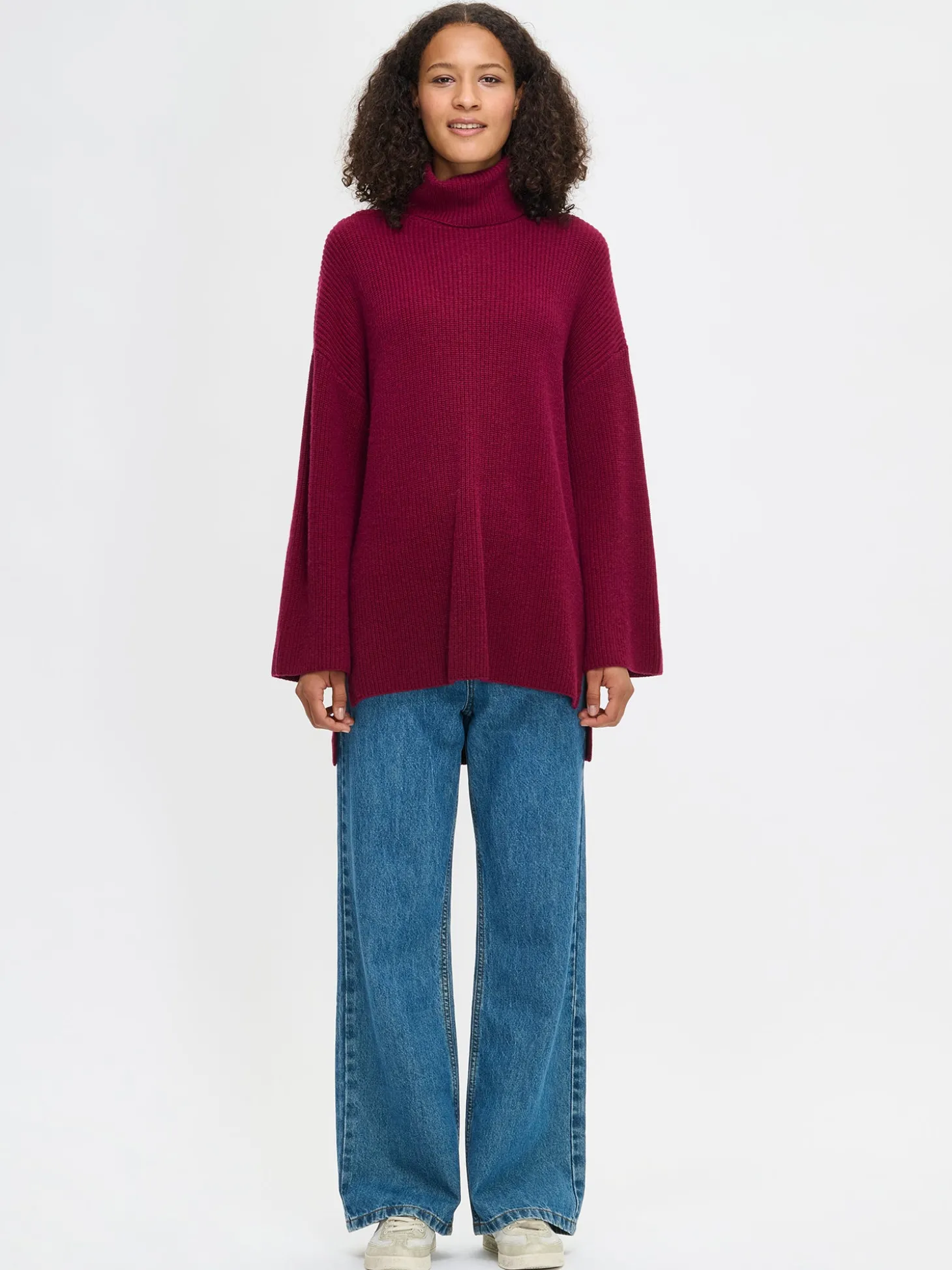 Naisten rento viininpunainen Pamela-neulepusero poolokauluksella. Neulepuserossa on pystykaulus, pudotettu olkalinja ja leveät täyspitkät hihat. Helmassa on sivuissa halkiot. Neulepuseron pituus koossa M on noin 70 cm ja helma on takaa 6cm pidempi. Neulepusero on puolipatenttineulosta. Neulos on pehmeän ja miellyttävän tuntuista villa-viskoosi-polyamidi sekoitetta. Tuotteen valmistuksessa on käytetty sertifioitua villaa. Neuleen hoito-ohjeet löydät