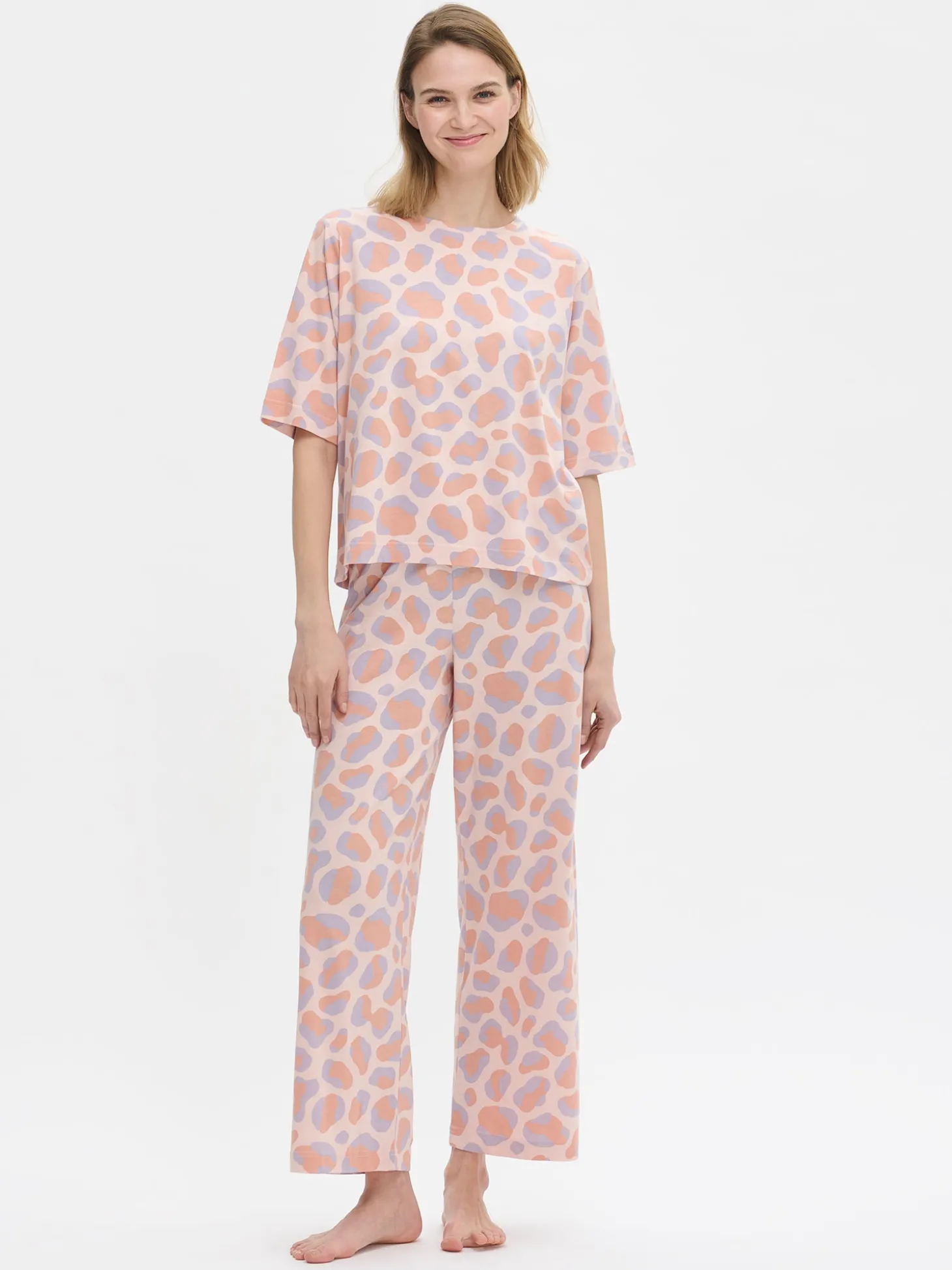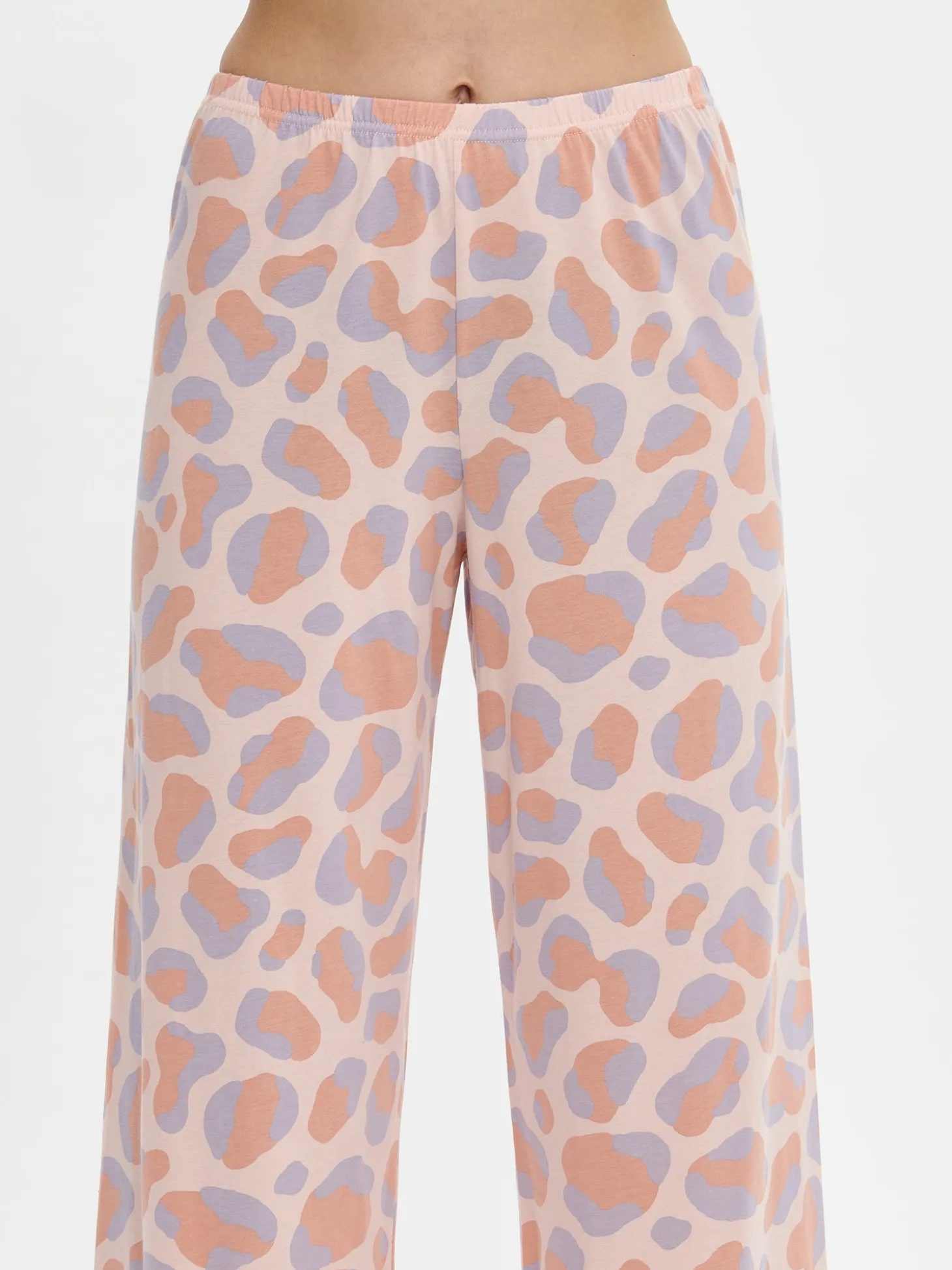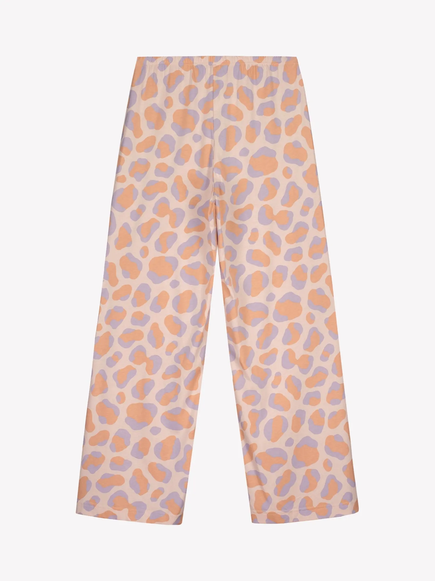 Naisten kuosilliset vaaleanpunaiset Pantteri-housut. Rennot housut ovat täyspitkät ja niissä on vyötäröllä mukava kuminauharakenne. Materiaali on laadukasta, iholla miellyttävän pehmeältä tuntuvaa ja helppohoitoista puuvilla-modaalia, joka pysyy hyvänä pesusta toiseen. Täydellinen valinta rentoihin kotihetkiin tai rauhallisiin aamuun. ja luo mukava ja iloinen asukokonaisuus kotiin.
