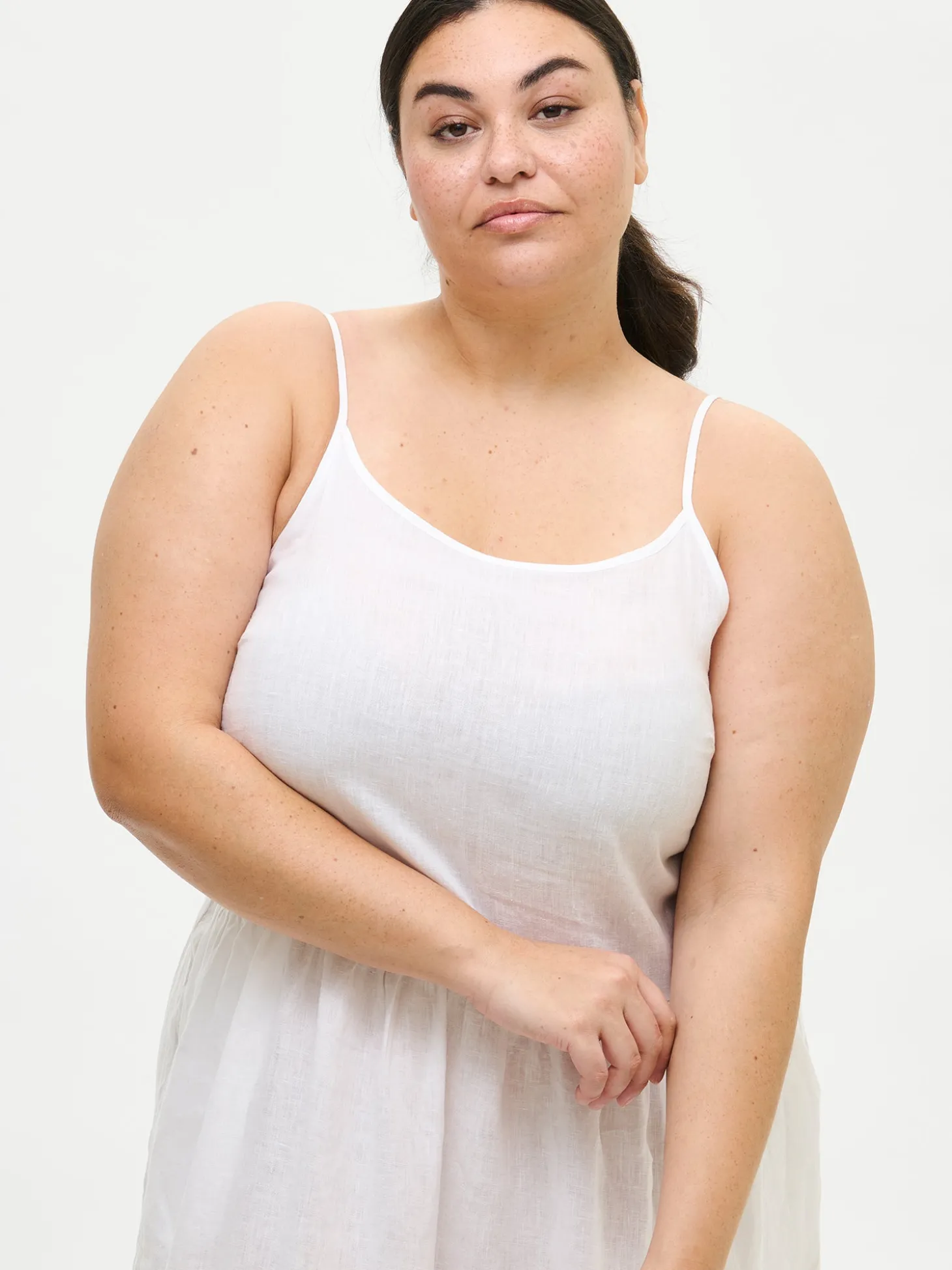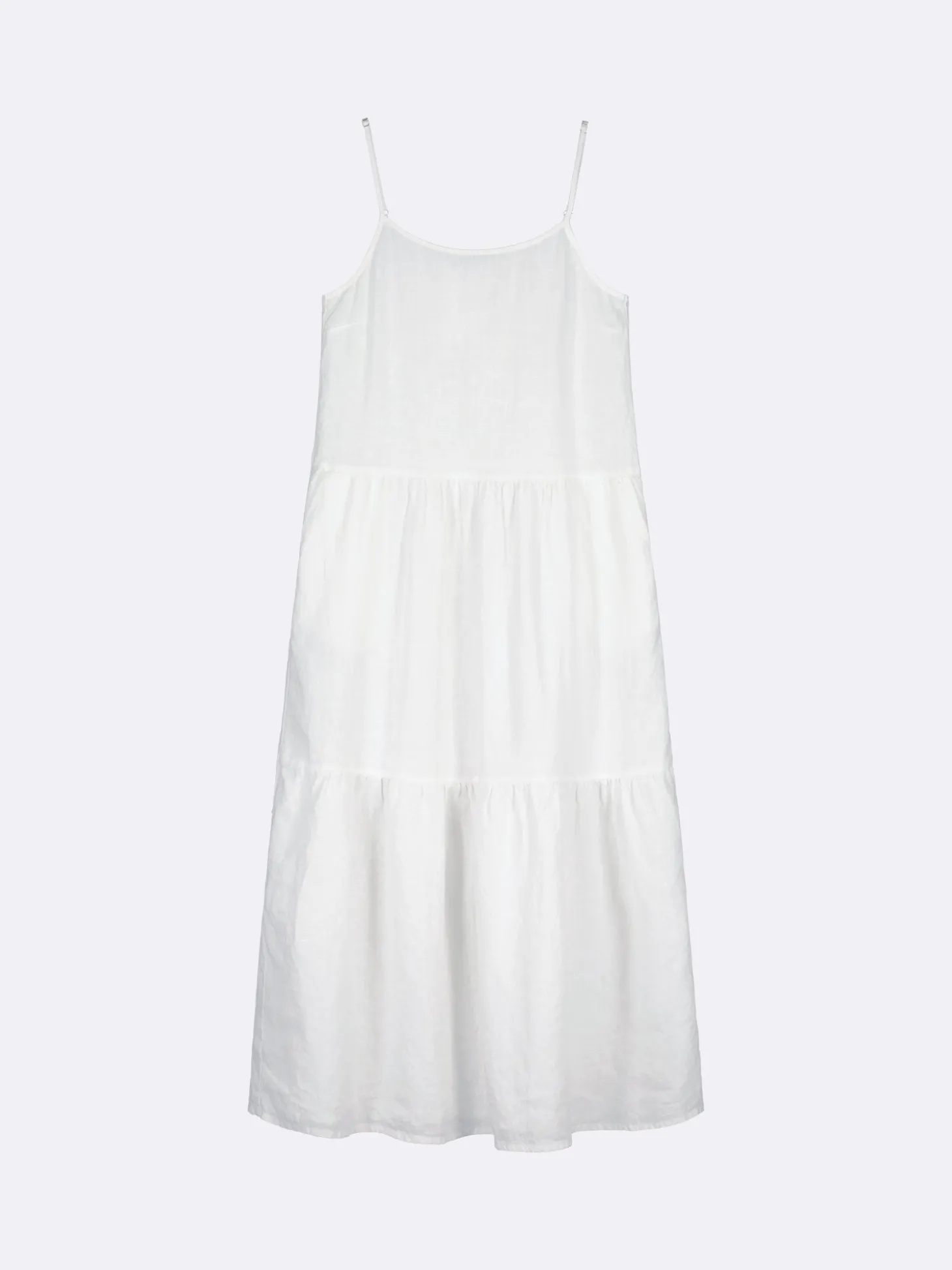 Naisten hihaton valkoinen Pellava-mekko. Kauniissa keveässä pellavamekossa on kapeat säädettävät olkaimet ja mekon runsas helma poimuttuu leikkaussaumoihin. Mekon sivuissa on taskut. Mekon pituus koossa 38 on noin 135 cm. Materiaali on kudottua pellavakangasta, joka on kestävää ja hengittävää. Pellavalle on ominaista luonnollinen pieni rypistyminen.