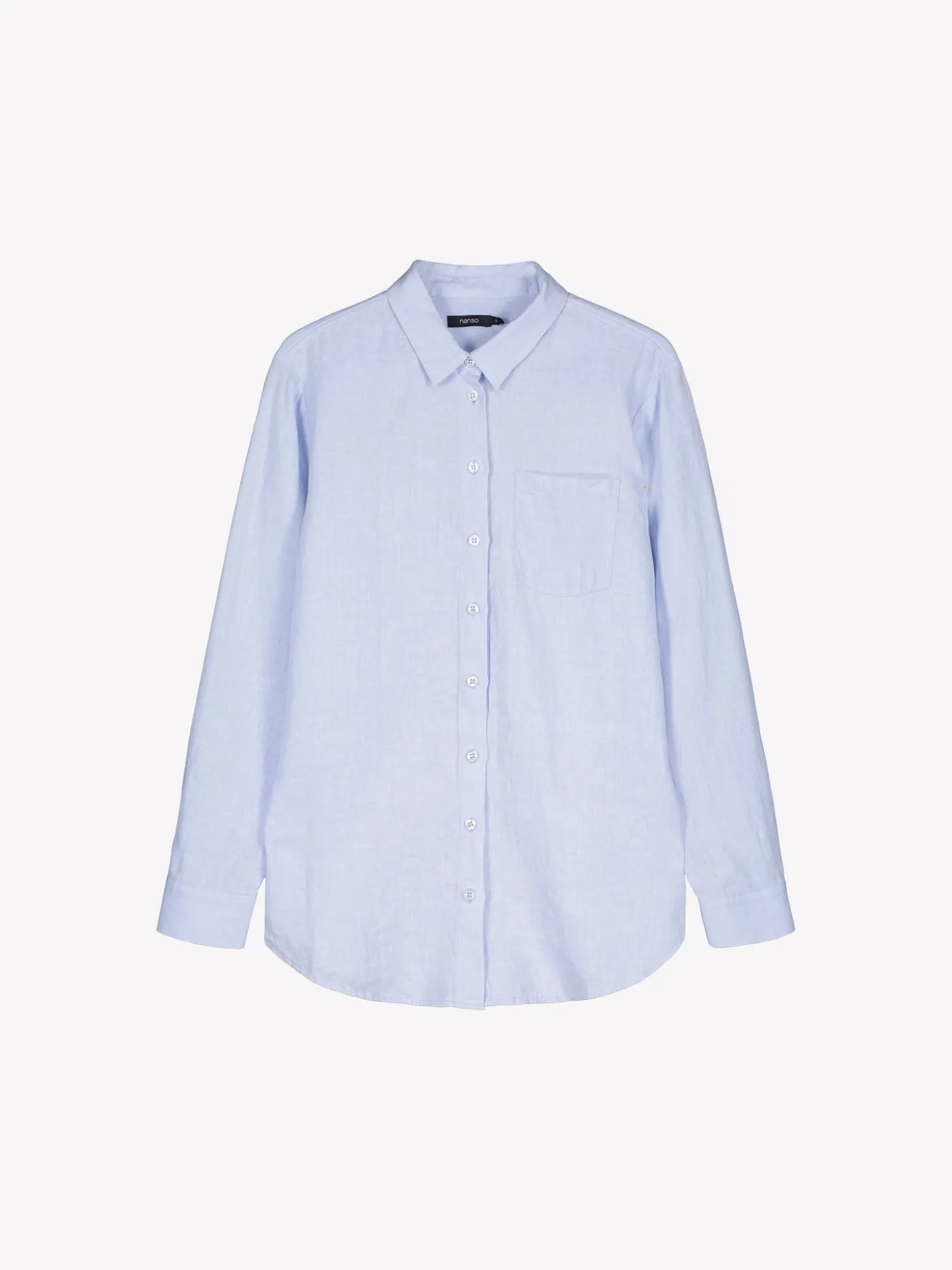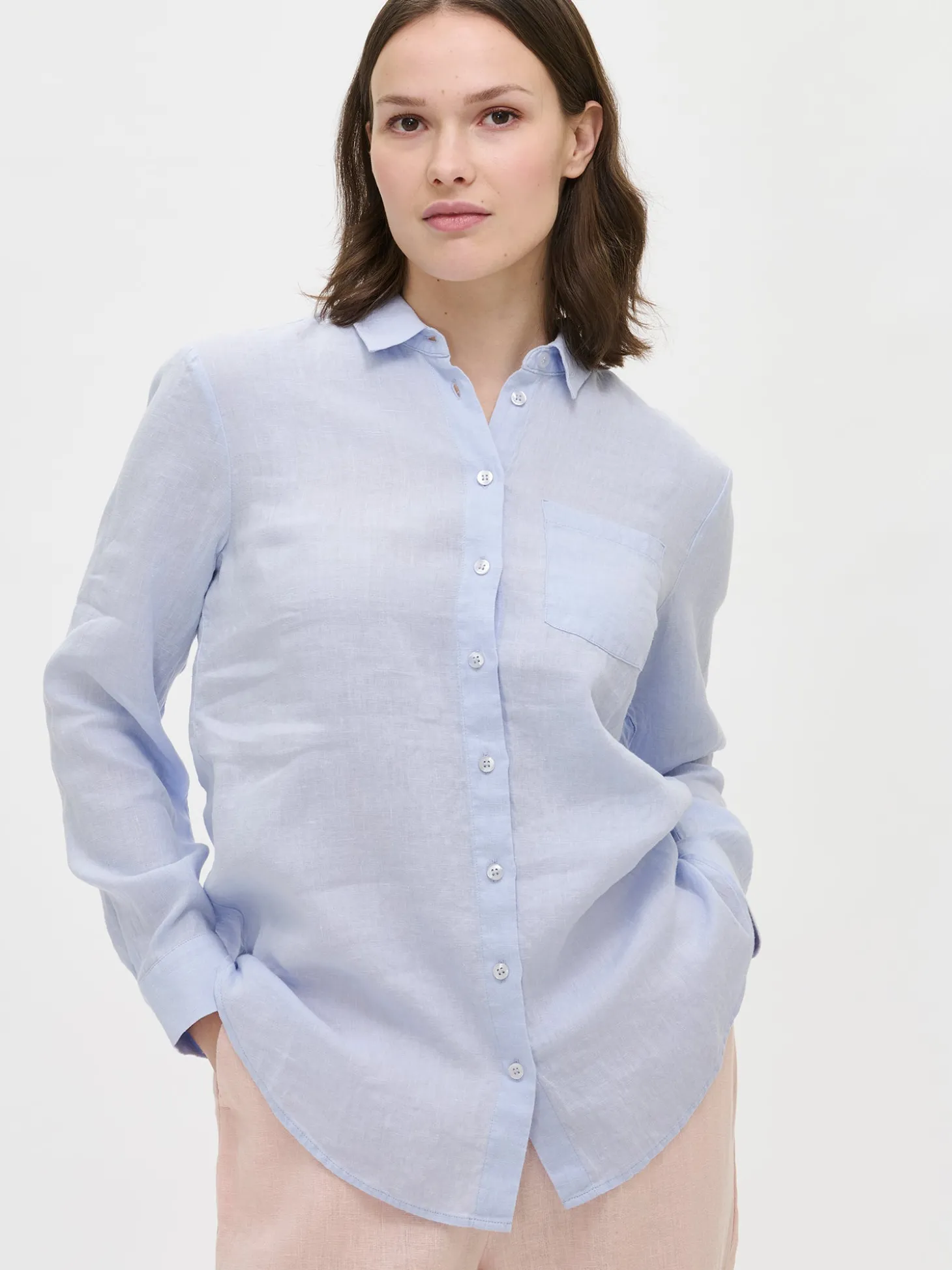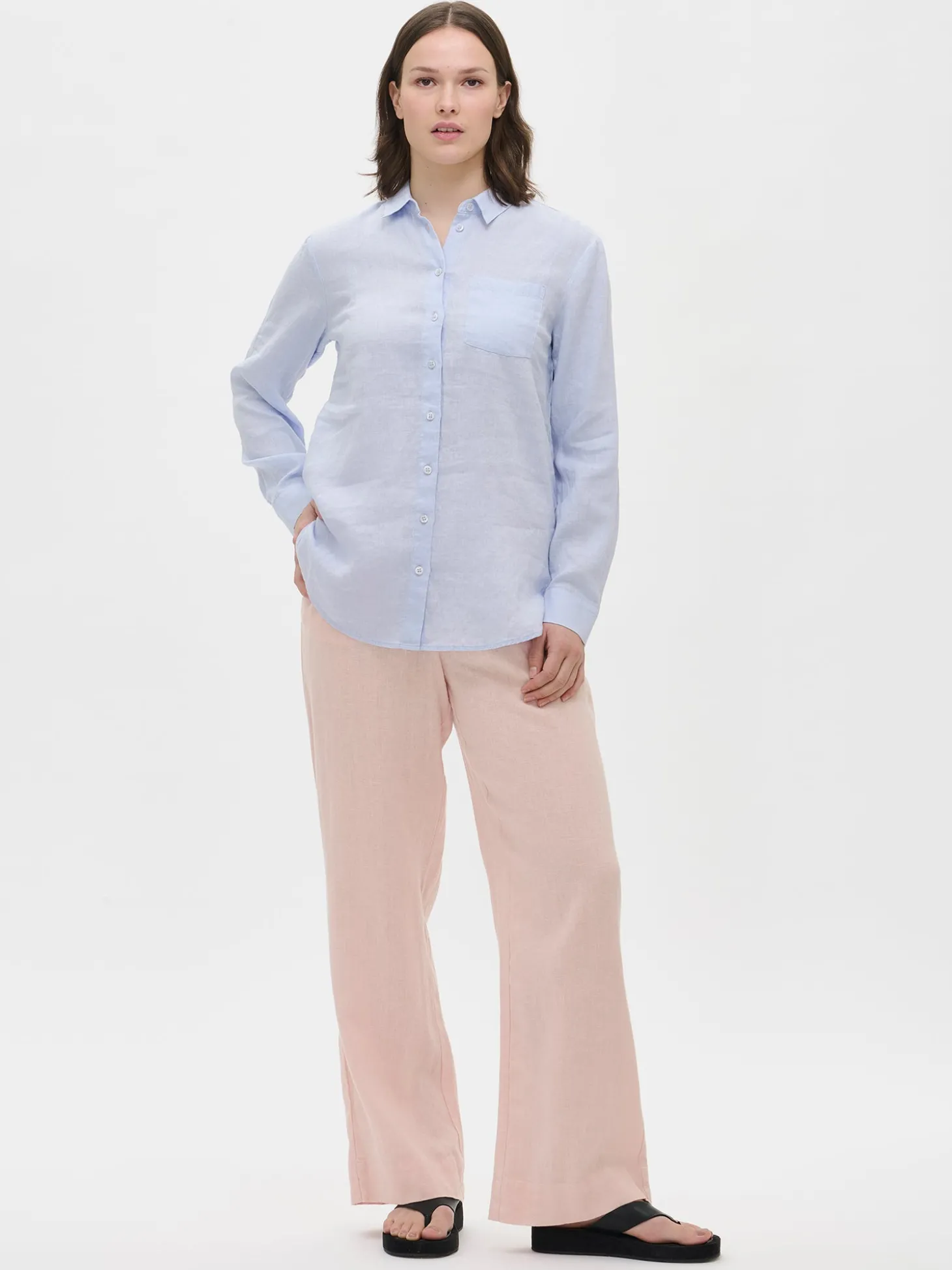 Naisten rento pitkähihainen vaaleansininen Pellava-paitapusero. Klassinen kauluspaita on todellinen vaatekaapin kulmakivi. Ajaton kauluspaita hurmaa monikäyttöisyydellään ja siksi se on varma valinta kerta toisensa jälkeen. Tyylikkäässä pellavapaidassa on napit edessä ja rintatasku. Puseron pituus koossa 38 on noin 75 cm. Materiaali on kudottua pellavakangasta, joka on kestävää ja hengittävää. Pellavalle on ominaista luonnollinen pieni rypistyminen. Tuote on esipesty tuotannossa, joten se ei kutistu ensimmäisessä pesussa.