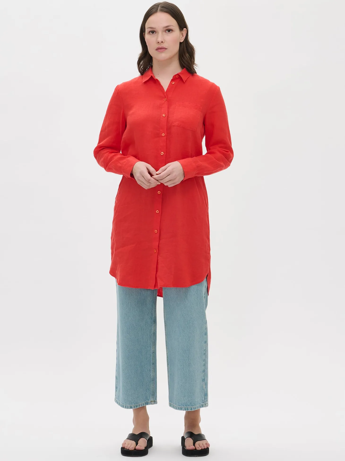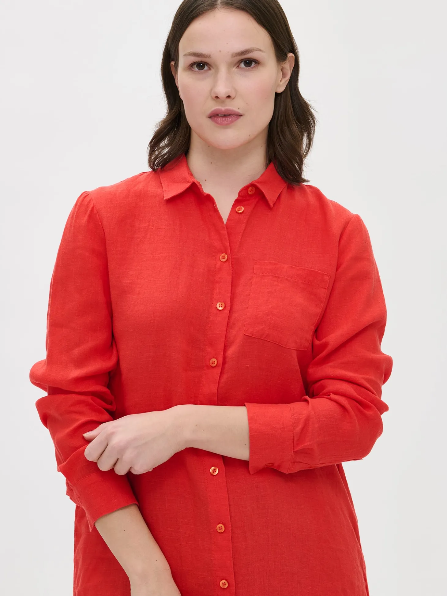 Naisten rento ja pitkä punainen Pellava-paitapusero. Klassinen pitkä kauluspaita sopii niin arkeen kuin juhlaan. Tyylikäs pitkähihainen paitapusero on kesän monipuolinen luottovaate – voit pukea sen sekä mekkona, että pitkänä paitapuserona housujen kanssa. Pellavapuserossa on napit edessä ja rintatasku. Pitkä paidan pituus koossa 38 on noin 95 cm. Materiaali on kudottua pellavakangasta, joka on kestävää ja hengittävää. Pellavalle on ominaista luonnollinen pieni rypistyminen. Tuote on esipesty tuotannossa, joten se ei kutistu ensimmäisessä pesussa.