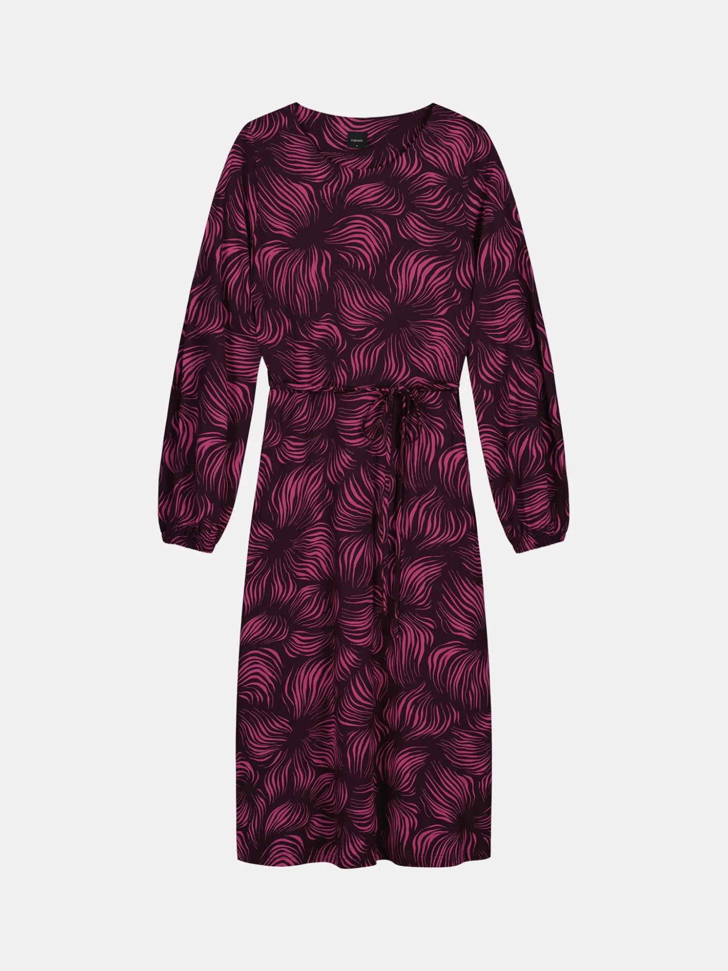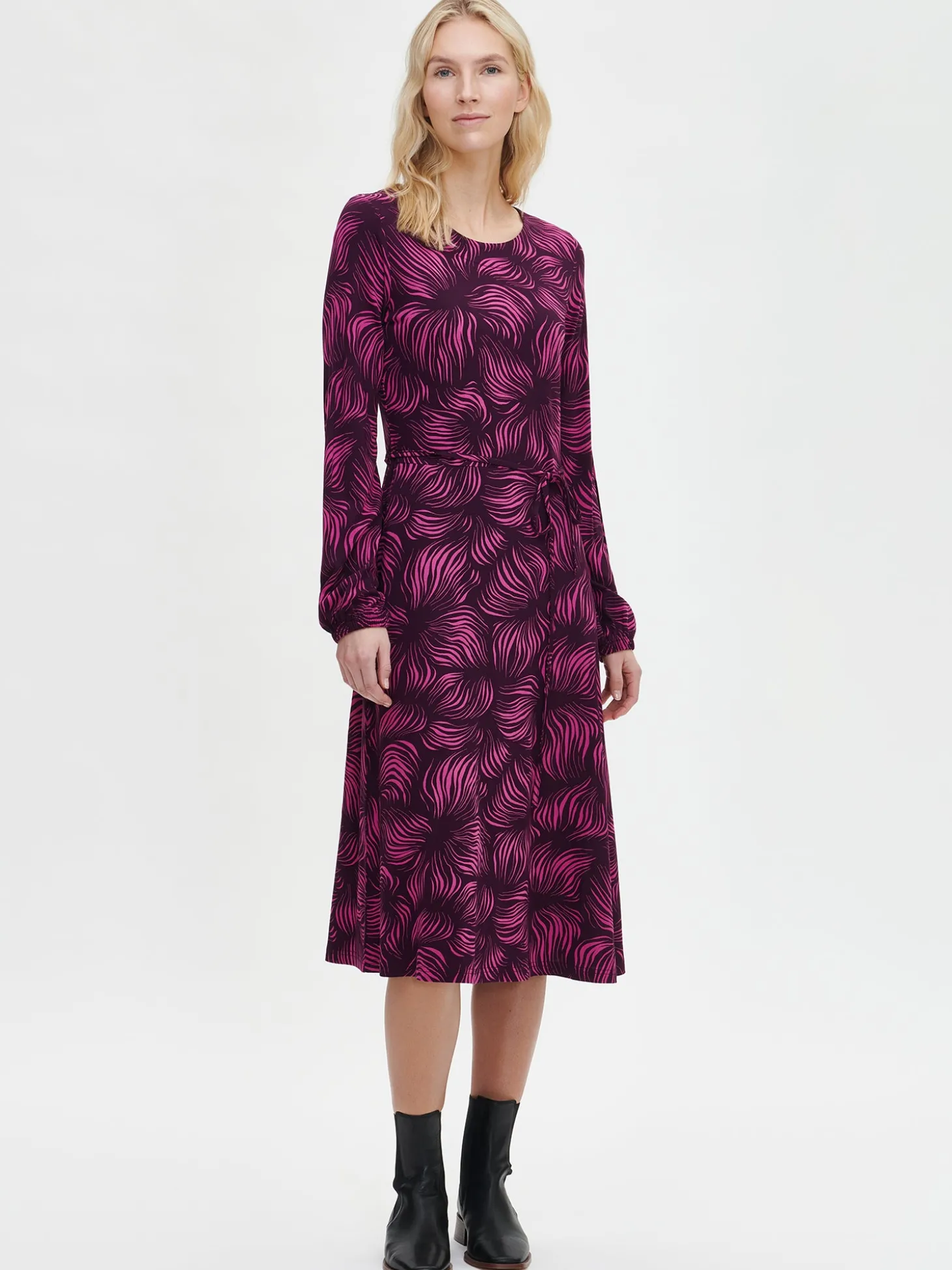Naisten kuosillinen viininpunainen Pieni Tuija-mekko. Mekossa on alavaralla viimeistelty pyöreä pääntie ja sivutaskut. Täyspitkät hihat poimuttuvat kauniisti hihansuiden kuminauhakäänteeseen. Mekon vyötäröllä on poikkisauma, kapea irroitettava vyö ja kellotettu helma. Mekon pituus koossa M on noin 112 cm. Tuote on valmistettu LENZING™ ECOVERO™-viskoosista. Materiaali on laadukasta, miellyttävän tuntuista ja laskeutuvaa viskoosi-elastaani-neulosta, joka pysyy hyvänä pesusta toiseen. Materiaalille on ominaista 3-5% kutistuminen ensimmäisessä pesussa.