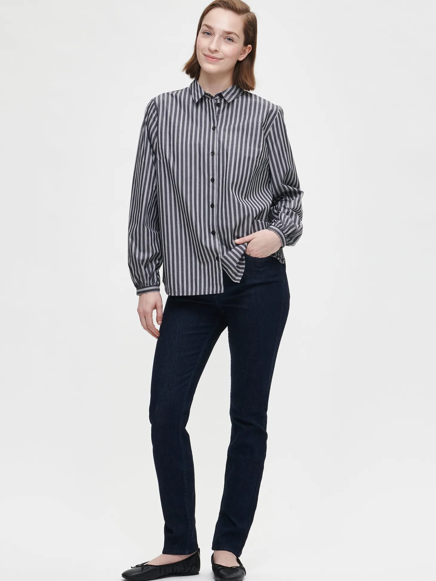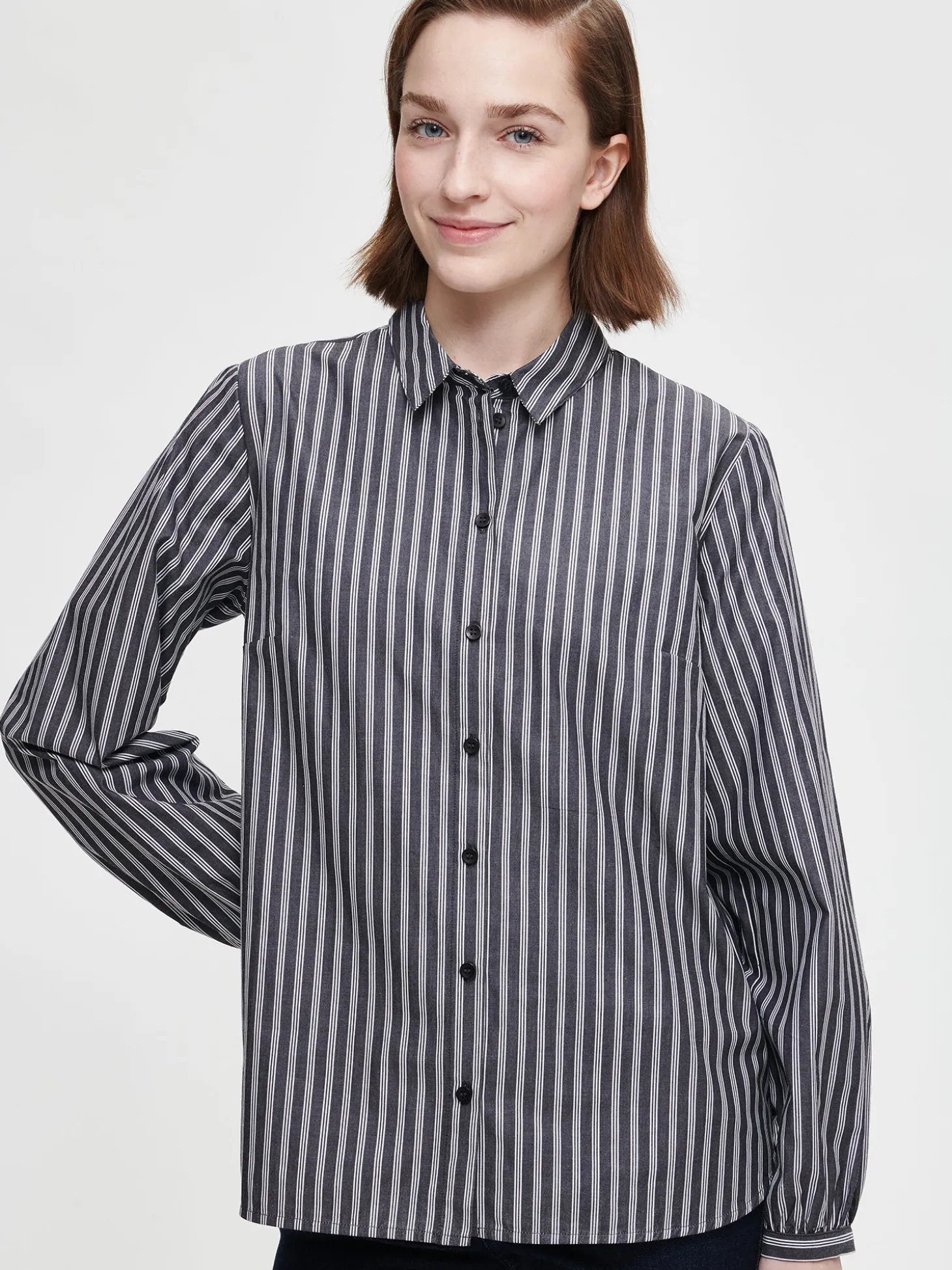 Naisten raidallinen siniharmaa Piirto-paitapusero. Tyylikäs ja ajaton kauluspaita on arjen luottovaate. Paitapuserossa on kaulus, edessä napitus ja rintamuotolaskokset. Hihat ovat täyspitkät ja poimuttuvat kauniisi hihansuun kaitaleen yläpuolella. Hihansuissa on nappihalkiot. Puseron pituus koossa 38 on noin 70 cm. Materiaali on kevyttä kudottua puuvillakangasta.