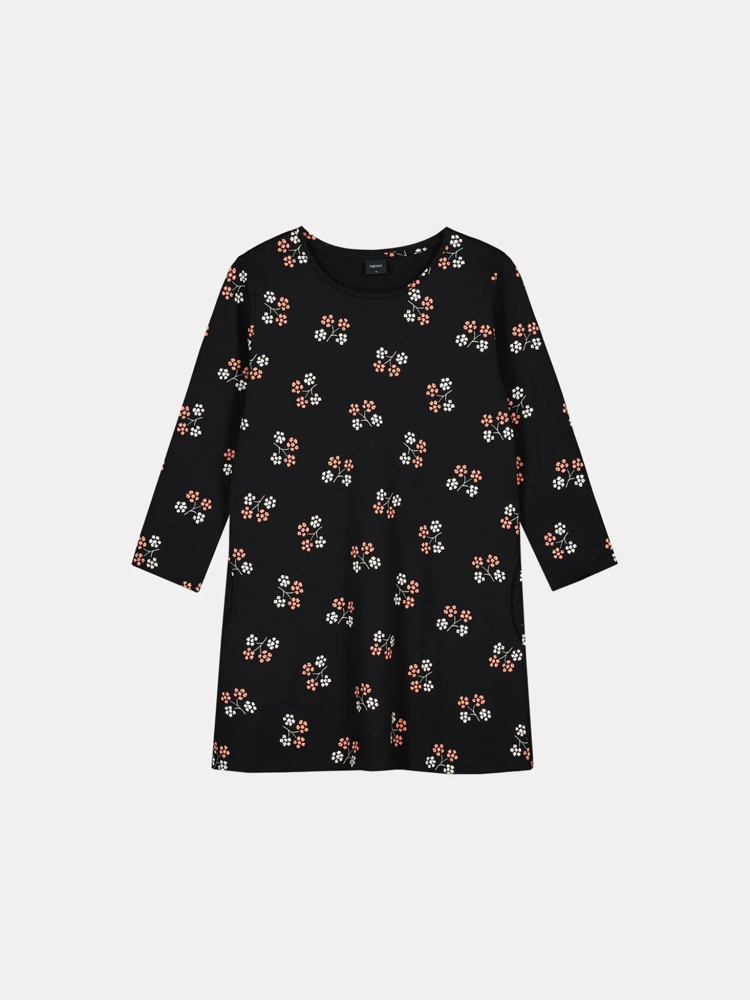 Naisten kuosillinen musta Pikku Cassia-tunika. Kauniissa tunikassa on tereellä viimeistelty pyöreä pääntie, sivuissa taskut ja 3/4 pituiset hihat. Tunikan pituus koossa M on noin 80 cm. Materiaali on miellyttävän tuntuista ja helppohoitoista puuvilla-elastaani-neulosta.