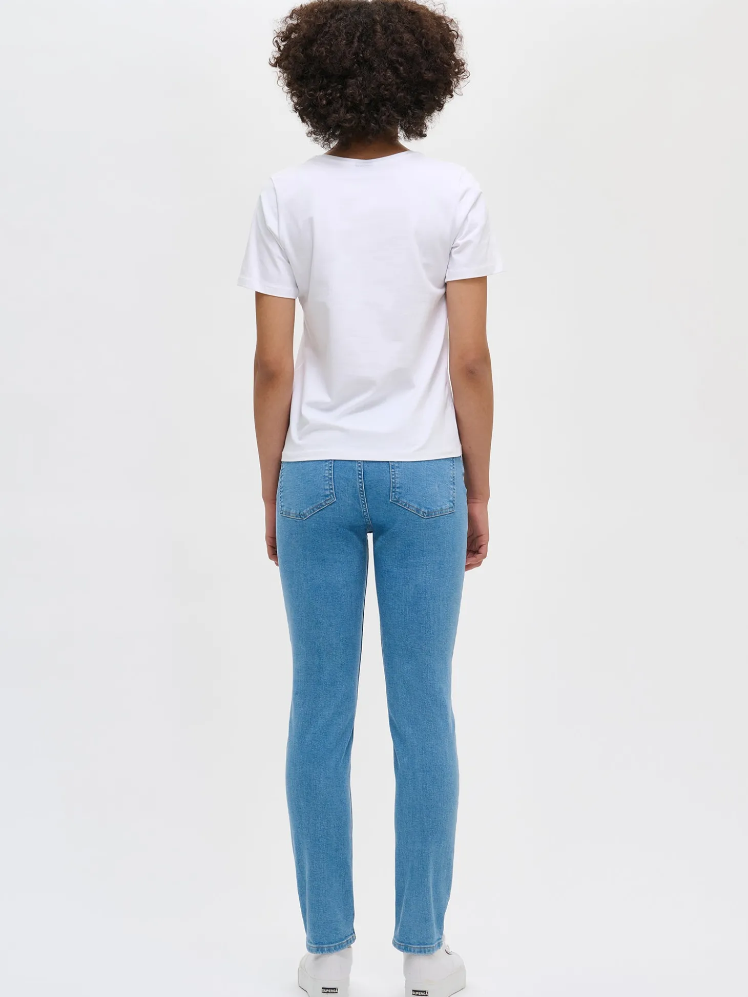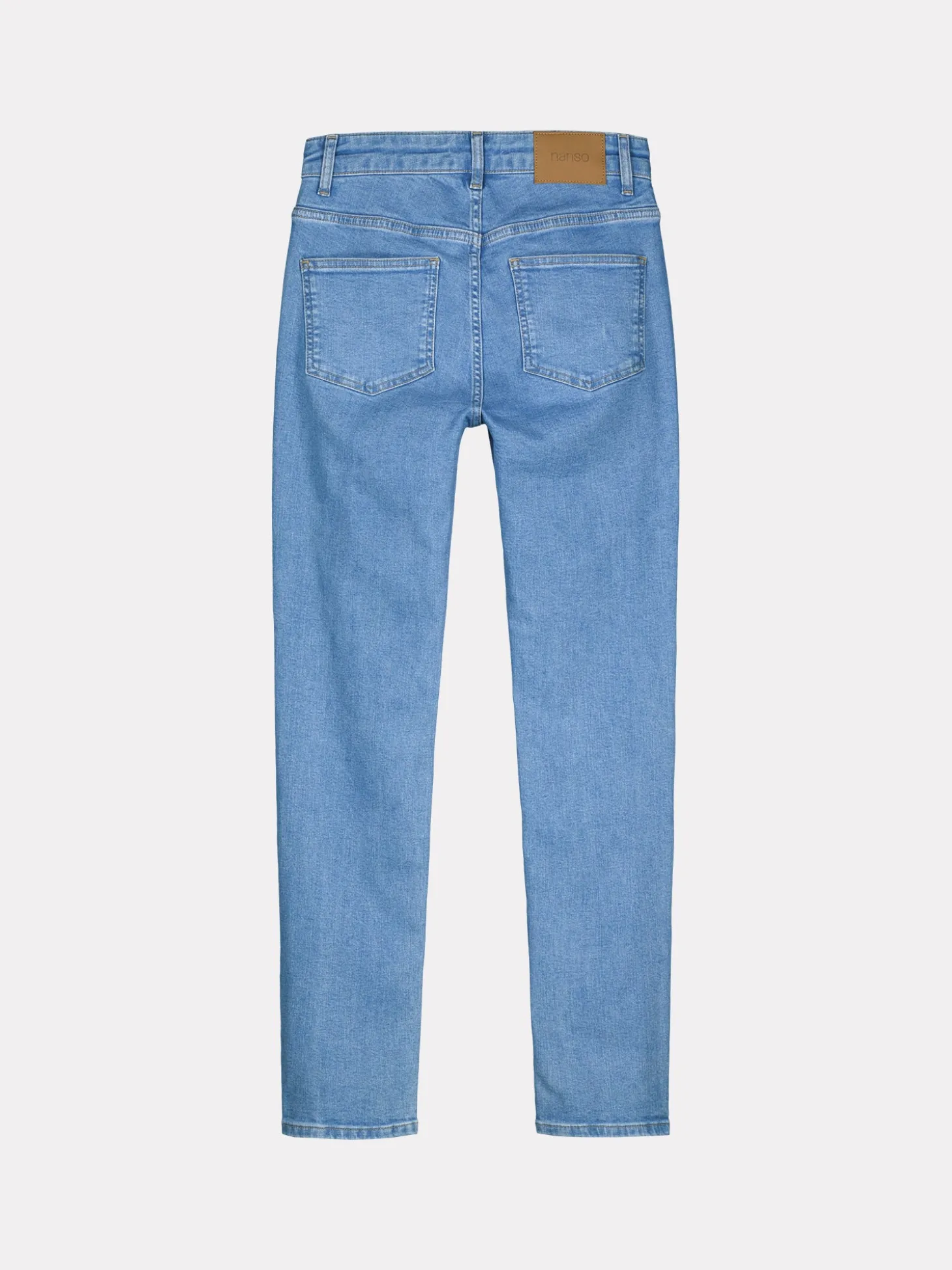Naisten istuvat vaaleansiniset Pilli-farkut, joissa on normaalikorkuinen vyötärö. Tyylikkäät ja mukavat farkut eivät koskaan poistu muodista ja hyvin istuviin farkkuihin haluaa pukeutua aina. Ajattomat Pilli-farkut ovat todellinen vaatekaapin luottovaate. Farkuissa on vyötärökaitale, edessä vetoketju ja nappikiinnitys. Kapeissa farkuissa on taskut edessä sekä takana ja täyspitkät lahkeet. Farkkujen lahkeen sisäpituus koossa 38 on noin 78 cm. Materiaali on kudottua twillsidoksista puuvilla-denimkangasta, johon elastaani tuo joustavuutta ja mukavuutta. 20% kankaaseen käytetystä puuvillasta on kierrätettyä.