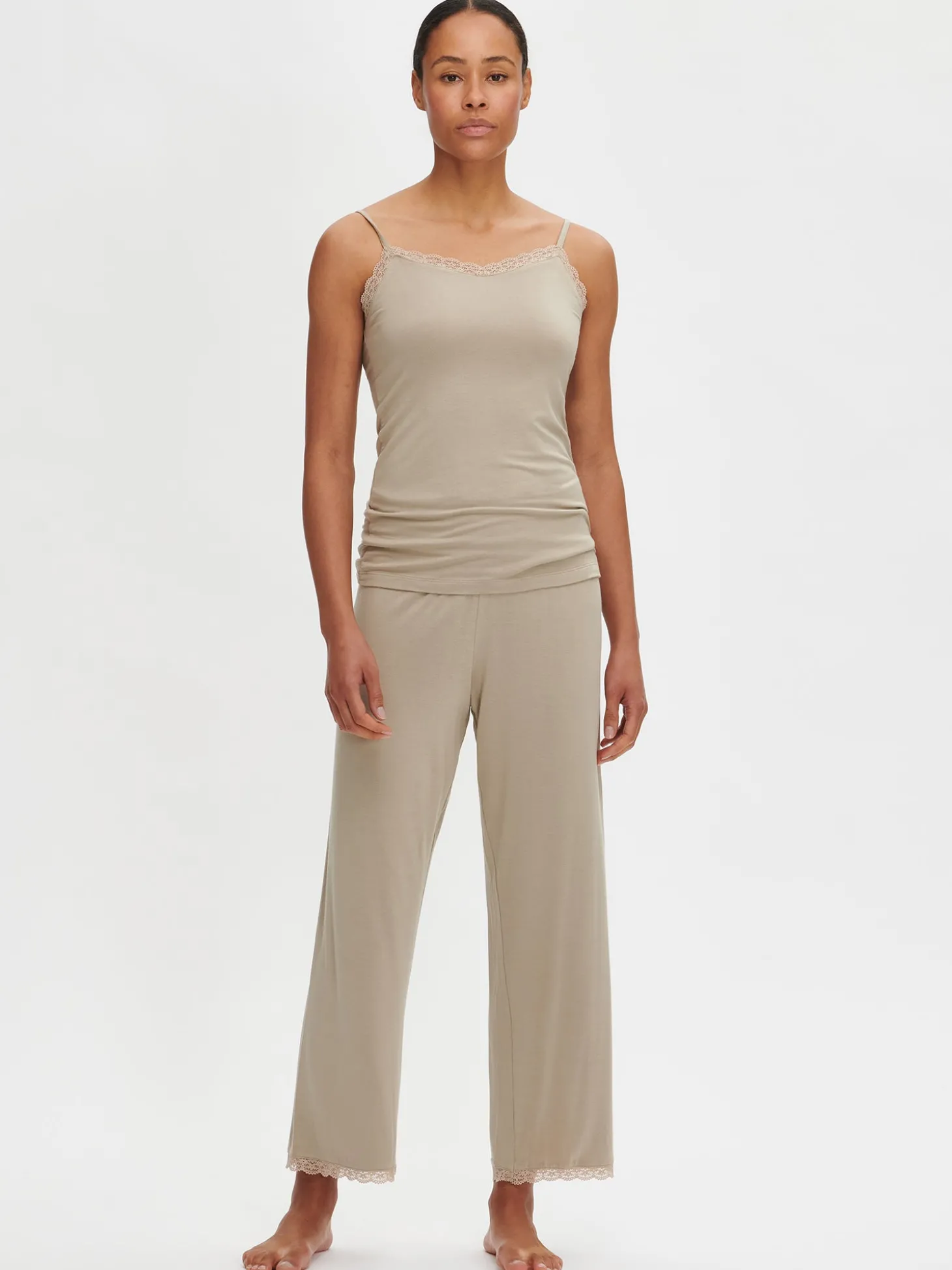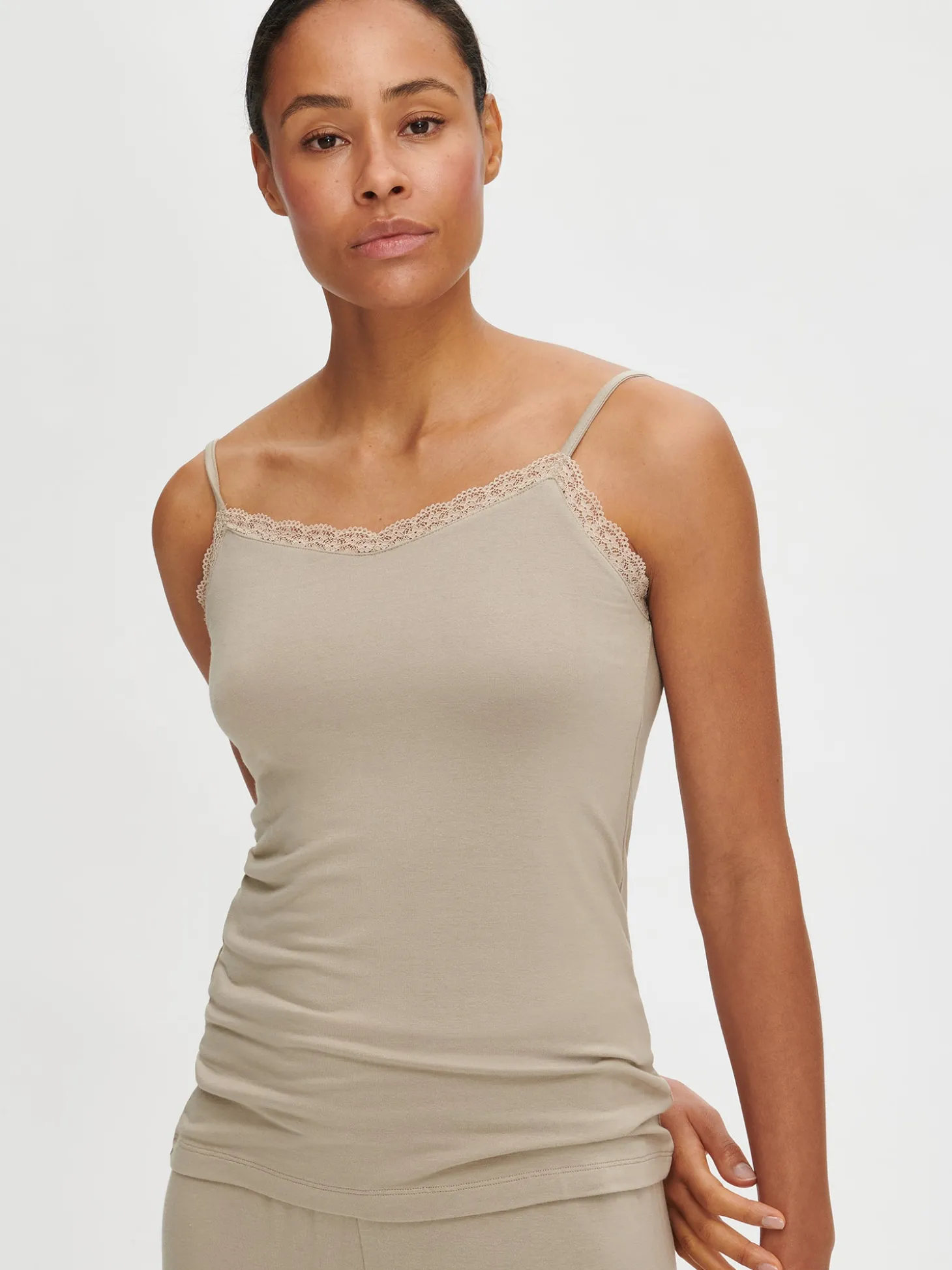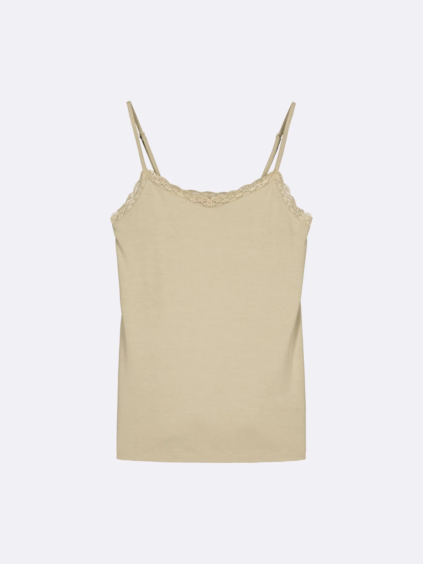 Naisten ylellisen pehmeä ruskea Pitsi-toppi spagettiolkaimilla. Pääntietä koristaa ajaton pitsinauha. Puseron pituus koossa M on noin 62 cm. Materiaali on laadukasta, iholla silkkisen pehmeältä tuntuvaa modaali-elastaania.