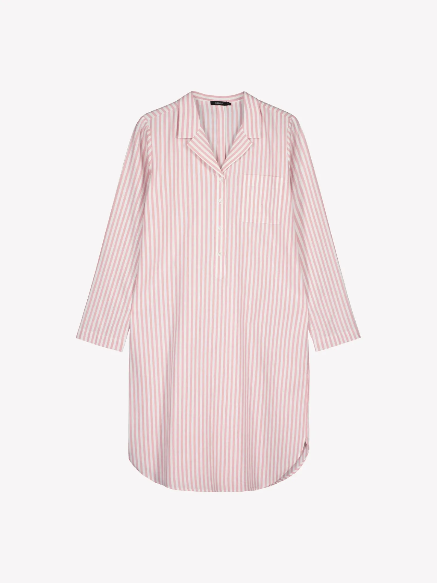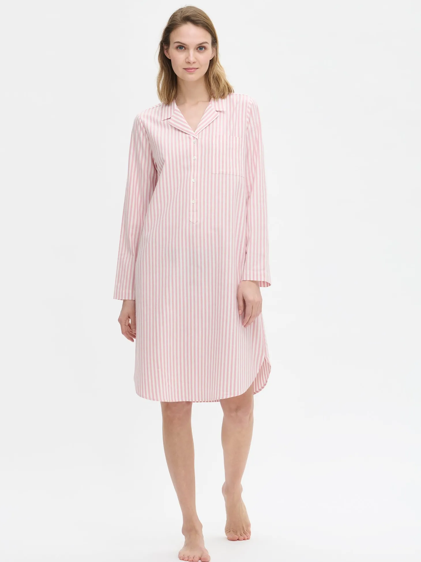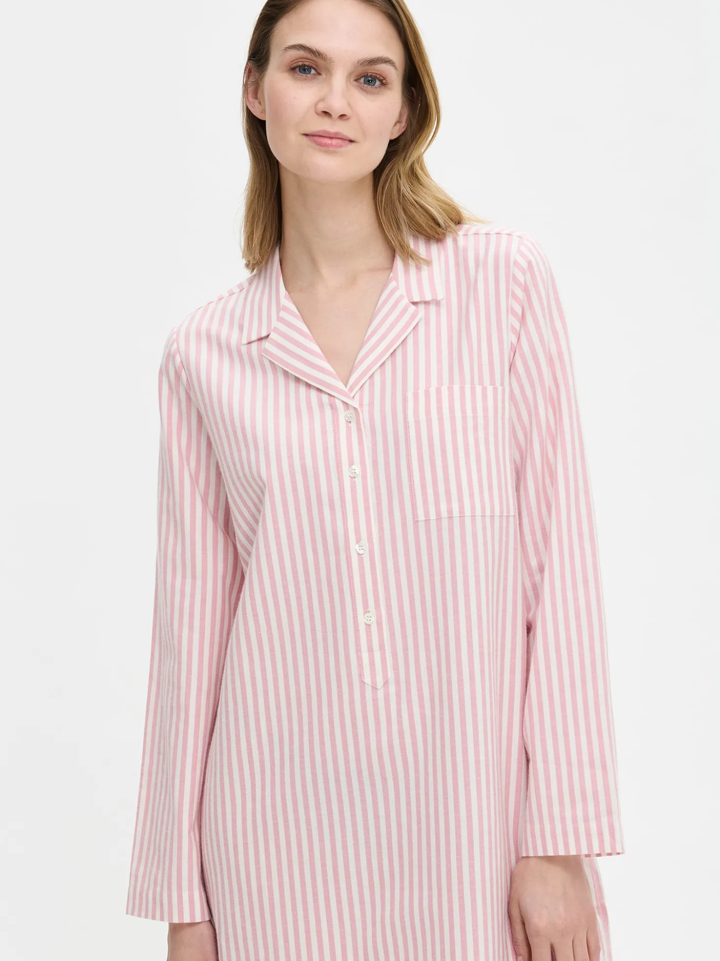Naisten raidallinen Polka-mekko. Pitkähihaisessa mekossa on kauniisti muotoiltu kaulus, nappilista ja pyöristetty helma. Mekon pituus koossa M on noin 105 cm. Materiaali on pehmeää ja miellyttävän tuntuista puuvillaflanellikangasta, joka tekee mekosta ihanan lämpimän ja mukavan arkeen tai rentoihin kotihetkiin.