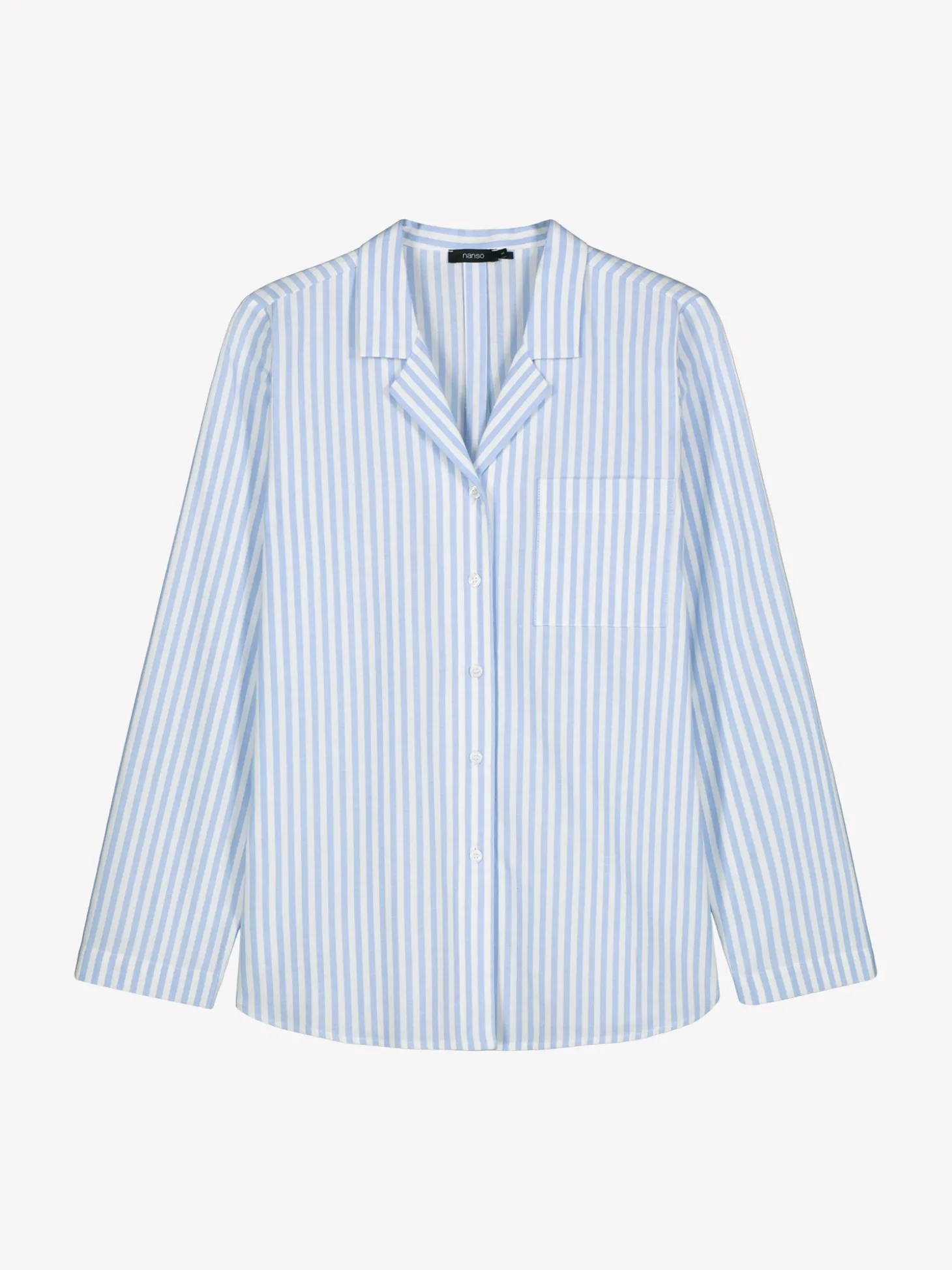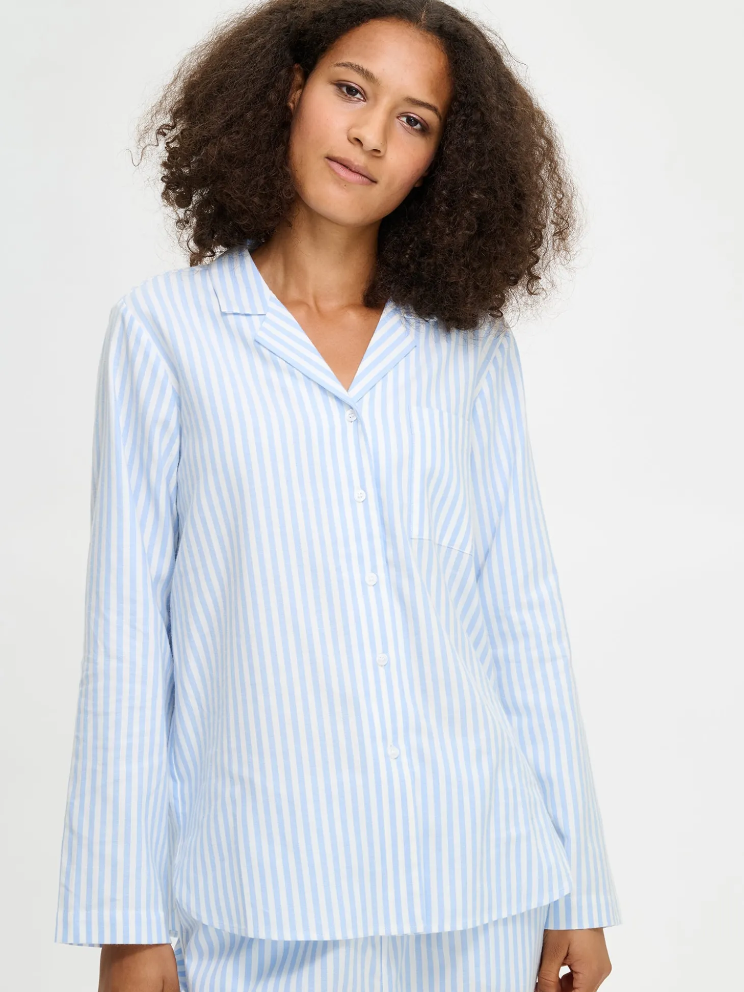 Naisten raidallinen Polka-pyjamapaita vaaleansinisessä värissä. Pitkähihaisessa pyjamapaidassa on kauniisti muotoiltu kaulus, nappilista ja pyöristetty helma. Puseron pituus koossa M on noin 70 cm. Materiaali on pehmeää ja miellyttävän tuntuista puuvillaflanellikangasta. Materiaalille on ominaista 3-5% kutistuminen ensimmäisessä pesussa.