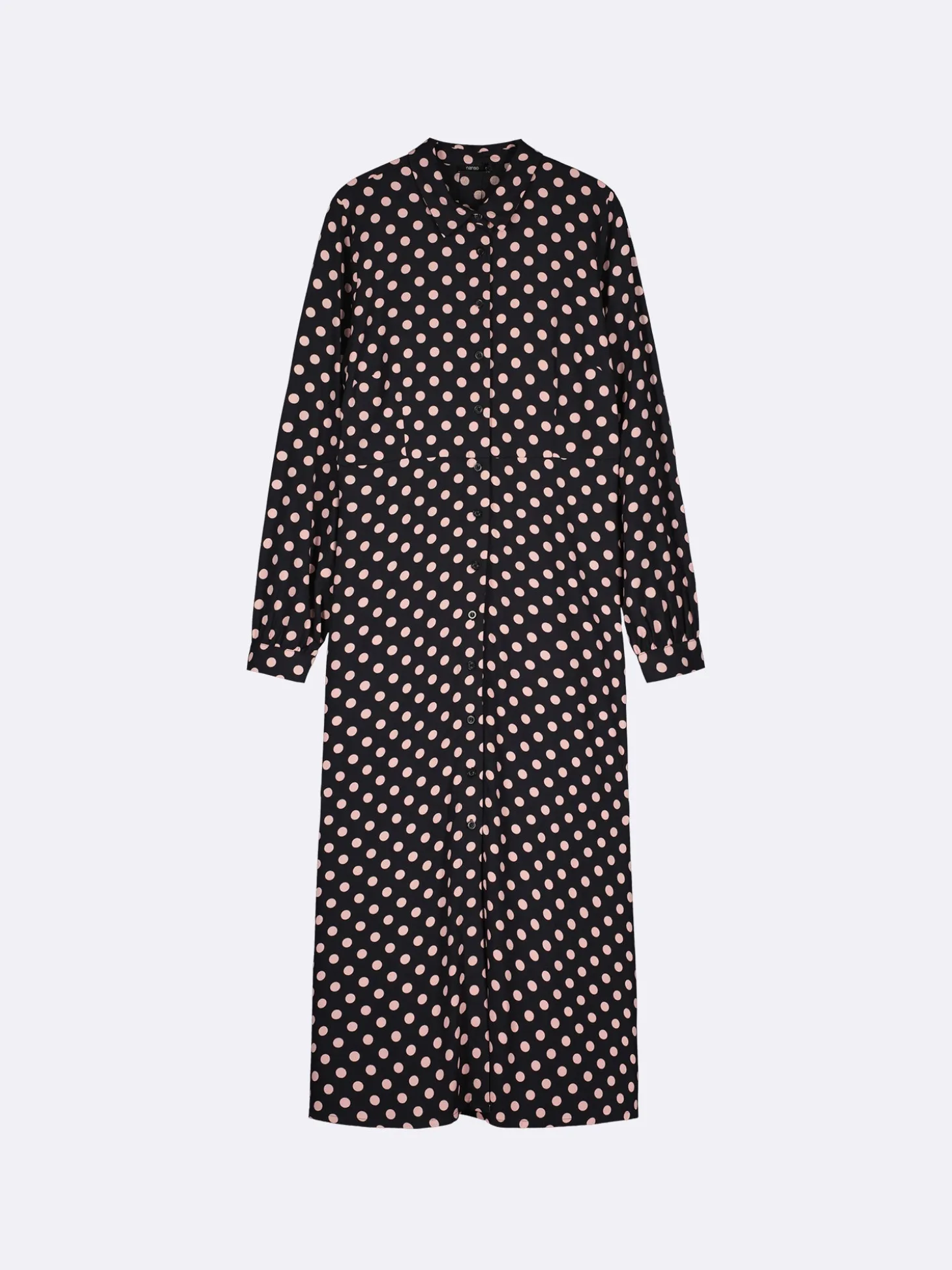 Naisten kuosillinen tummansininen pitkä Polkka-mekko. Yläosastaan istuvassa mekossa on klassiset kaulukset, edessä napitus sekä rintamuotolaskokset ja takana on laskos. Mekossa on leikkaussauma vyötäröllä ja kauniisti kellottuva helma. Täyspitkien hihojen hihansuissa on nappikalvosimet. Mekon pituus koossa 38 on noin 130 cm. Materiaali on kauniisti laskeutuvaa kudottua 100 % viskoosikangasta. Materiaalille on ominaista 3-5% kutistuminen ensimmäisessä pesussa.
