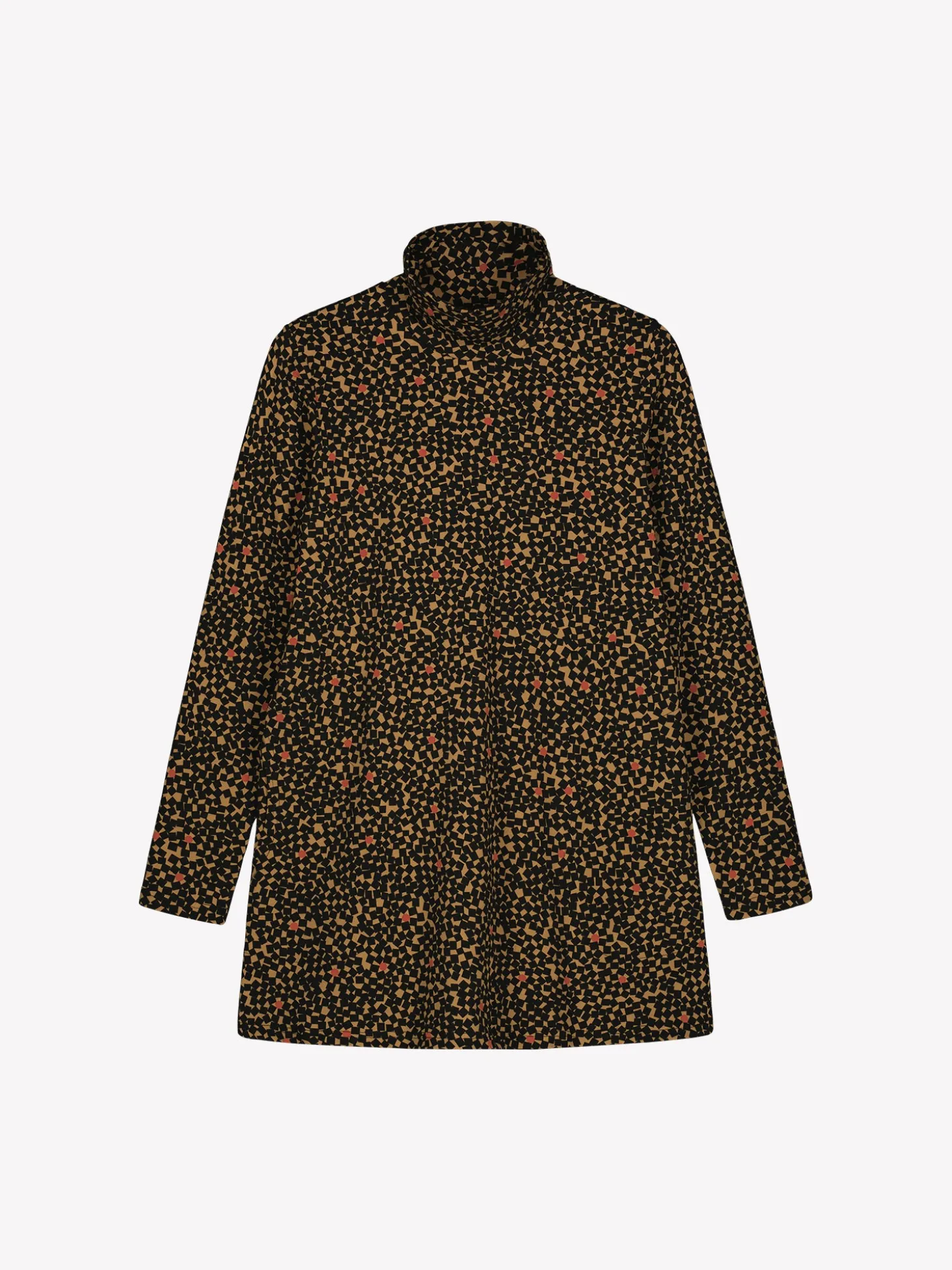 Naisten kuviollinen ruskea Polku-tunika. A-linjaisessa tunikassa on matala poolokaulus, täyspitkät hihat ja sivutaskut. Tunikan pituus koossa M on noin 80 cm. Materiaali on miellyttävän tuntuista ja helppohoitoista puuvilla-elastaani-neulosta.