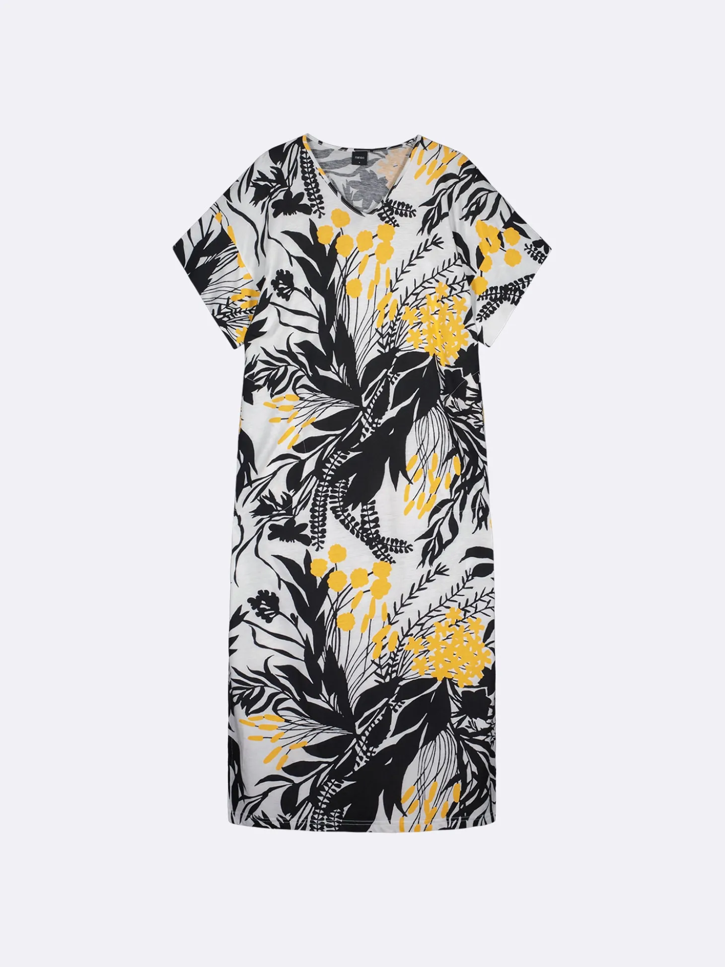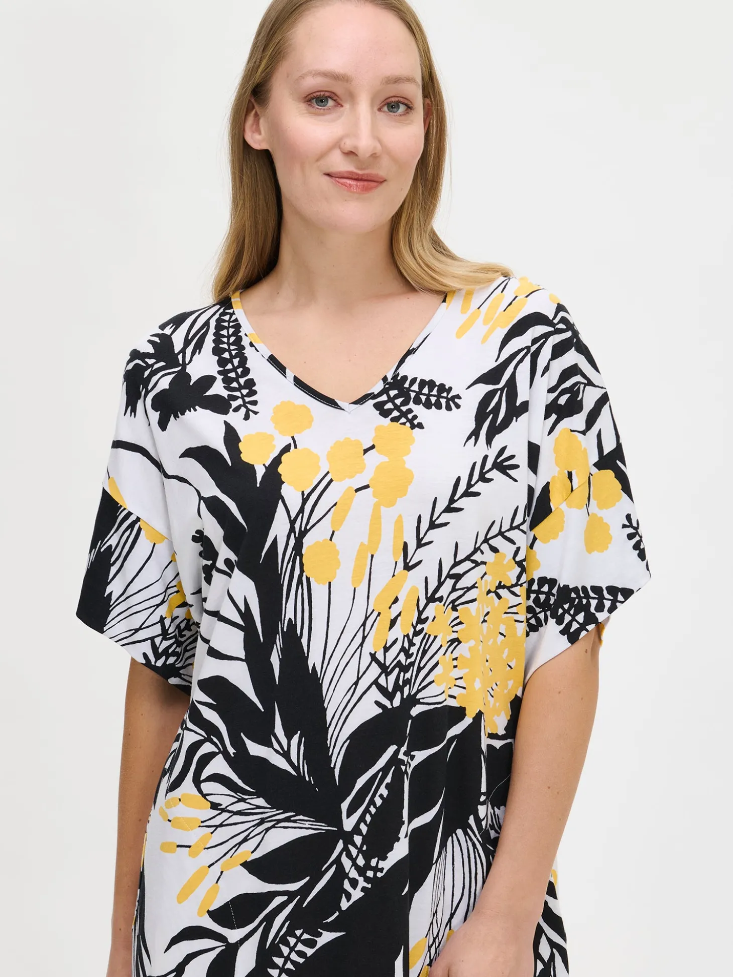 Naisten kuosillinen keltainen Puutarha-kaftaani V-pääntiellä. Kaftaanissa on sivutaskut ja sivuhalkiot. Lyhythihaisen kaftaanin pituus koossa M on noin 130 cm. Materiaali on laadukasta, iholla miellyttävän pehmeältä tuntuvaa ja helppohoitoista puuvilla-modaalia, joka pysyy hyvänä pesusta toiseen. Kaftaanissa on kaunis kuvio, joka tuo kesäistä raikkautta ja tyyliä.