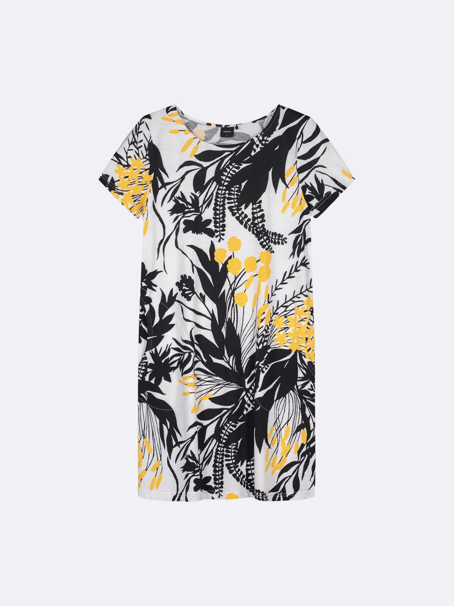 Naisten kuosillinen keltainen Puutarha-yöpaita lyhyillä hihoilla, sivutaskuilla ja ovaalilla pääntiellä. Yöpaidan pituus koossa M on noin 95 cm. Materiaali on laadukasta, iholla miellyttävän pehmeältä tuntuvaa ja helppohoitoista puuvilla-modaalia, joka pysyy hyvänä pesusta toiseen. Tämä kaunis kuosi tuo raikkautta ja tyyliä jokaiseen yöhön, täydellinen valinta rentoihin ja huolettomiin hetkiin kotona.