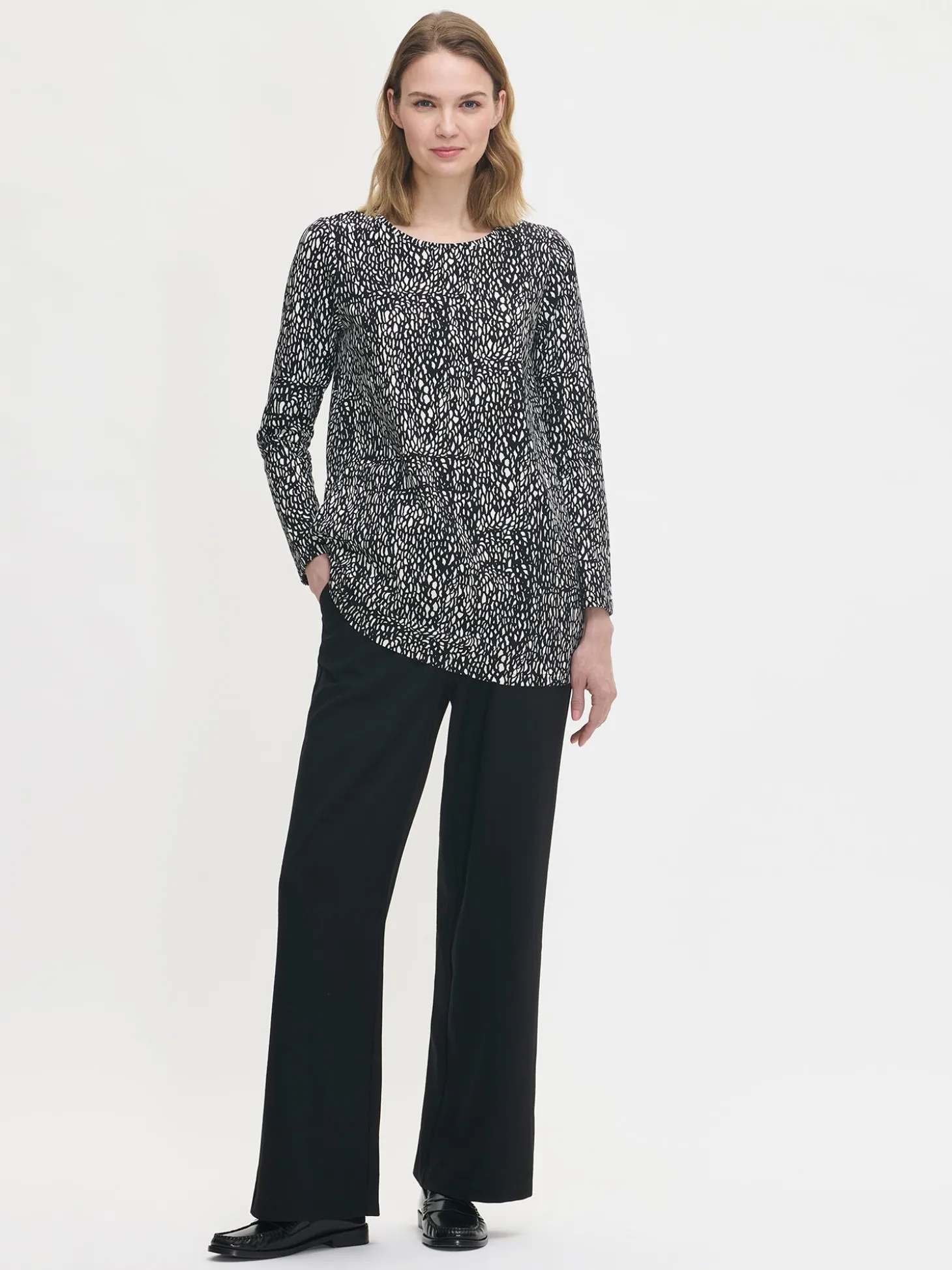 Naisten kuosillinen mustavalkoinen Raku-tunika. Tunikassa on pyöreä tereellä viimeistelty pääntie, sivuissa taskut ja täyspitkät hihat. Tunikan pituus koossa M on noin 80 cm. Materiaali on miellyttävän tuntuista ja helppohoitoista puuvilla-elastaani-neulosta.