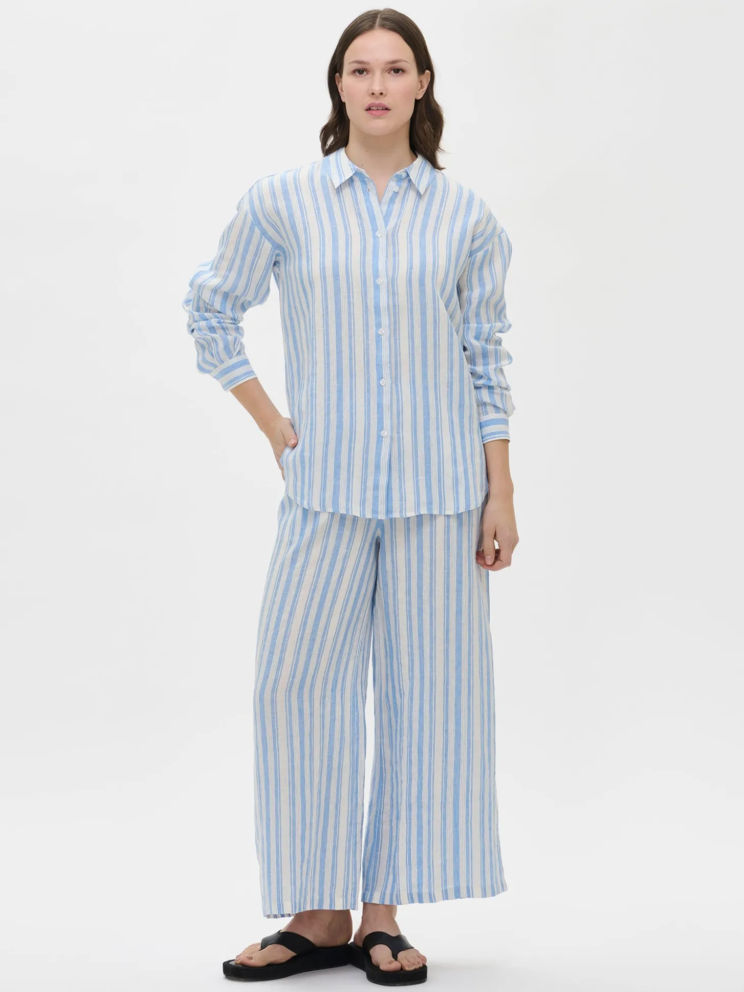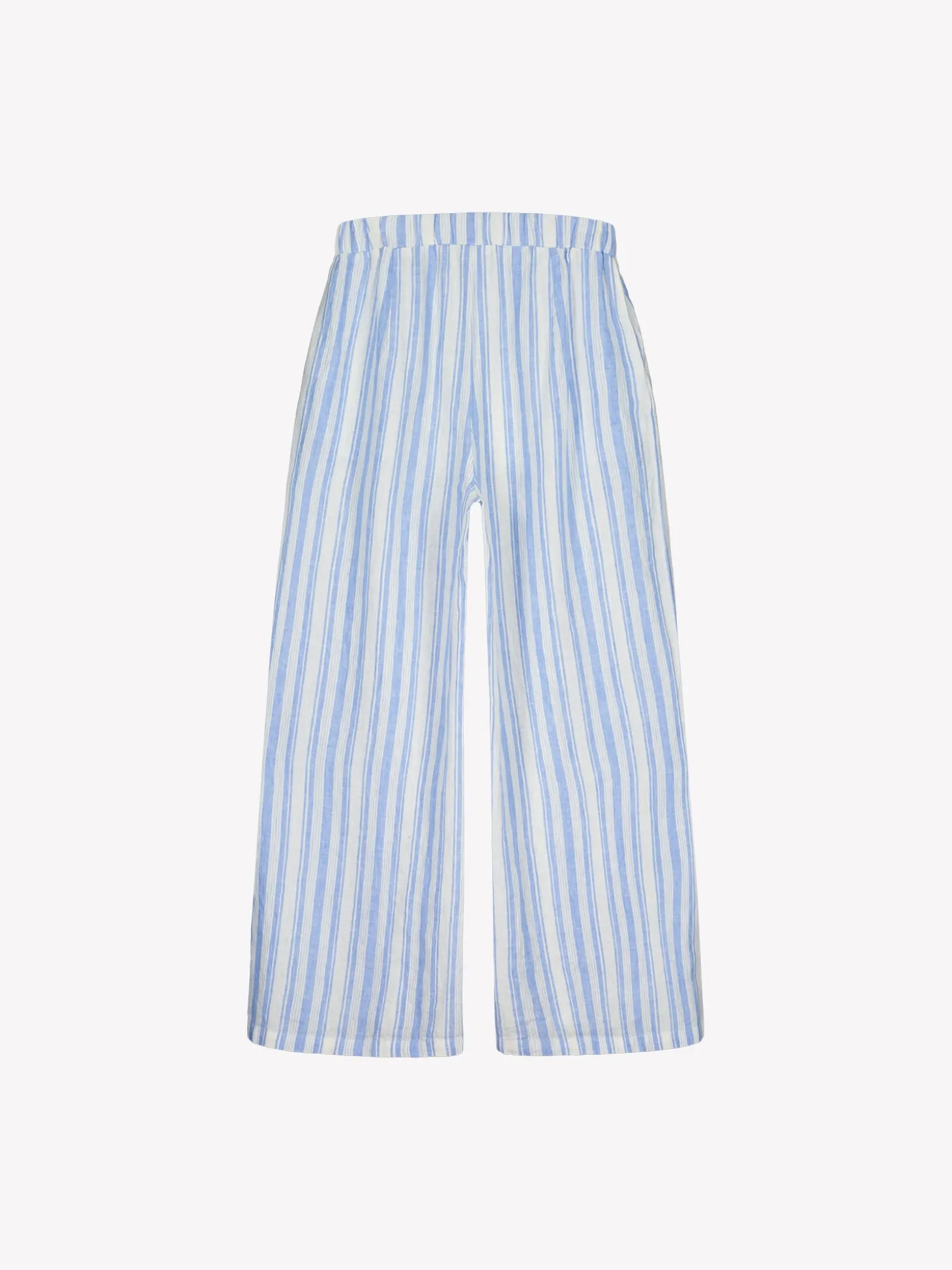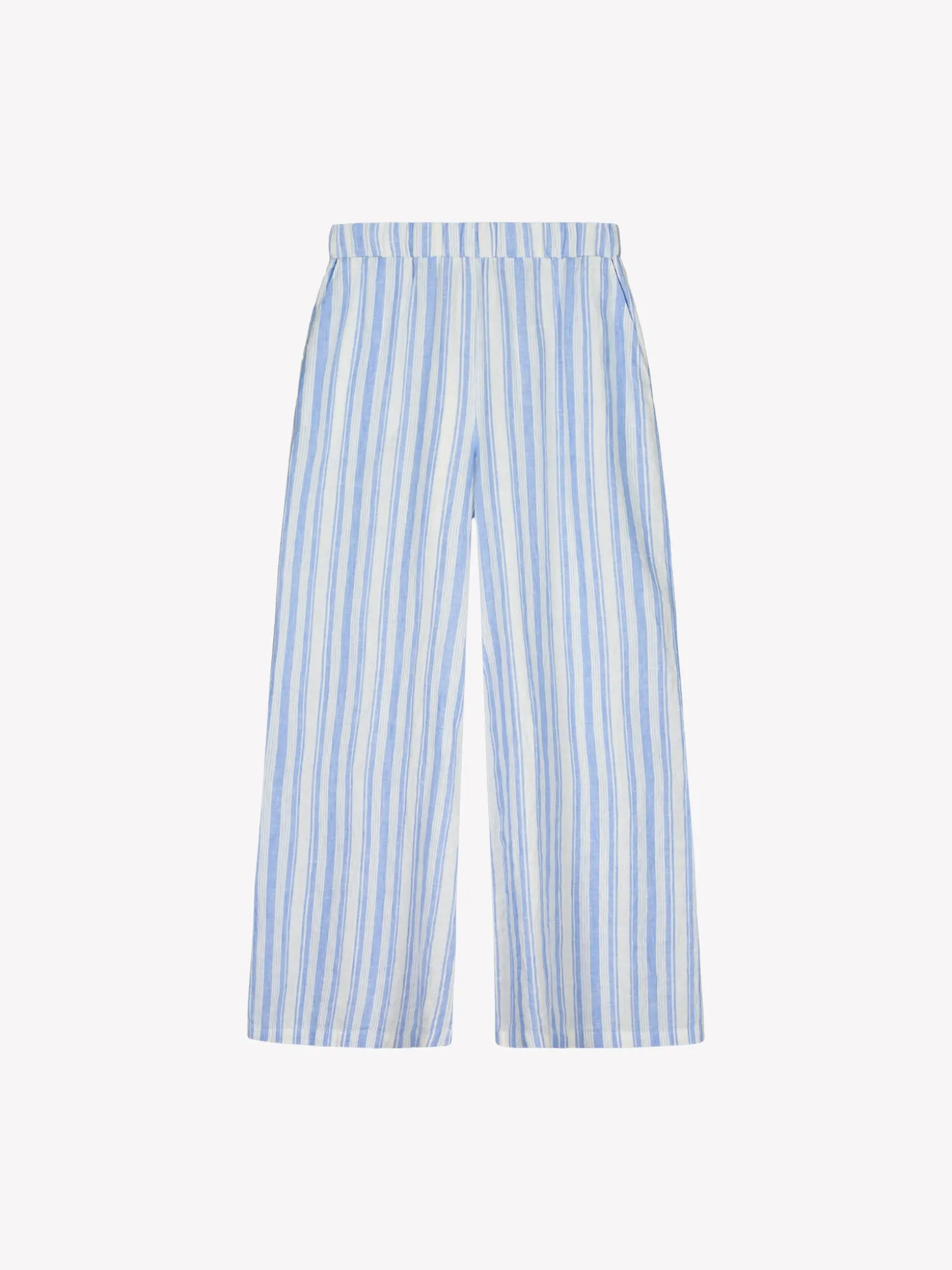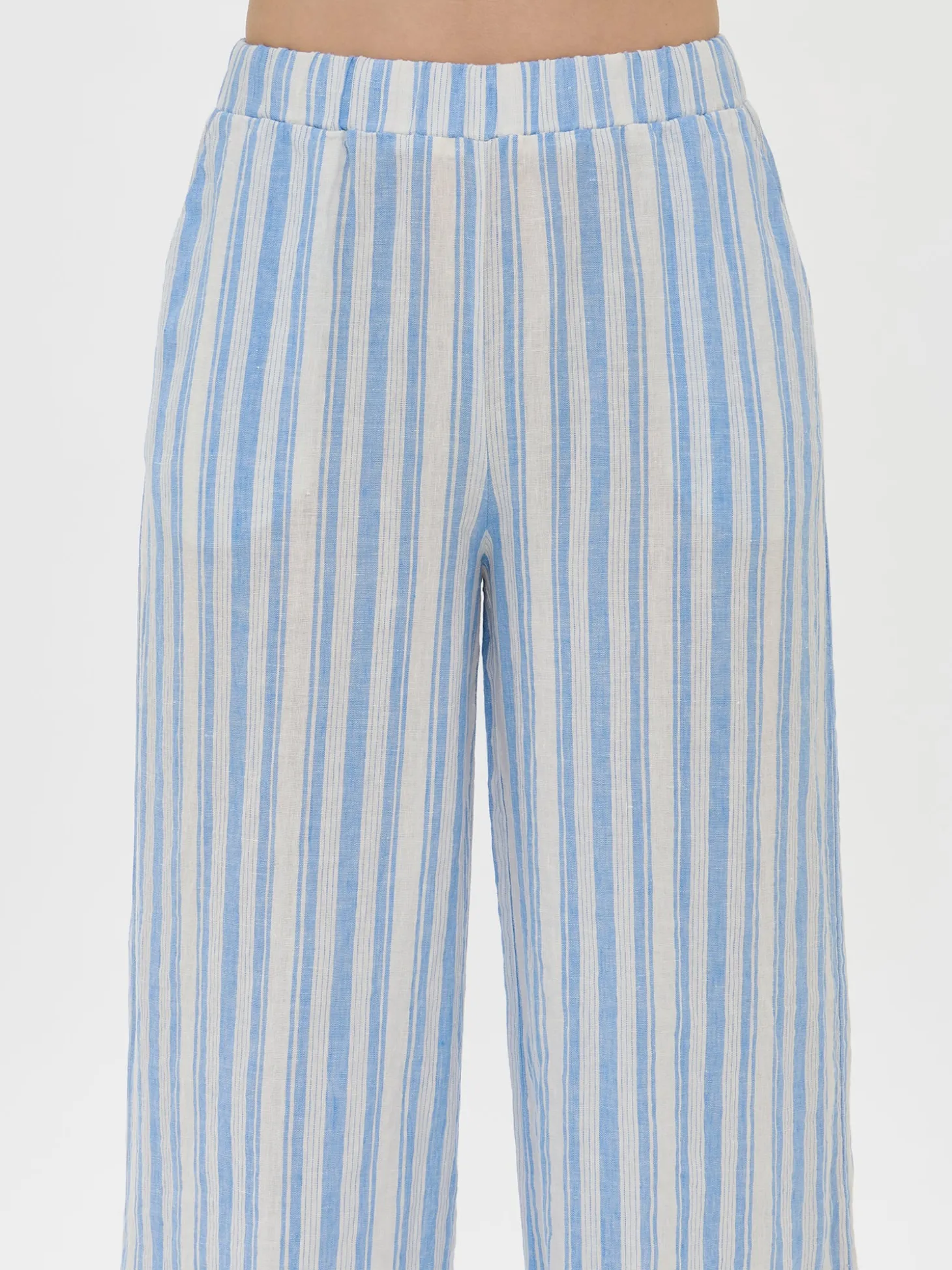 Naisten raidalliset vaaleansiniset Regatta-pellavahousut. Housuissa on leveät lahkeet, sivuissa taskut ja joustava vyötärö. Housut ovat 7/8 pituiset ja lahkeen sisäpituus koossa 38 on noin 67 cm. Materiaali kudottua pellavakangasta, joka on kestävää ja hengittävää. Pellavalle on ominaista luonnollinen pieni rypistyminen. Tuote on esipesty tuotannossa, joten se ei kutistu ensimmäisessä pesussa.
