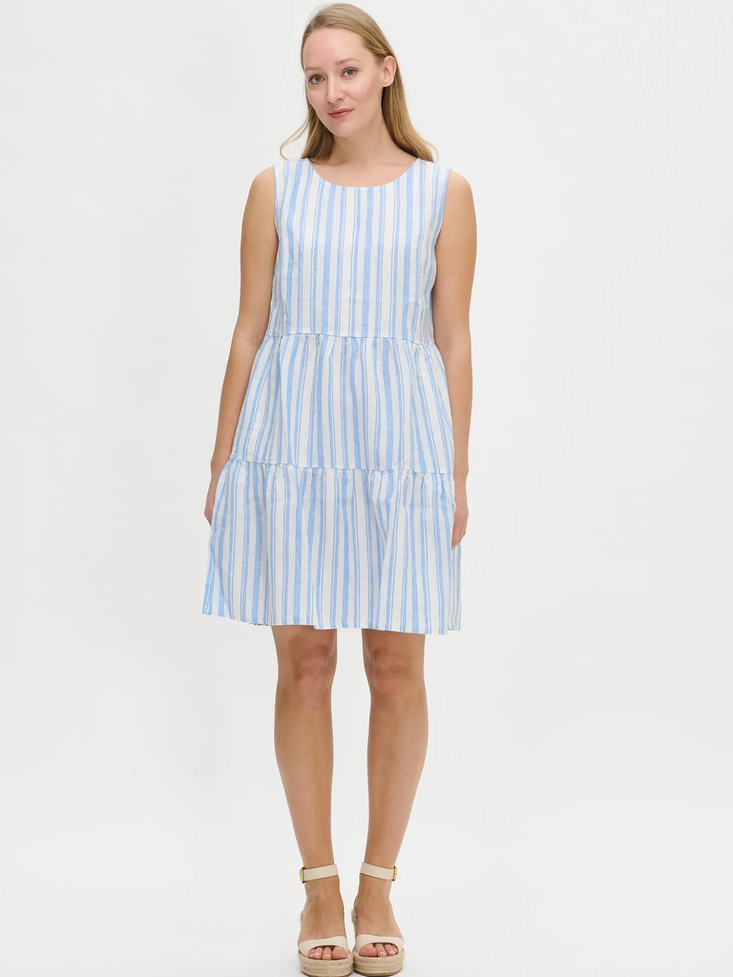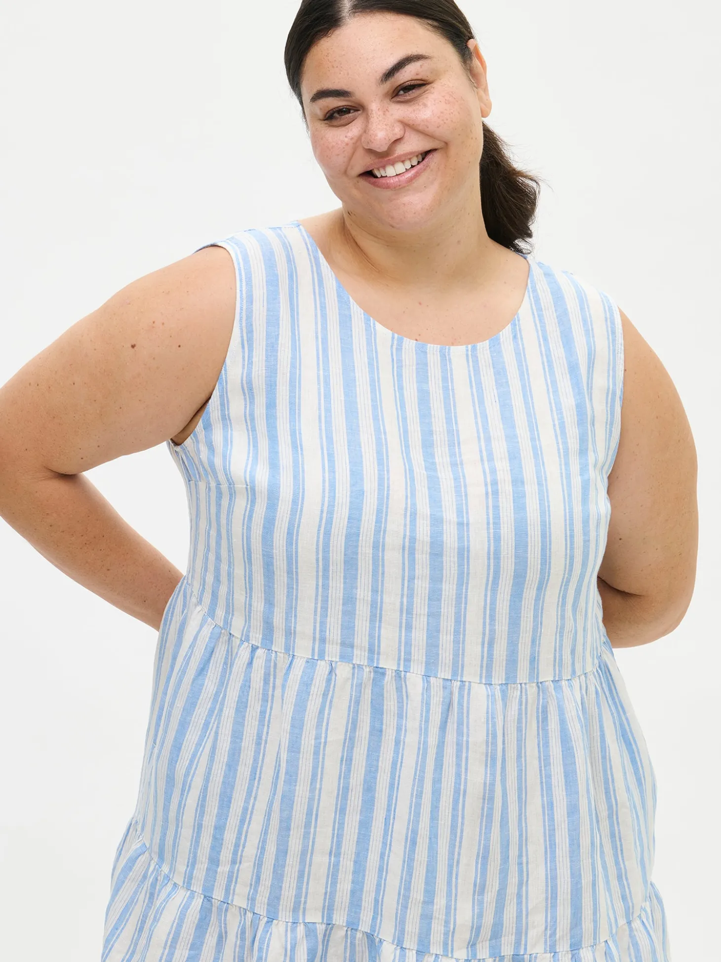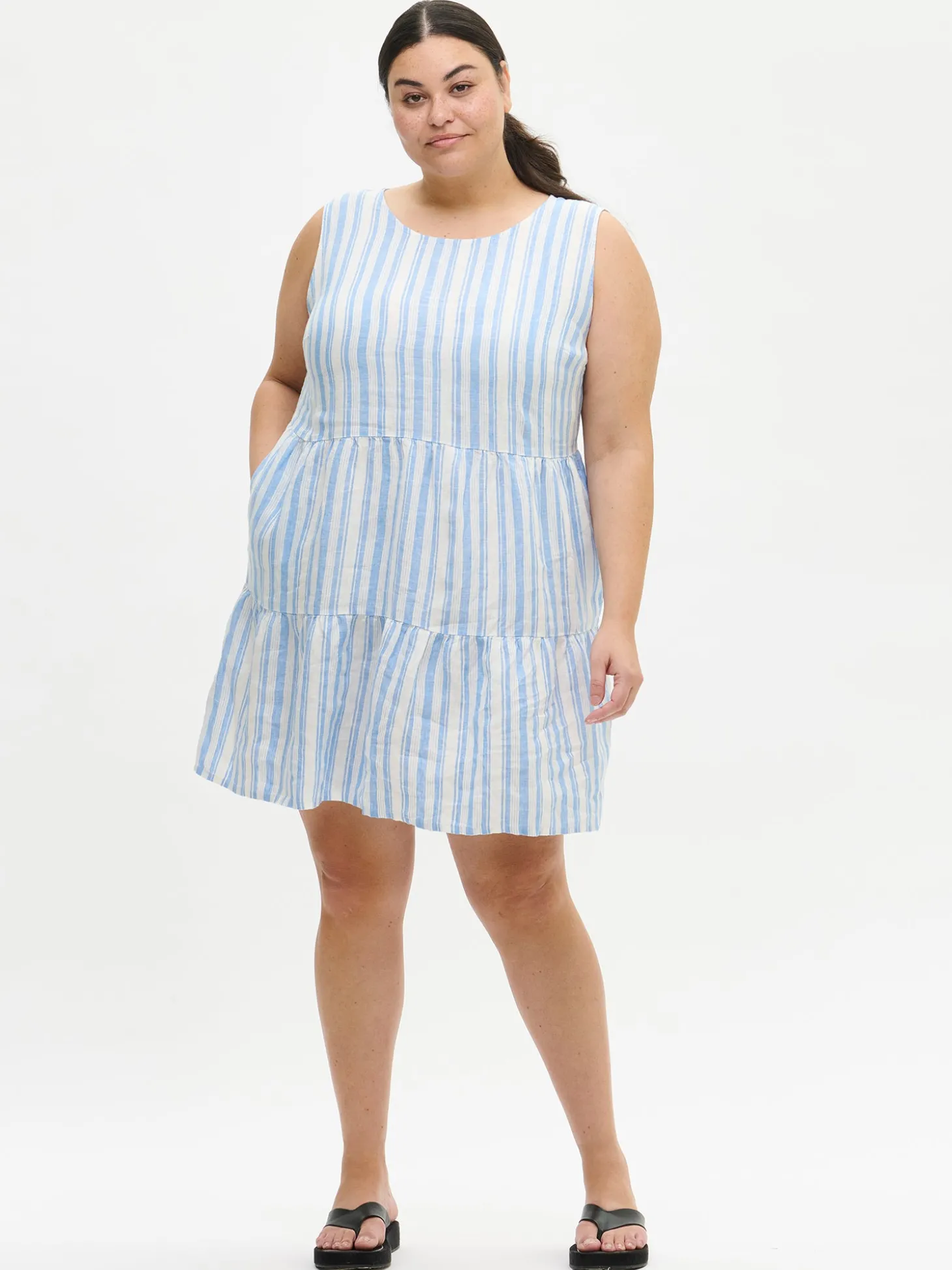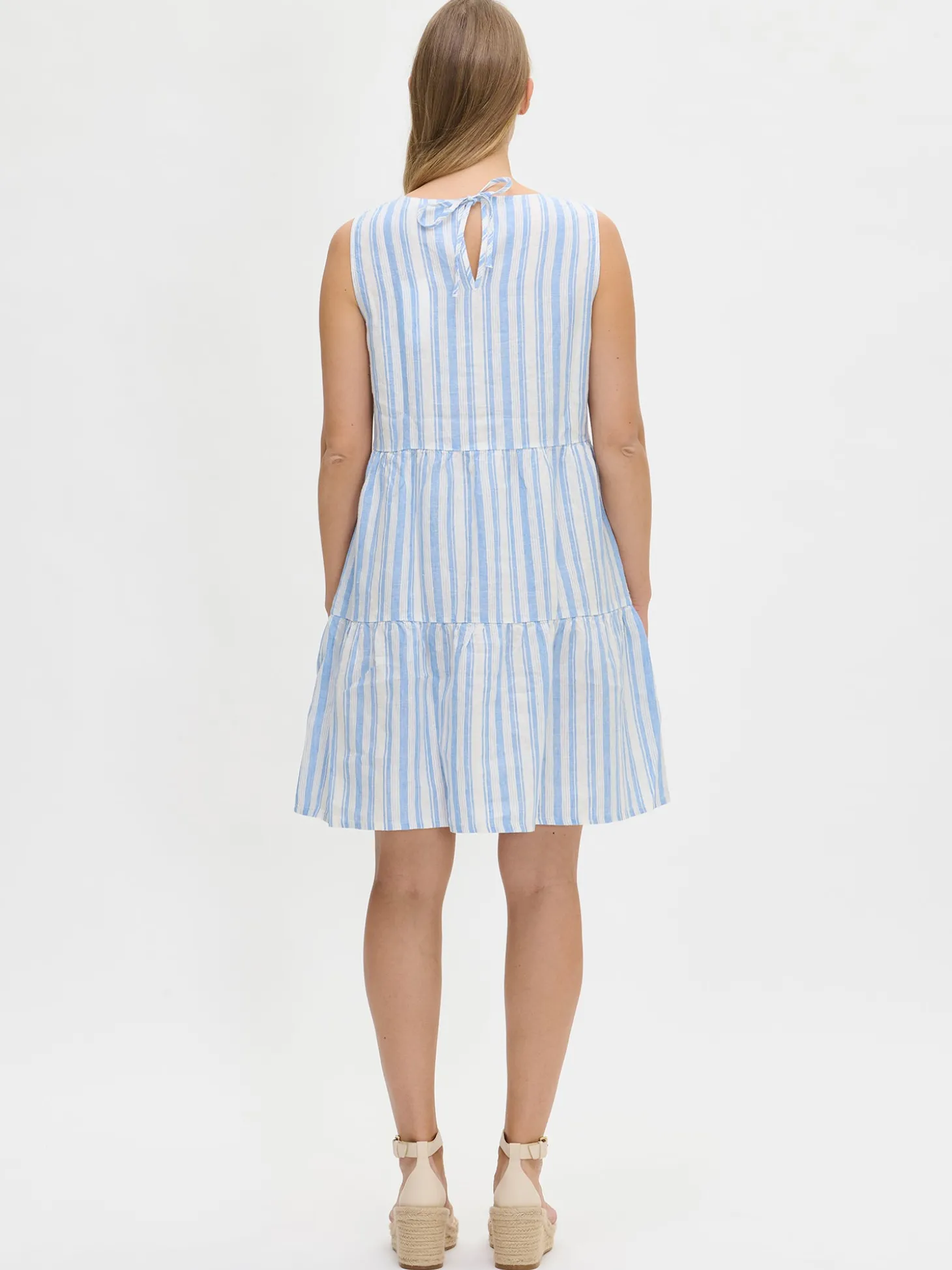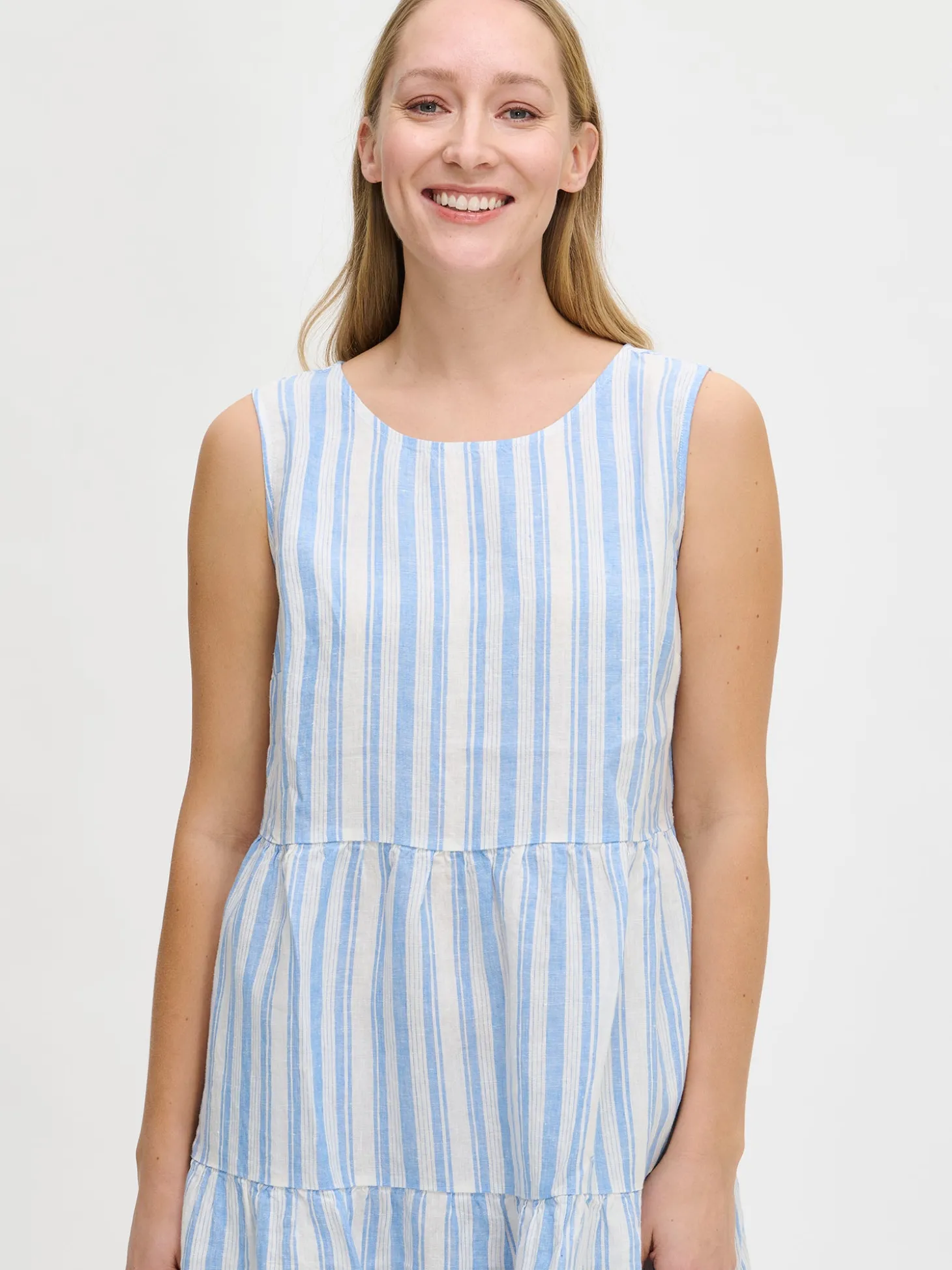 Naisten kaunis raidallinen sini-valkoinen Regatta-pellavamekko volyymisilla frillakerroksilla. Pellavamekossa on sivutaskut, pyöreä pääntie sekä niskassa pieni halkio ja solmittavat nyörit. Mekon pituus koossa M on noin 98 cm. Materiaali kudottua pellavakangasta, joka on kestävää ja hengittävää. Pellavalle on ominaista luonnollinen pieni rypistyminen. Tuote on esipesty tuotannossa, joten se ei kutistu ensimmäisessä pesussa.