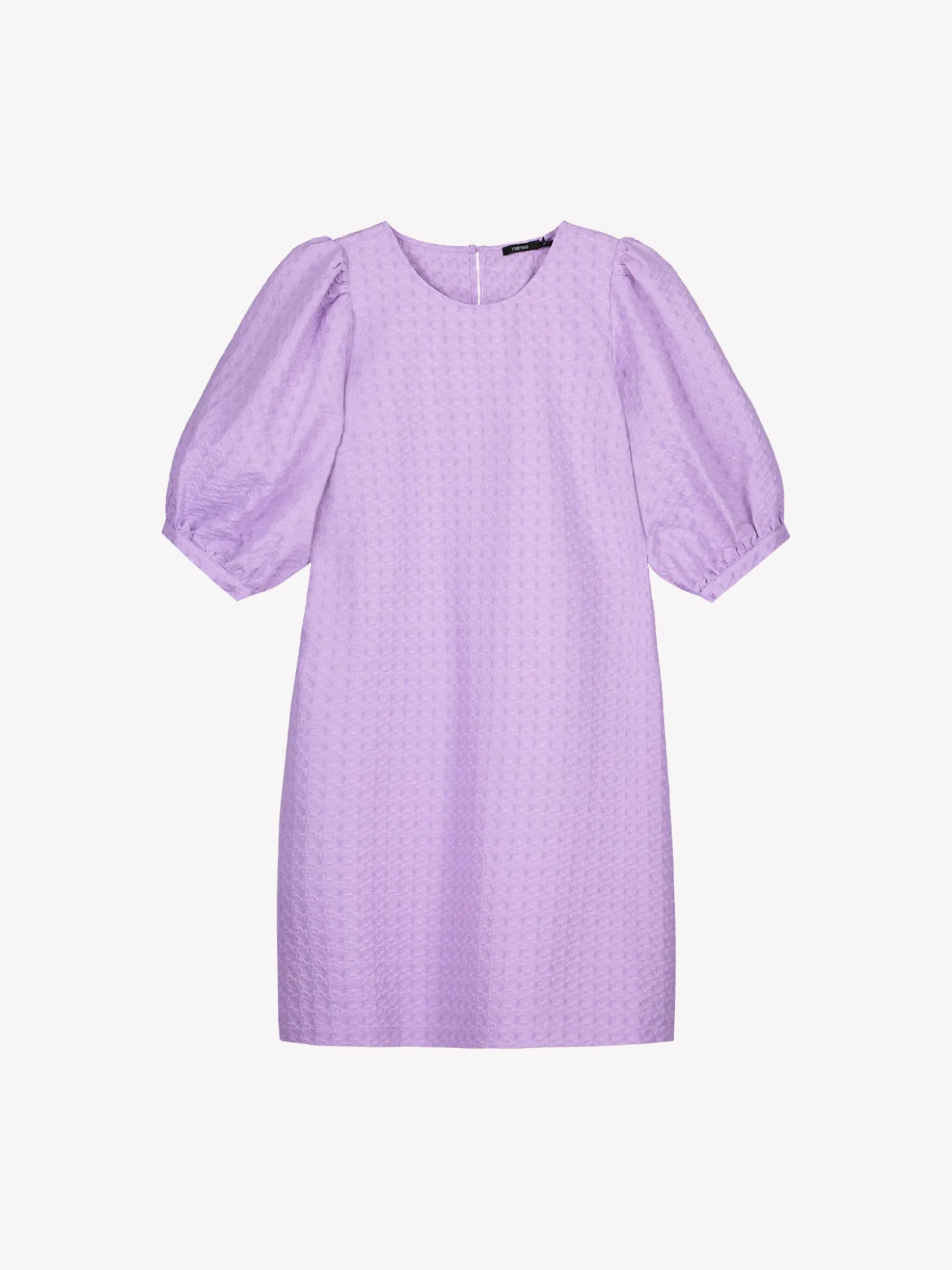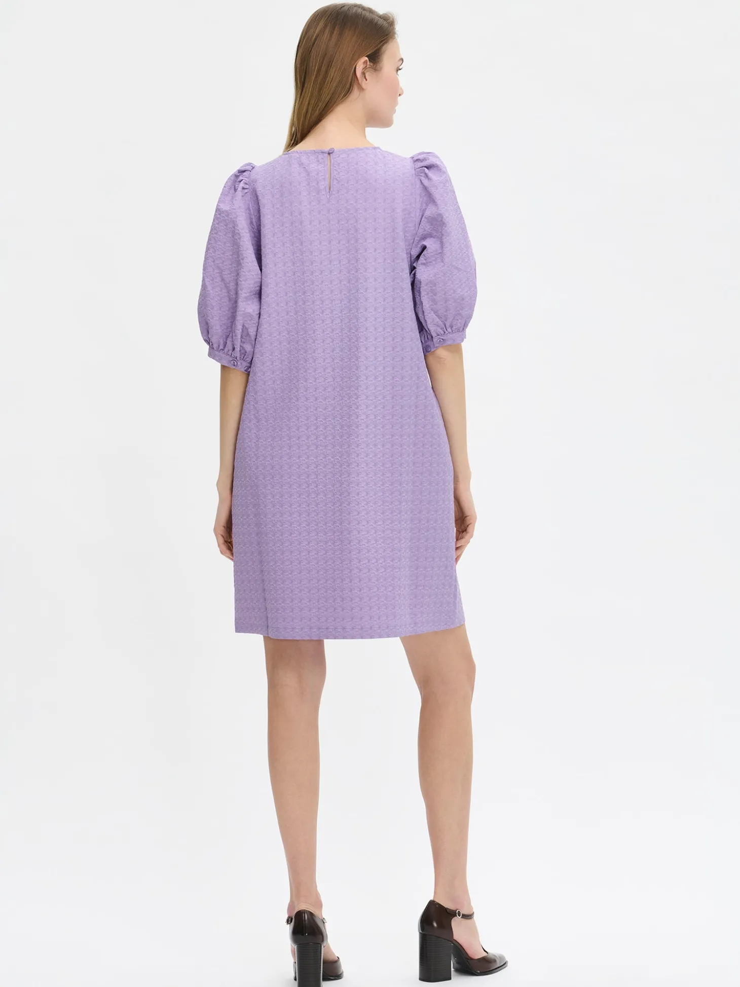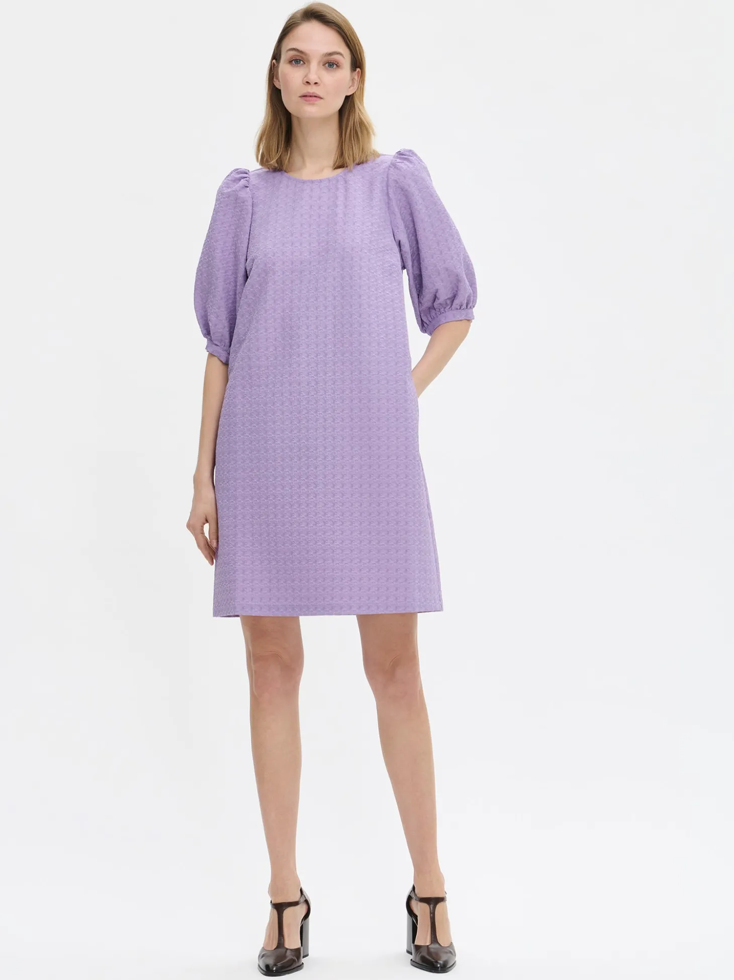 Naisten tyylikäs lila lyhythihainen Reliefi-mekko. Klassisen tyylikäs mekko sopii täydellisesti myös juhlaviin tilaisuuksiin. Lyhyessä mekossa on pyöreä pääntie, jossa takana nappihalkio. Mekon 3/4 pituiset hihat poimuttuvat runsaasti olalla ja hihansuun säädettävän listan yläpuolelta. Mekon sivuissa on taskut. Mekon pituus koossa 38 on noin 95 cm. Materiaali on miellyttävän tuntuista kudottua polyesteri-viskoosi-elastaani, jossa on kaunis pintastruktuuri. Materiaalille on ominaista 3-5 % kutistuminen ensimmäisessä pesussa.