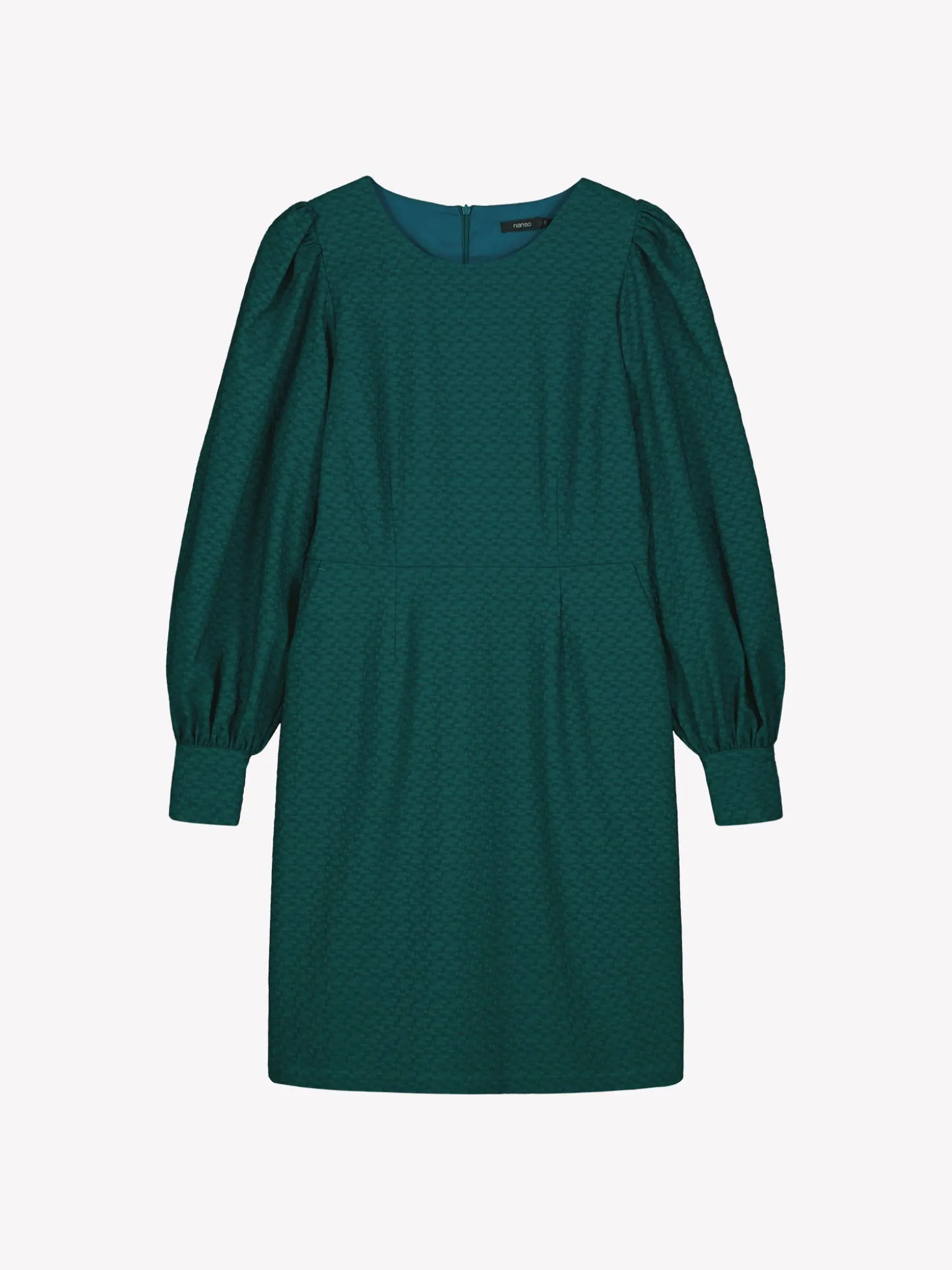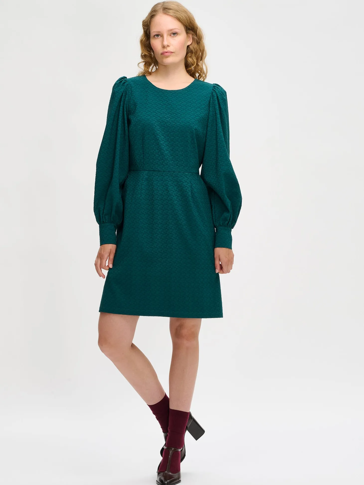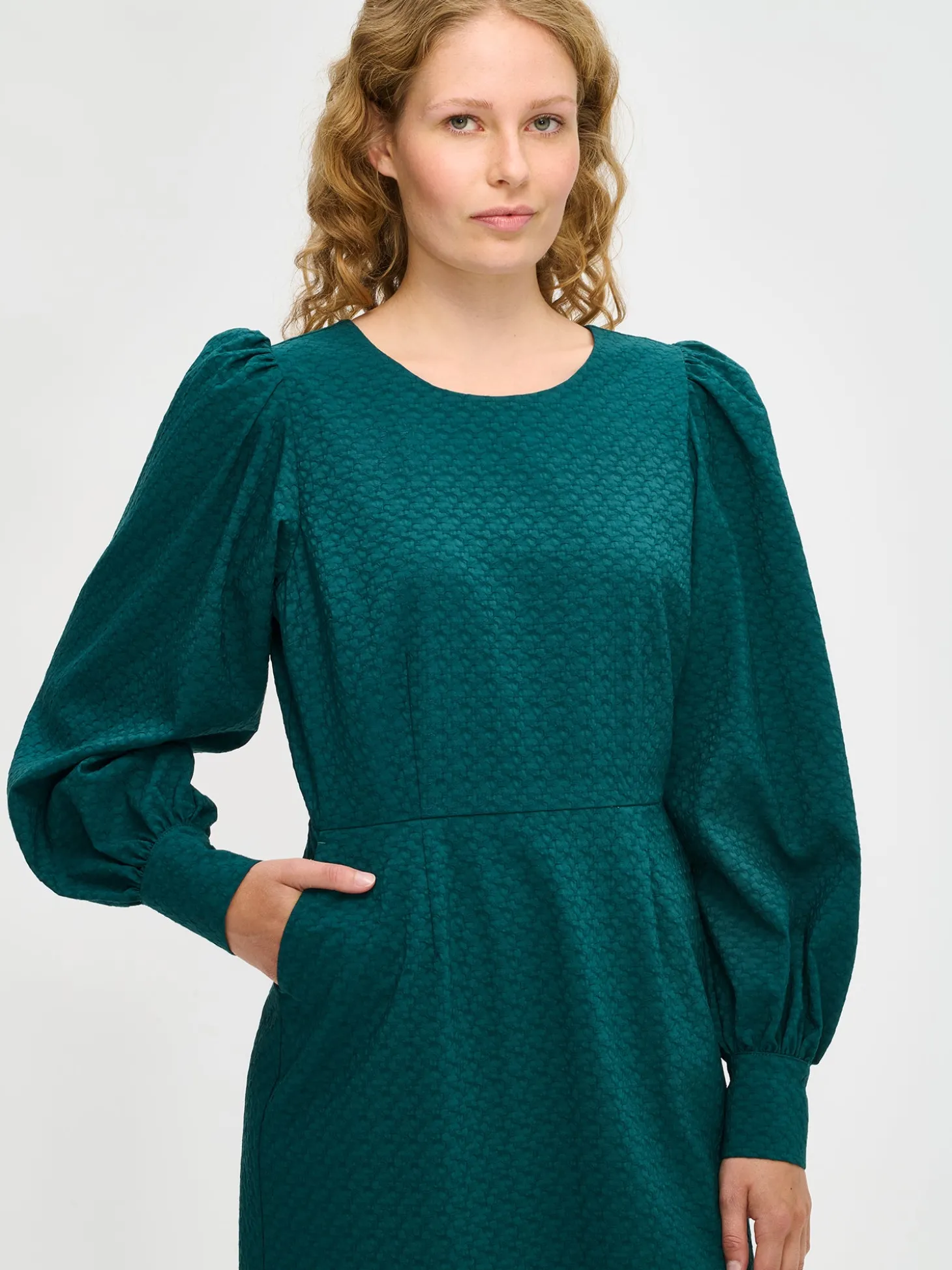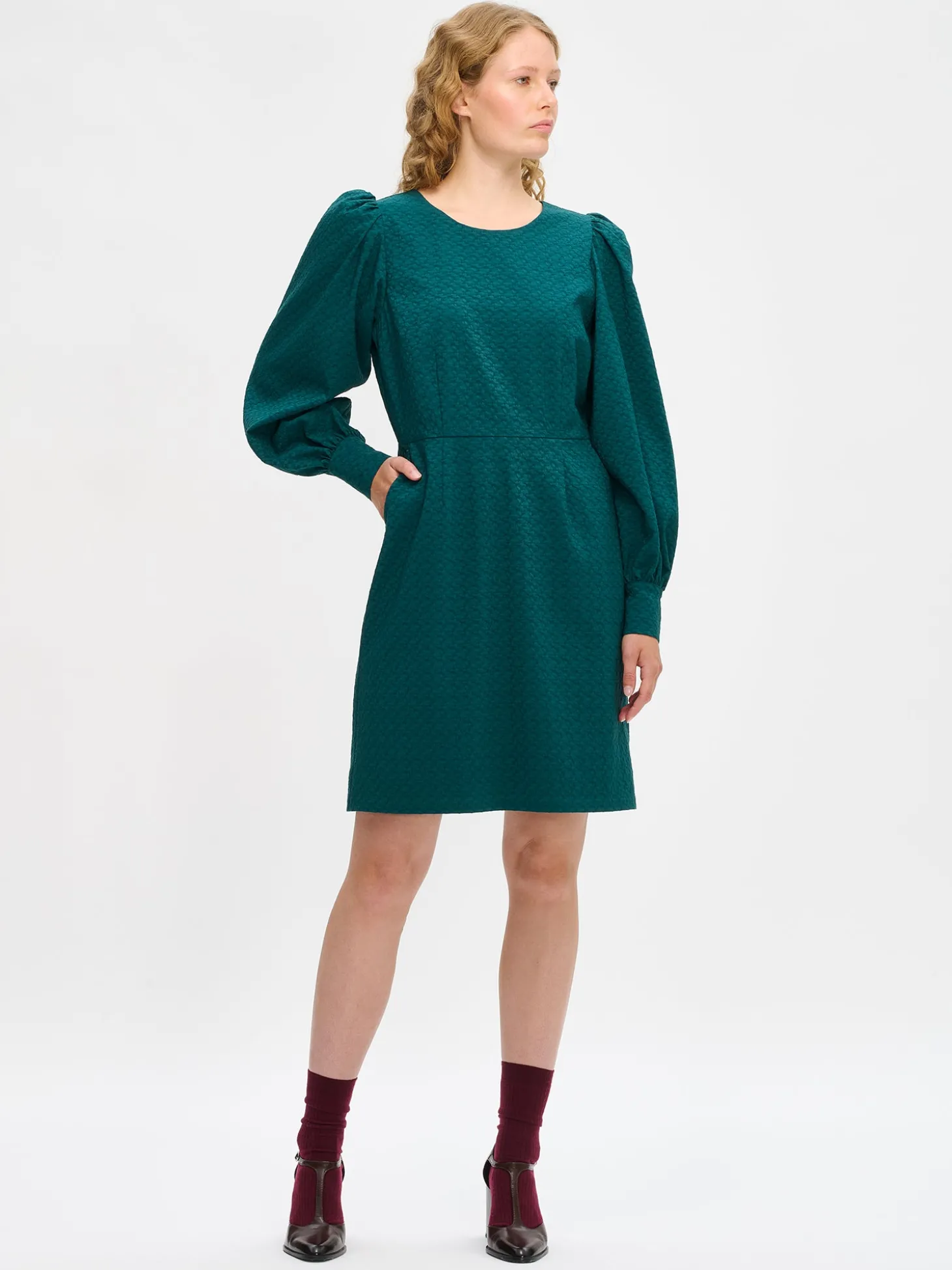 Naisten tyylikäs tummanvihreä Reliefi-mekko. Vuorillisessa mekossa on pyöreä pääntie ja takana piilovetoketju. Mekossa on väljät ja muhkeat täyspitkät hihat, jotka poimuttuvat kauniisti olalla sekä kalvosimen yläpuolelle. Hihansuissa on nappikalvosimet. Mekossa on sivutaskut, vyötäröllä leikkaussauma ja muotolaskokset sekä edessä että takana. Mekon pituus koossa 38 on noin 95 cm. Materiaali on miellyttävän tuntuista kudottua polyesteri-viskoosi-elastaani -kangasta, jossa on kaunis pintastruktuuri. Materiaalille on ominaista 3-5% kutistuminen ensimmäisessä pesussa. Suosittelemme tuotteen pesua ennen käyttöä, koska tuotteesta saattaa irrota väriä ennen ensimmäistä pesua.