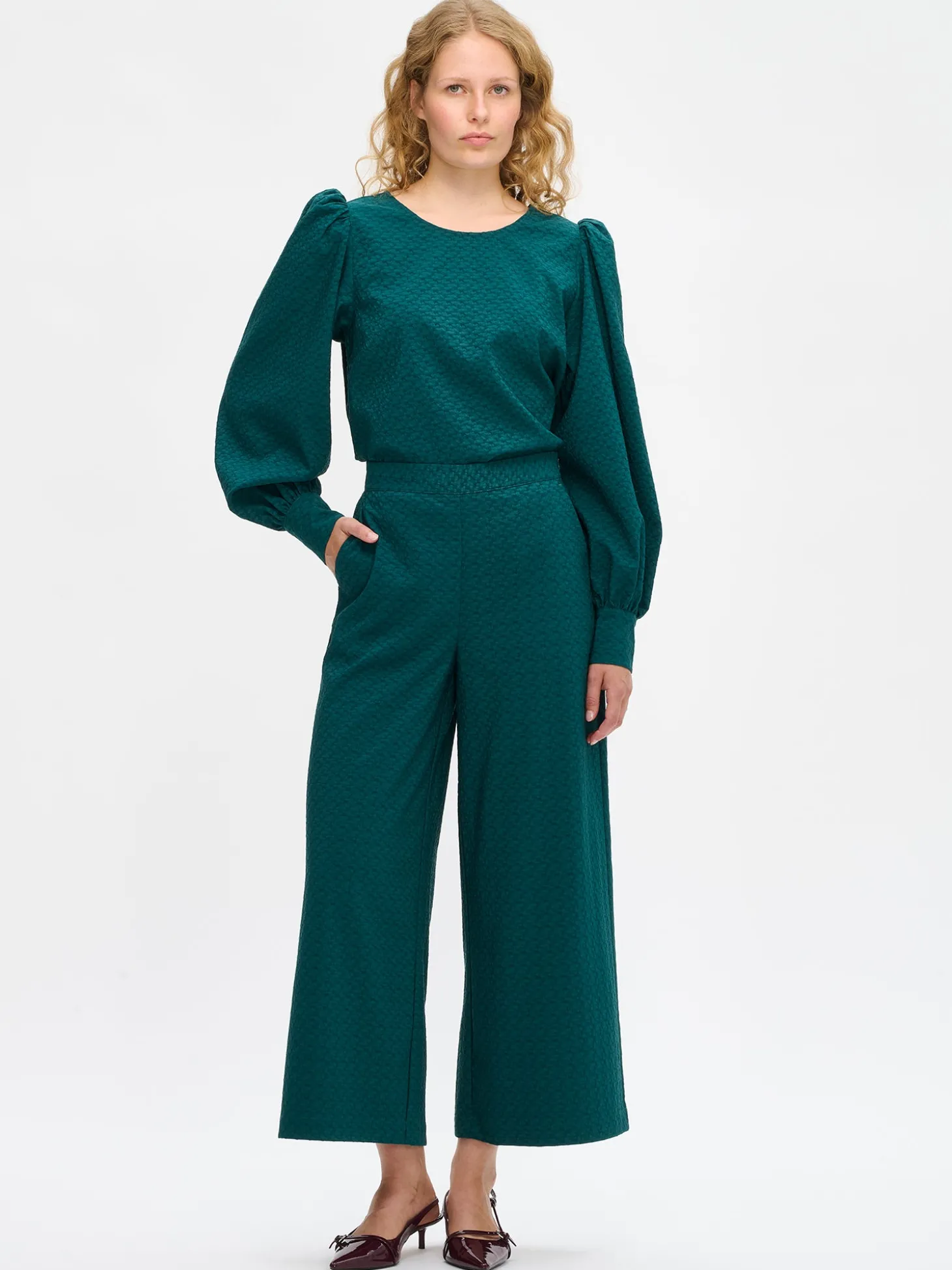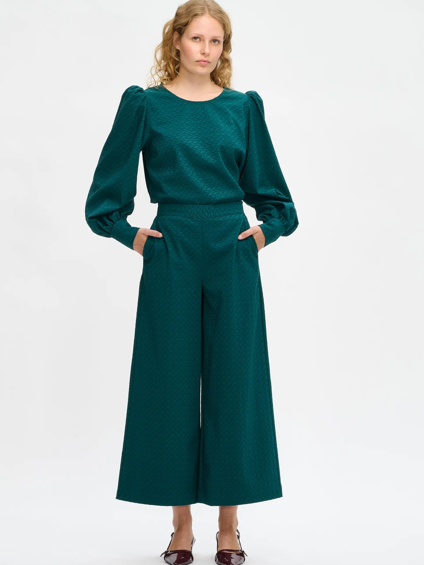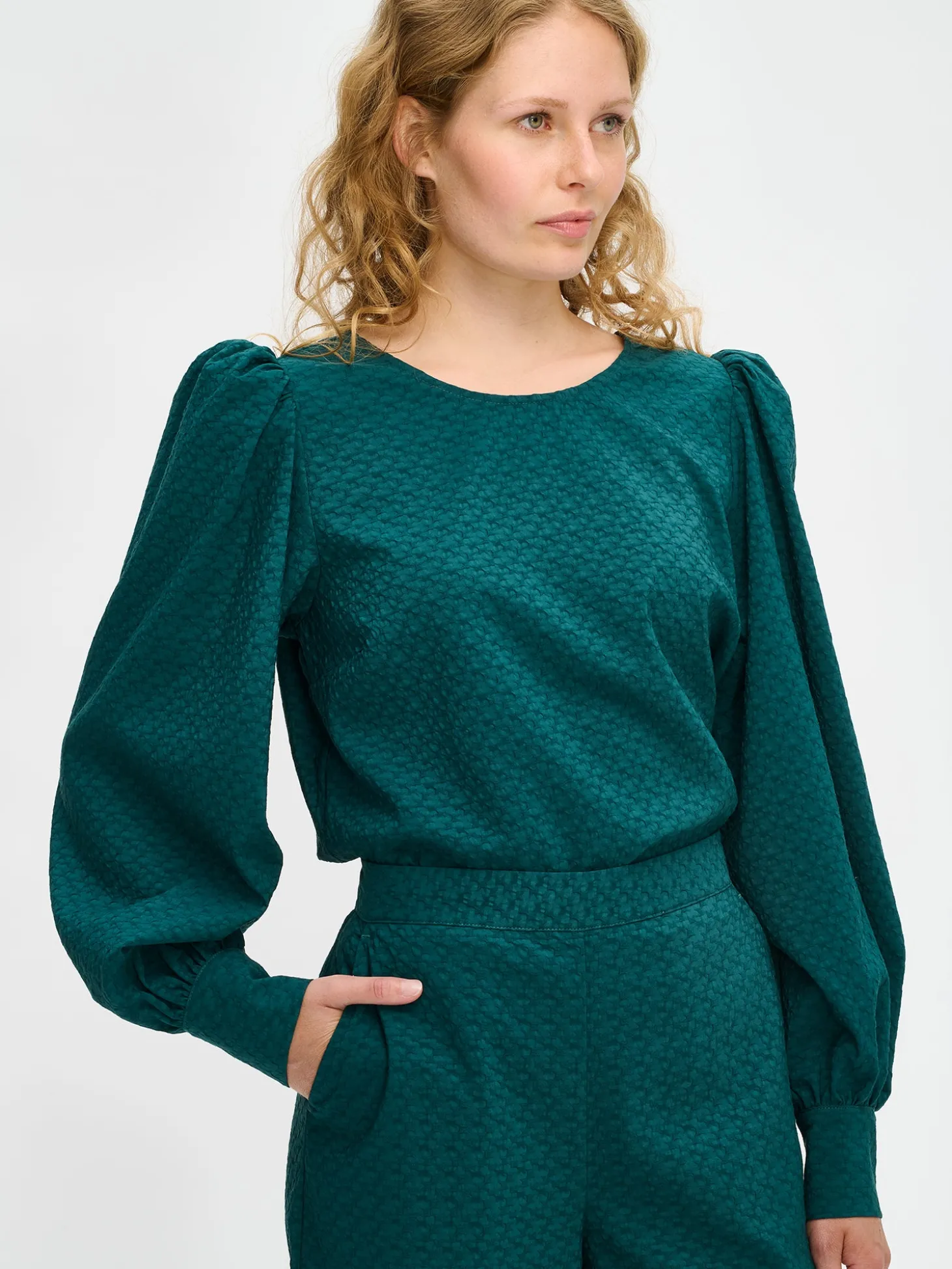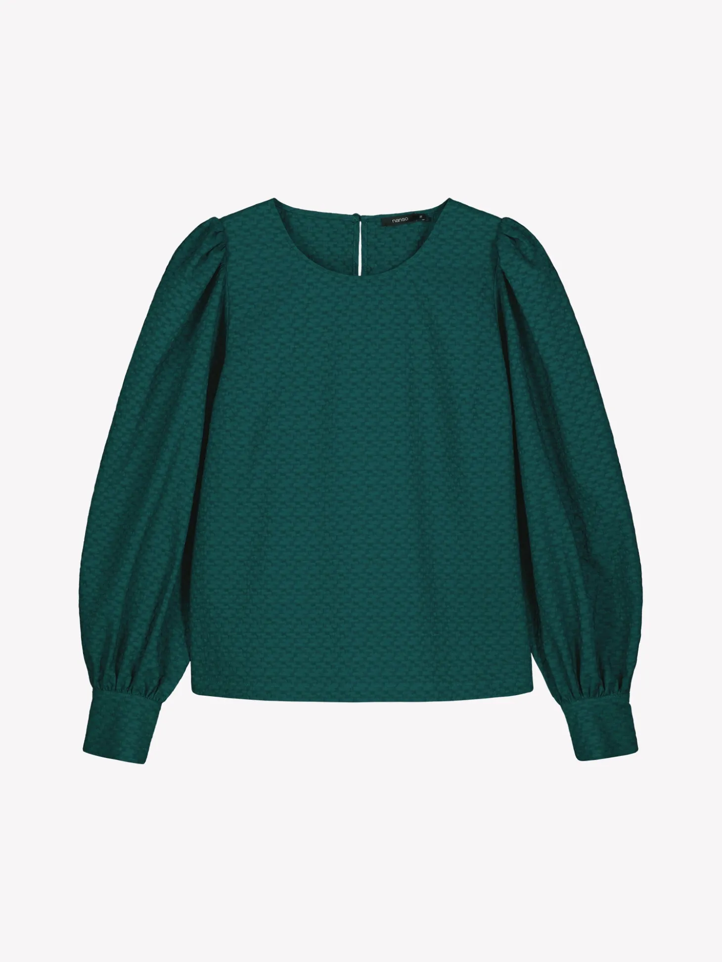 Naisten tyylikäs tummanvihreä Reliefi-pusero kauniilla tekstuuripinnalla. Pusero on täydellinen yhdistettäväksi sekä hameiden että housujen kanssa. Puserossa on pyöreä pääntie, jossa takana nappihalkio. Puserossa on väljät ja muhkeat täyspitkät hihat, jotka poimuttuvat kauniisti olalla sekä kalvosimen yläpuolelle. Hihansuissa on nappikalvosimet. Puseron pituus koossa 38 on noin 60 cm. Materiaali on miellyttävän tuntuista kudottua polyesteri-viskoosi-elastaani -kangasta, jossa on kaunis pintastruktuuri. Materiaalille on ominaista 3-5% kutistuminen ensimmäisessä pesussa. Suosittelemme tuotteen pesua ennen käyttöä, koska tuotteesta saattaa irrota väriä ennen ensimmäistä pesua.