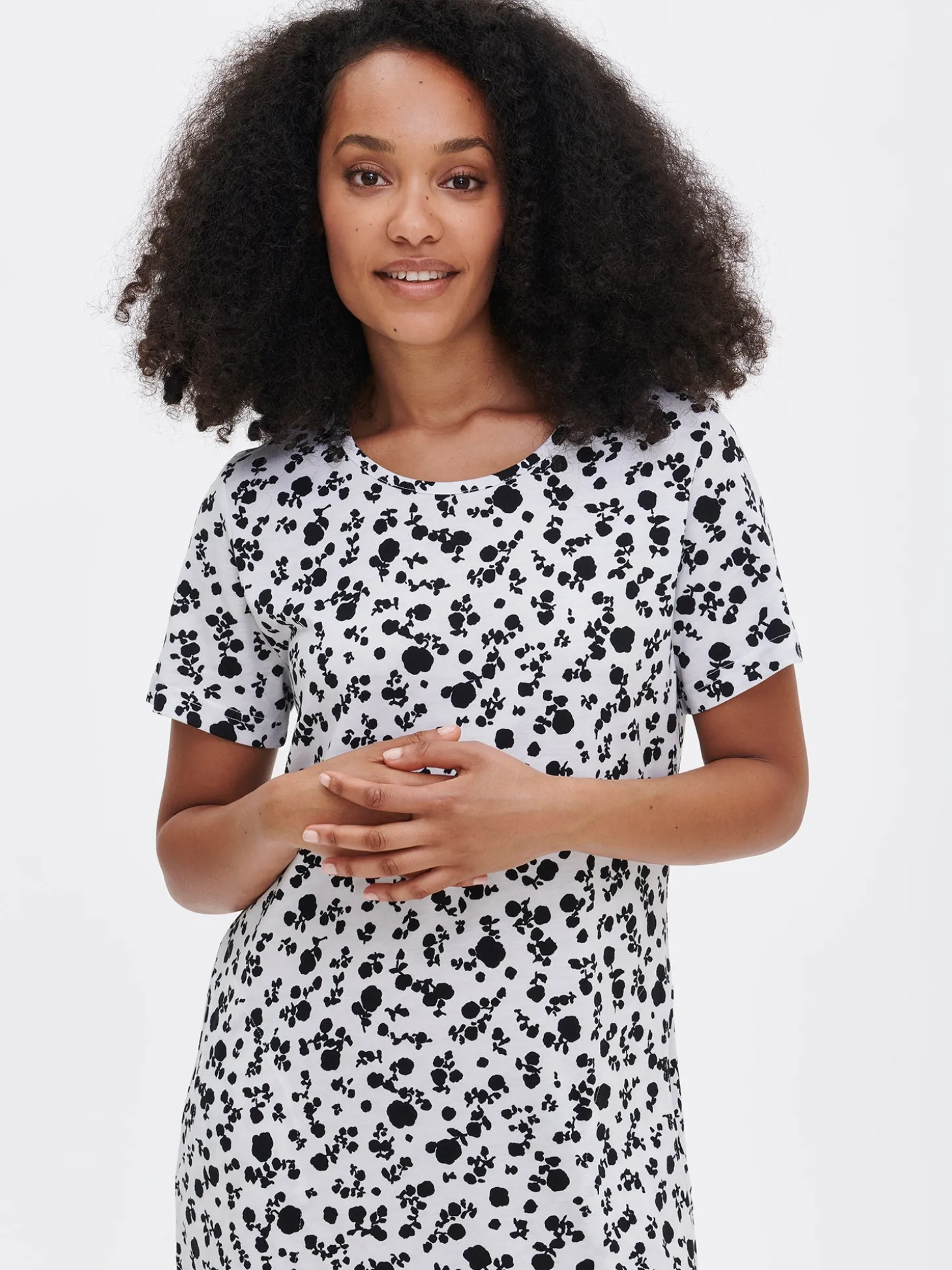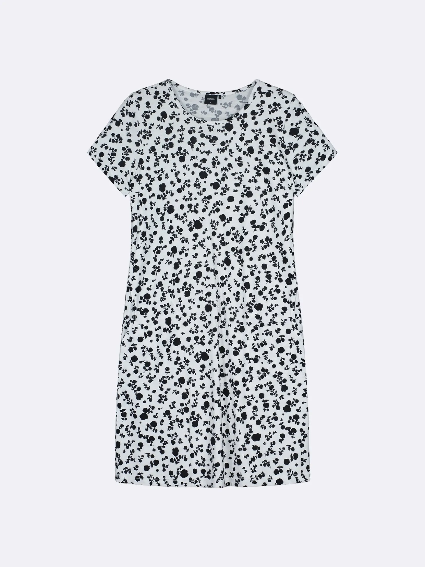 Naisten kuosillinen mustavalkoinen Roosa-yöpaita lyhyillä hihoilla, sivutaskuilla ja pyöreällä pääntiellä. Yöpaidan pituus koossa M on noin 95 cm. Materiaali on laadukasta, iholla miellyttävän pehmeältä tuntuvaa ja helppohoitoista puuvilla-modaalia, joka pysyy hyvänä pesusta toiseen. Ihastuttava siro kuosi ja käytännölliset taskut tekevät tästä yöpaidasta täydellisen valinnan rentoihin hetkiin, tuoden raikkautta ja tyyliä jokaiseen yöhön.