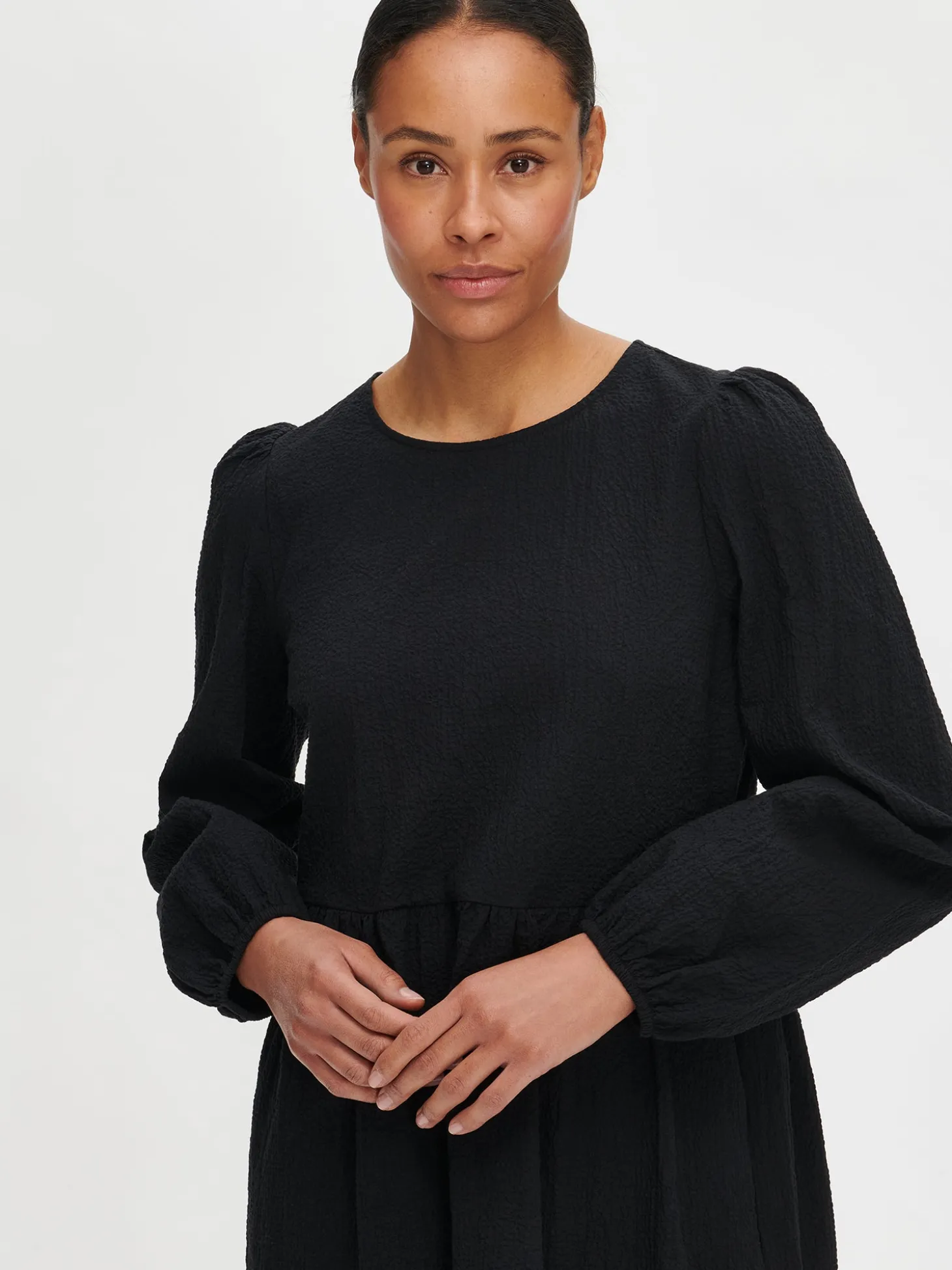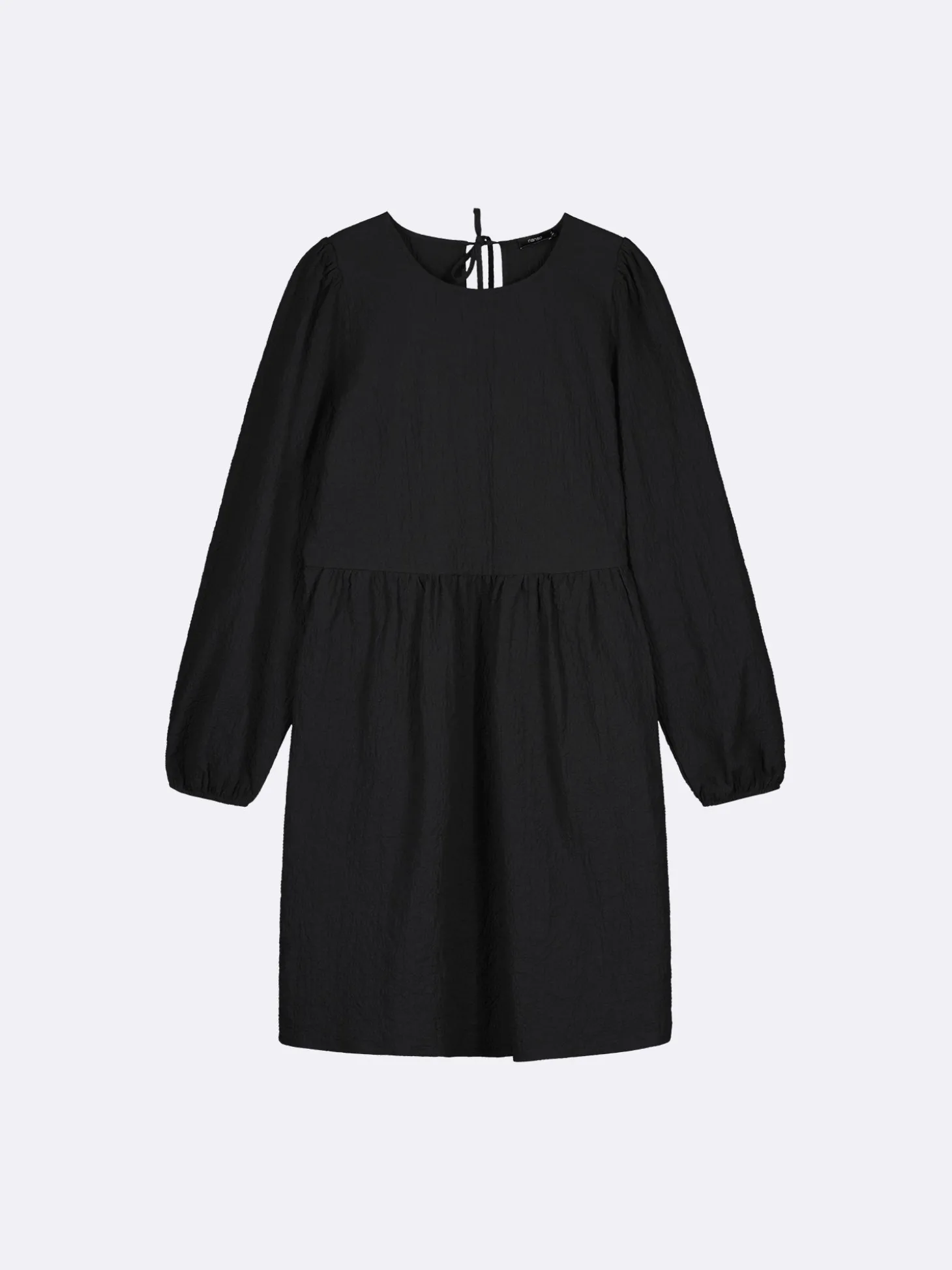 Naisten pitkähihainen musta Rusetti-mekko. Tyylikäs mekko on loistava valinta niin arkeen kuin juhlaan. Mekossa kantilla viimeistelty pyöreä pääntie ja takana yksityiskohtana halkio kahdella rusetilla, joista ylimmäinen on avattava. Täyspitkät hihat poimuttuvat hihansuiden kuminauhakäänteeseen. Mekossa on kaunis poimutus vyötäröllä ja sivutaskut. Mekon pituus koossa M on noin 95 cm. Materiaali on kudottua puuvillakangasta, jossa kaunis seersucker pintastruktuuri. Kankaassa on hieman elastaania antamassa joustoa. Materiaalille on ominaista 3-5% kutistuminen ensimmäisessä pesussa.