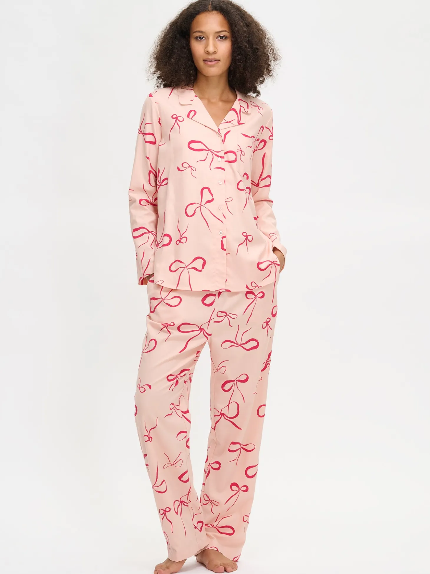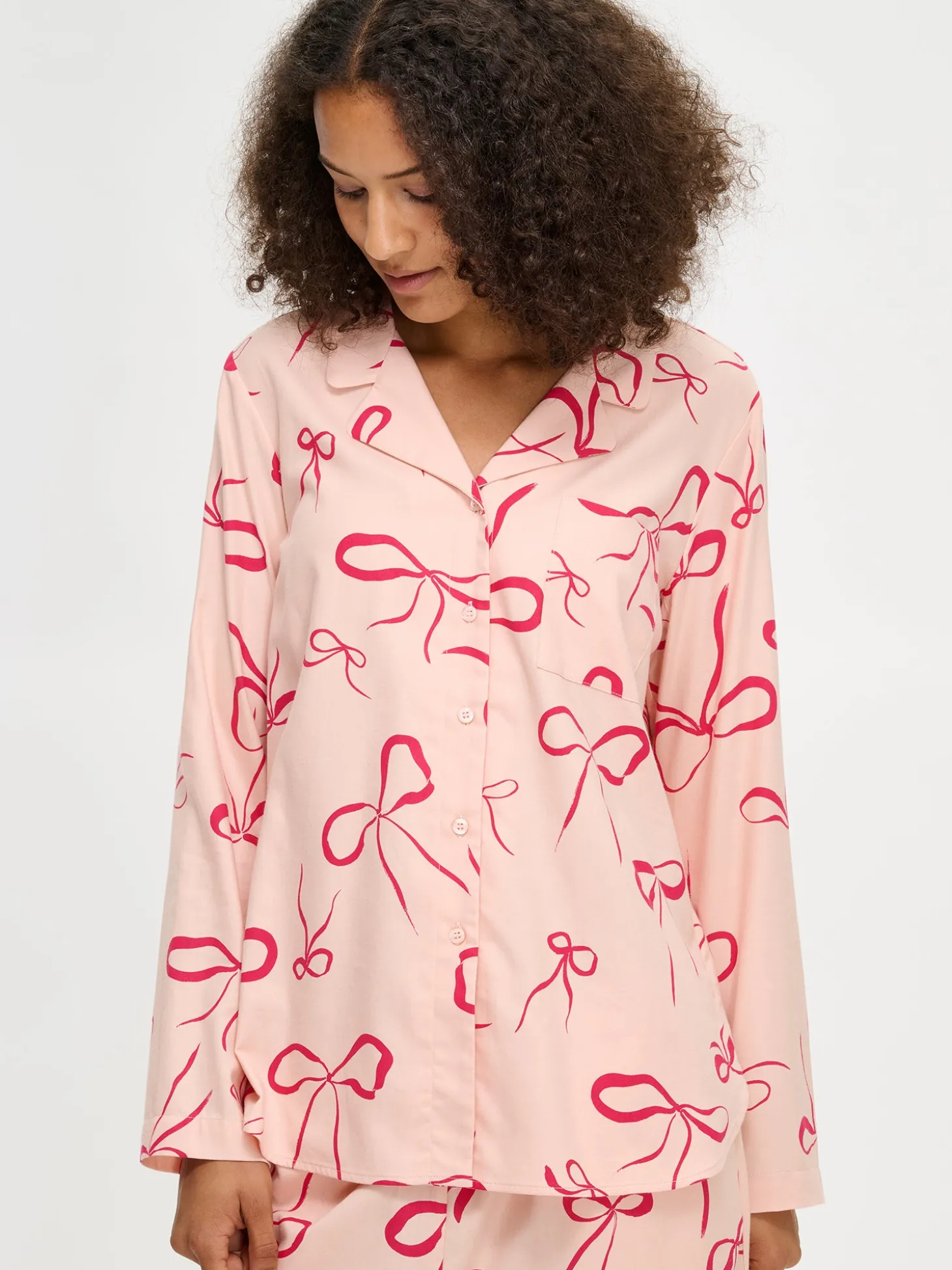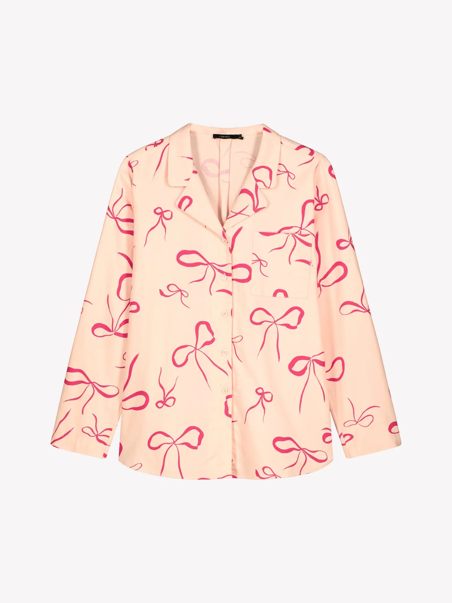 Naisten kuosillinen Rusetti-pyjamapaita vaaleanpunaisena. Pitkähihaisessa pyjamapaidassa on kauniisti muotoiltu kaulus, nappilista ja pyöristetty helma. Puseron pituus koossa M on noin 70 cm. Materiaali on pehmeää ja miellyttävän tuntuista puuvillaflanellikangasta. Materiaalille on ominaista 3-5% kutistuminen ensimmäisessä pesussa.