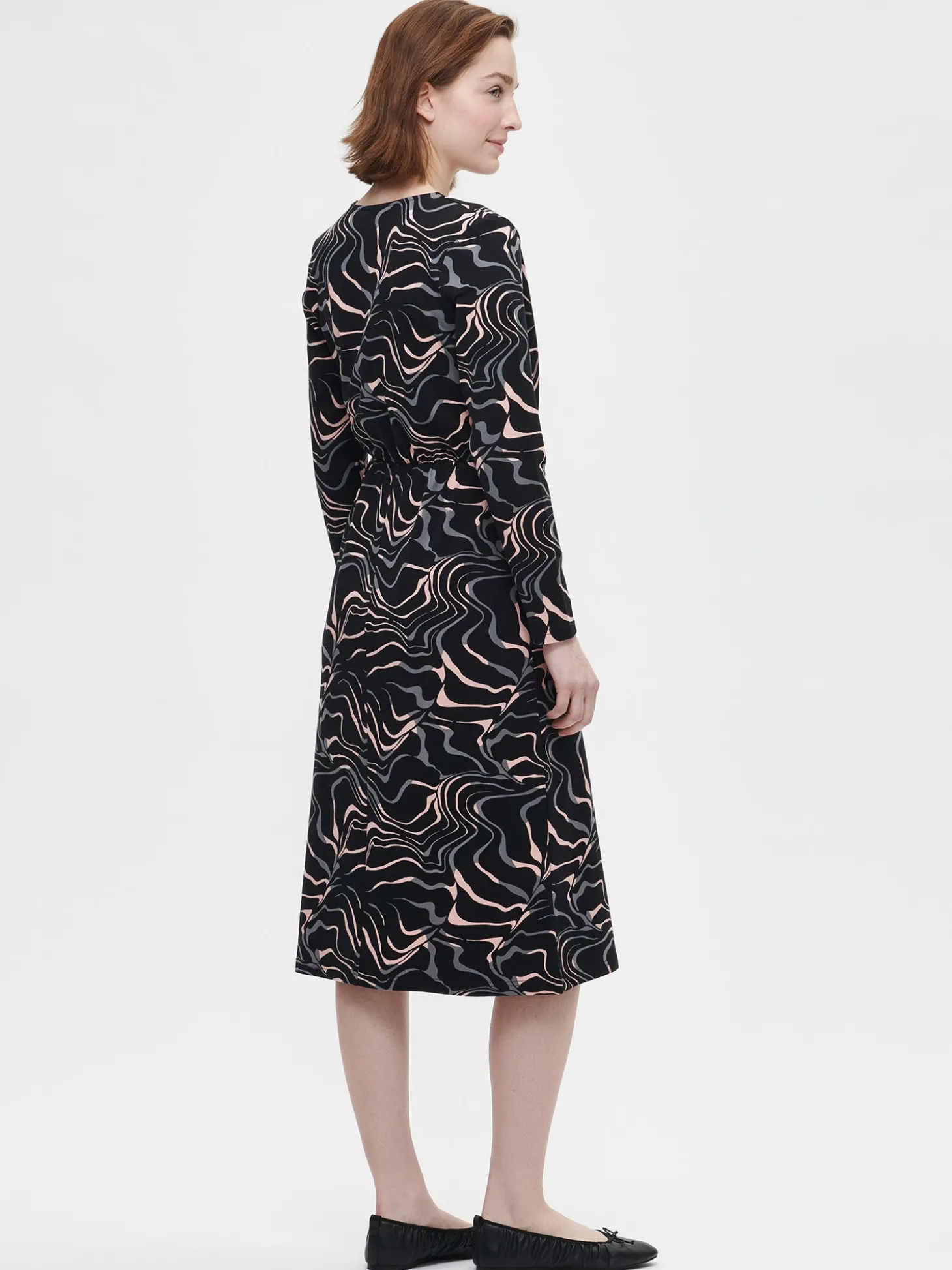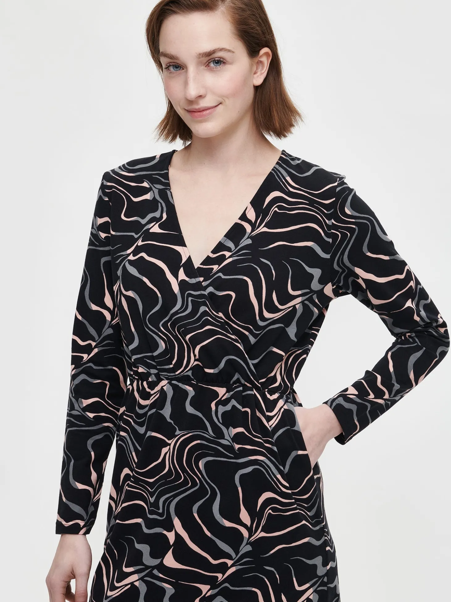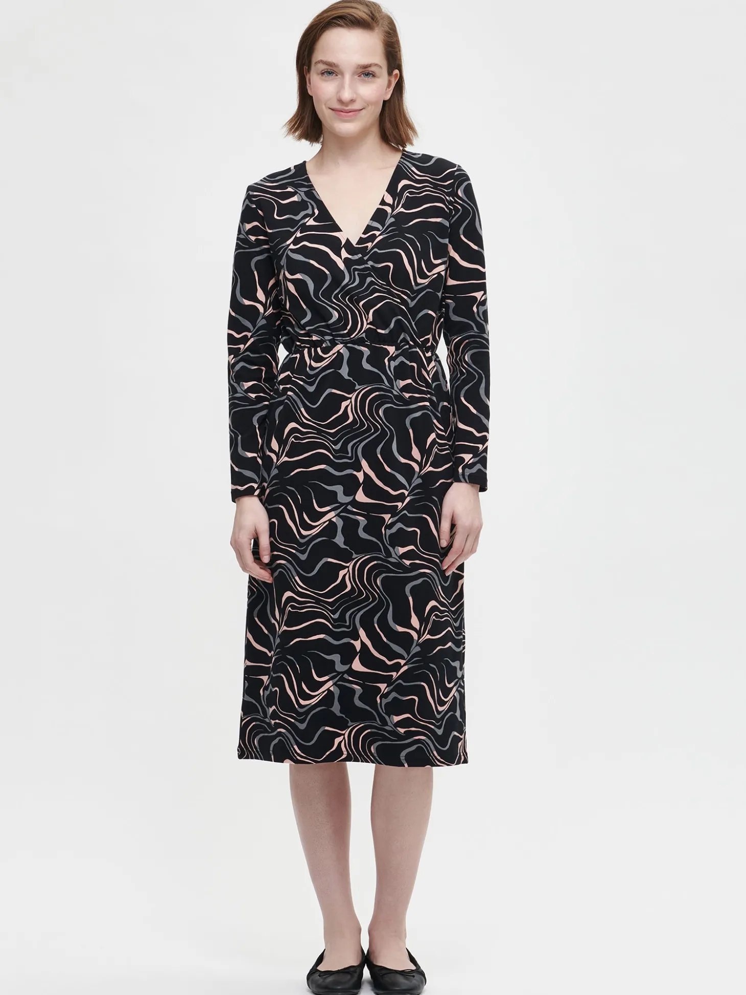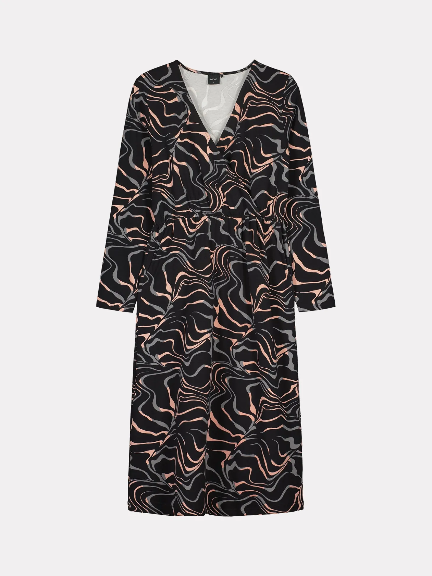Naisten musta Saara-mekko kauniilla kuosilla. Mekossa on kietaisumallinen yläosa, jossa on laskoksia vyötäröltä alaspäin. Mekossa on täyspitkät hihat ja helmaosa on istuva. Mekon sivuissa on taskut ja vyötäröllä kuminauha. Mekon pituus koossa M on noin 115 cm. Materiaali on miellyttävän tuntuista ja helppohoitoista puuvilla-elastaani-neulosta.