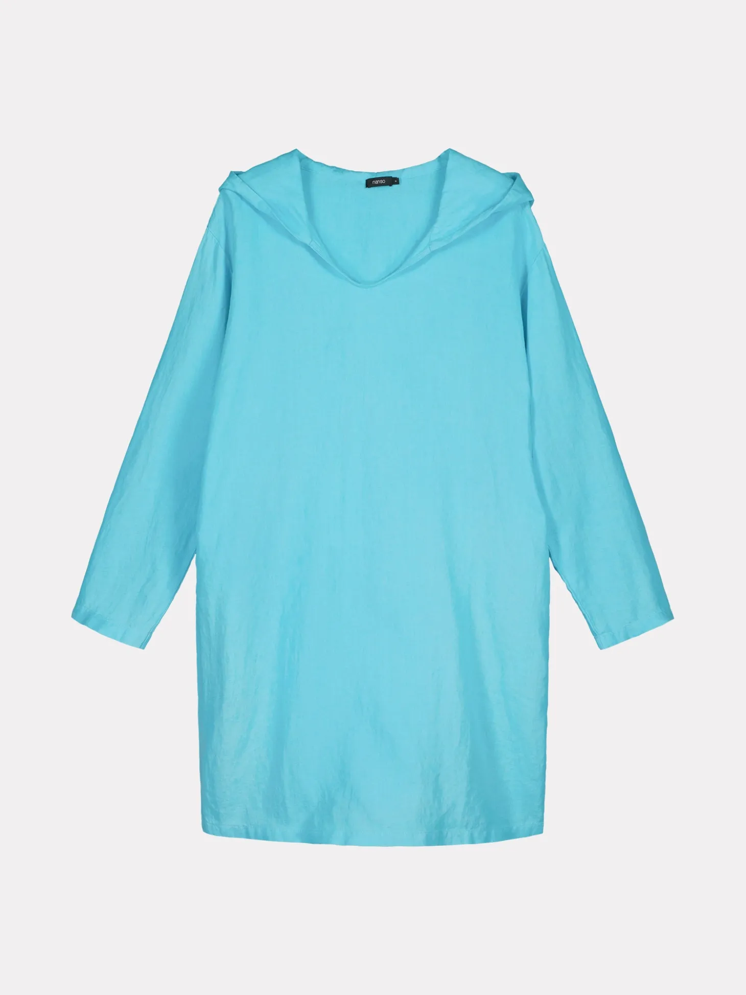 Naisten rento turkoosi Sarastus-pellavahupparimekko pitkillä hihoilla. Ihana pellavamekko sopii täydellisesti rentoon oleiluun ja lämpimiin kesäpäiviin. Huppari mekossa on kauniisti muotoiltu halkio pääntiellä, huppu ja sivutaskut. Pellavamekon pituus koossa M on noin 95 cm. Materiaali kudottua pellavakangasta, joka on kestävää ja hengittävää. Pellavalle on ominaista luonnollinen pieni rypistyminen. Tuote on esipesty tuotannossa, joten se ei kutistu ensimmäisessä pesussa.
