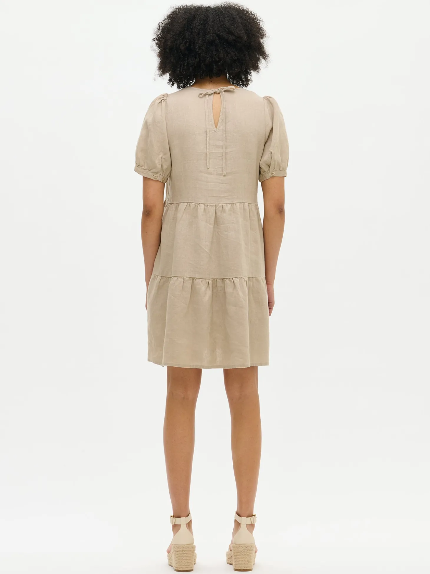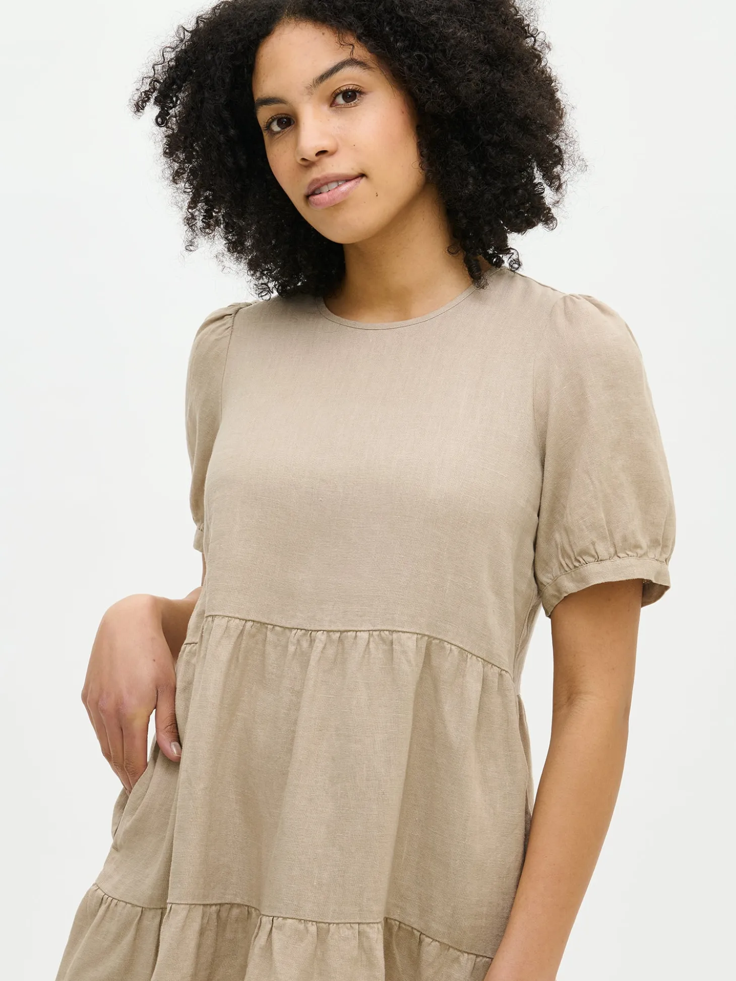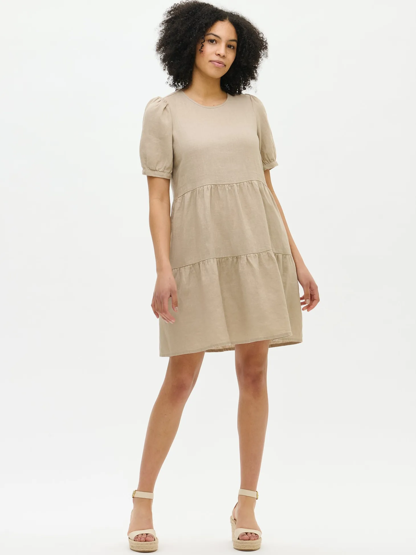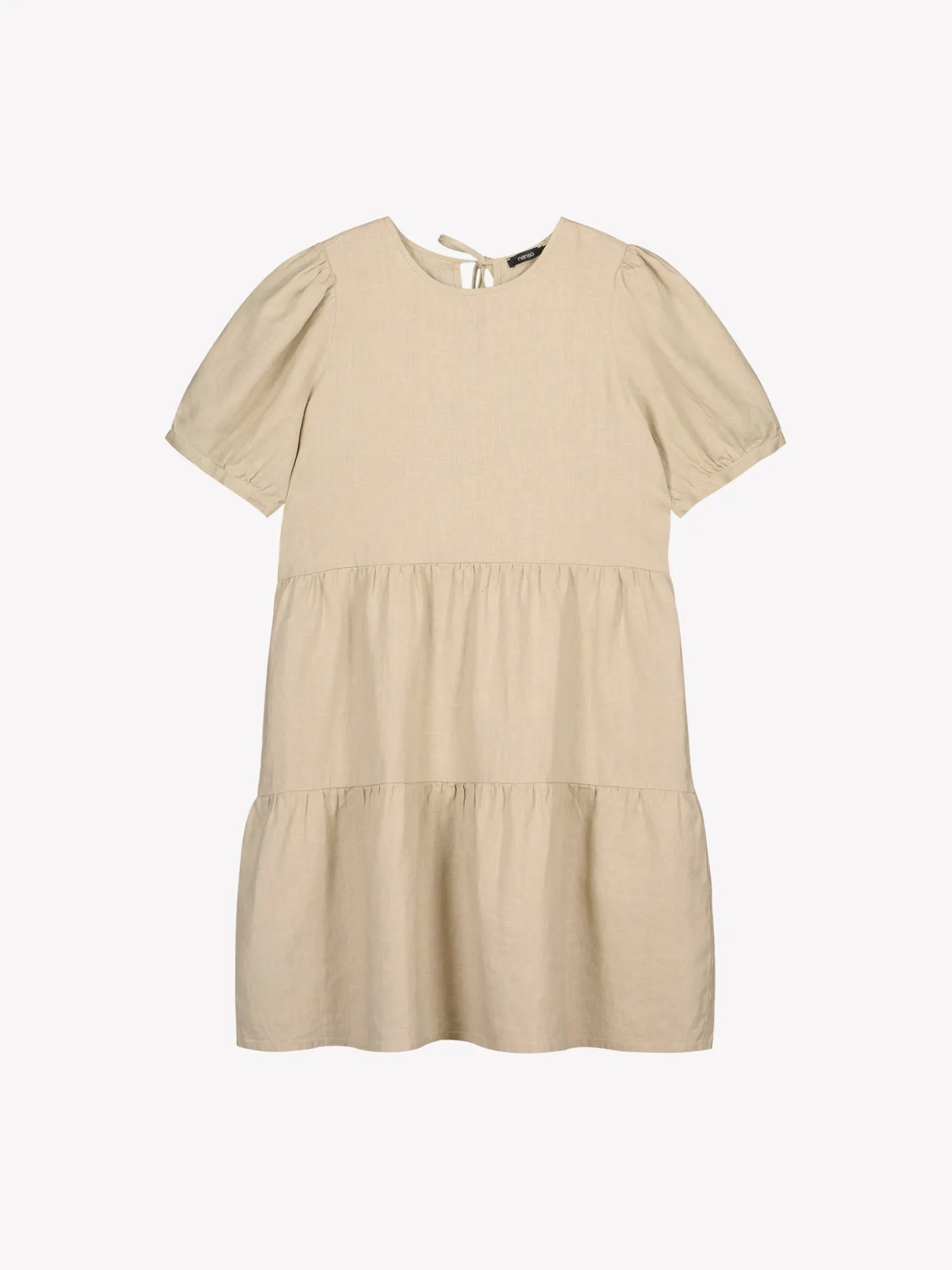 Naisten lyhyt beige Sarastus-pellavamekko volyymisilla frillakerroksilla ja lyhyillä puhvihihoilla, joissa on napit säätövaralla. Kaunis ja rento Sarastus-pellavamekko on kesän kestosuosikki vuodesta toiseen. Pellavamekossa on sivutaskut, pyöreä pääntie sekä niskassa pieni halkio ja solmittavat nyörit. Pellavamekon pituus koossa M on noin 94 cm. Materiaali kudottua pellavakangasta, joka on kestävää ja hengittävää. Pellavalle on ominaista luonnollinen pieni rypistyminen. Tuote on esipesty tuotannossa, joten se ei kutistu ensimmäisessä pesussa.