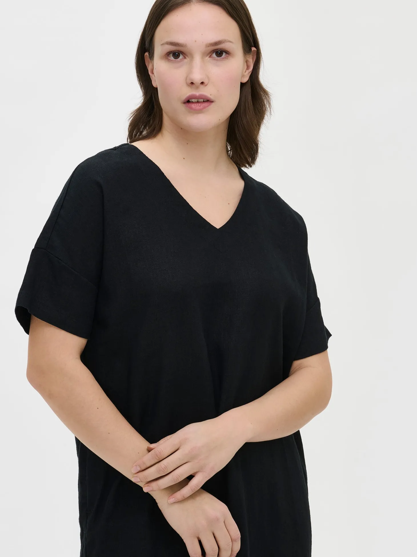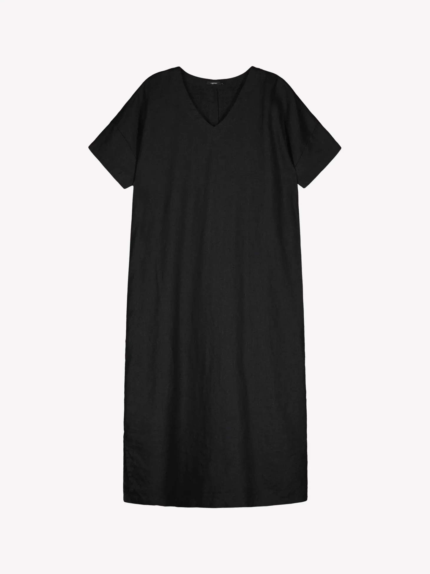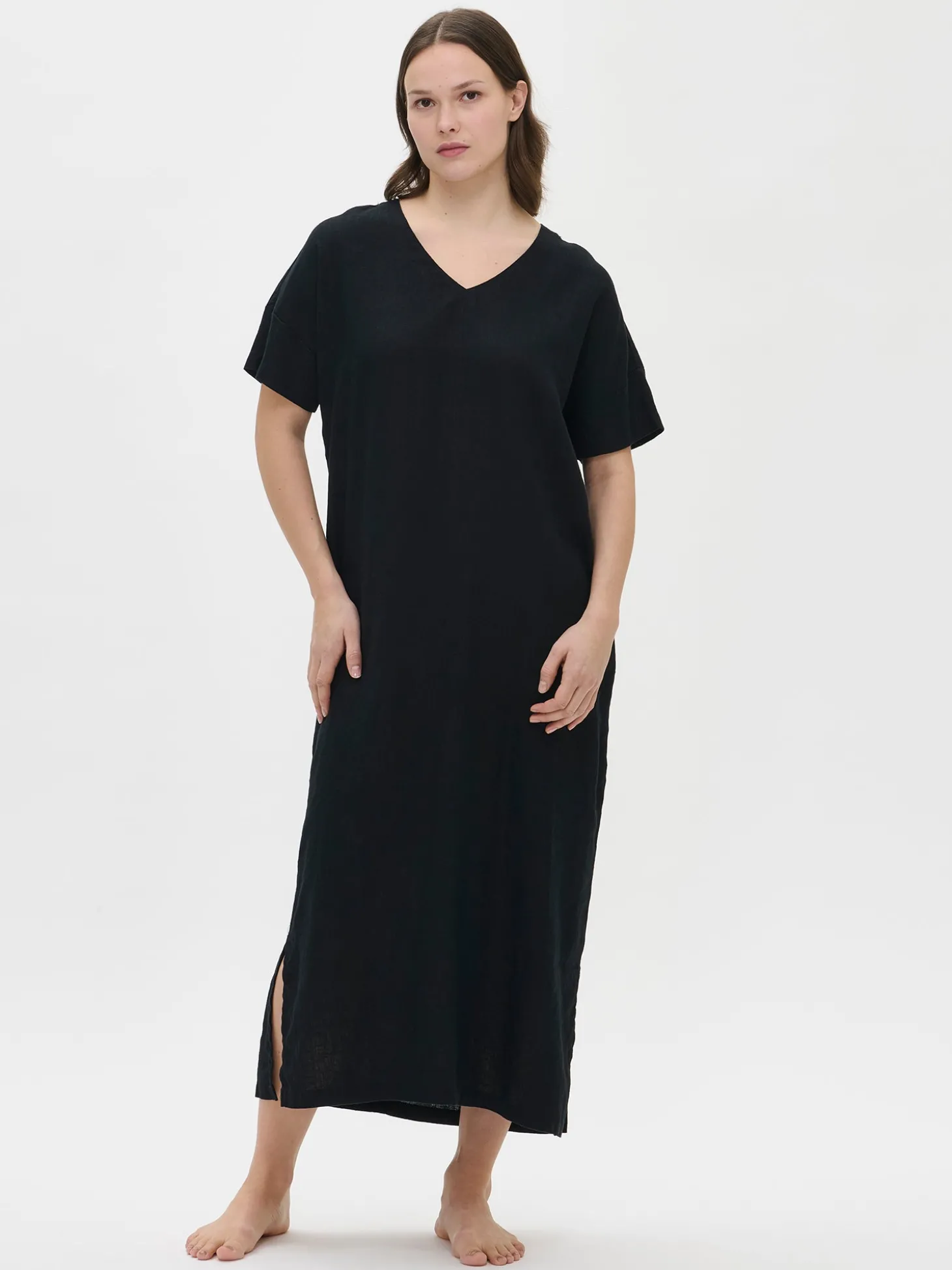 Naisten rento musta suoralinjainen Sarastus-pellavamekko sivuhalkioilla. Lyhythihaisessa kaftaanissa on V-pääntie ja sivutaskut. Mekon pituus koossa M on noin 130 cm. Materiaali kudottua pellavakangasta, joka on kestävää ja hengittävää. Pellavan kevyt ja viileä tuntu tekevät mekosta täydellisen valinnan rentoihin kesäpäiviin ja kiireettömiin hetkiin kotona. Pellavalle on ominaista luonnollinen pieni rypistyminen. Tuote on esipesty tuotannossa, joten se ei kutistu ensimmäisessä pesussa.