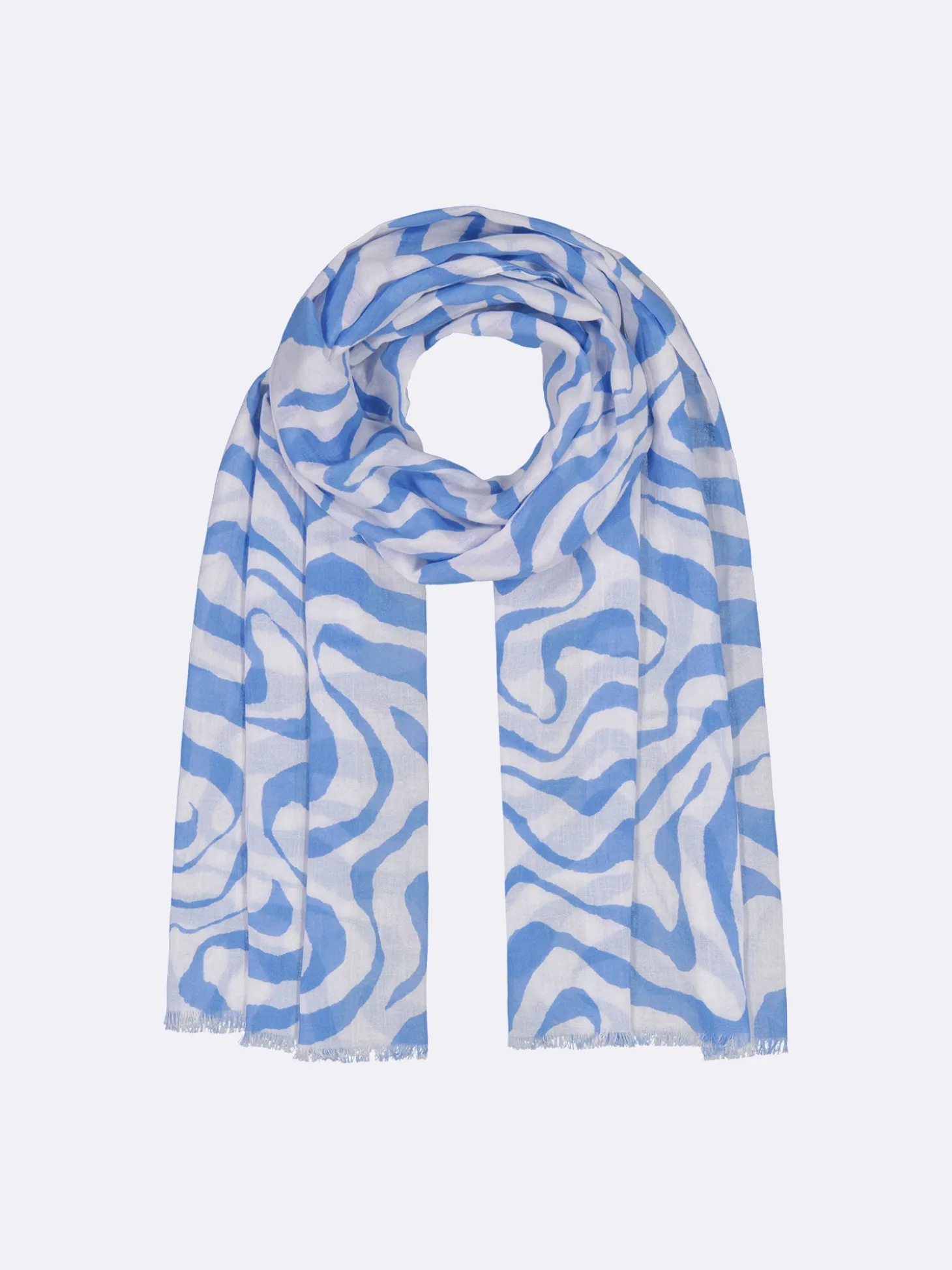 Naisten kuviollinen sininen Savanna-huivi. Kevyt huivi on ihana asuste kesään. Voit pukea sen monella tavalla ja se on luottoasuste niin hellepäiviin kuin viileämpiin kesäiltoihin. Huivin materiaali on ohutta ja kevyttä puuvilla-pellava -kangasta. Huivin pitkät sivut on huoliteltu kapealla päärmeellä ja päissä on lyhyet hapsut. Huivin koko on noin 70 cm x 180 cm.