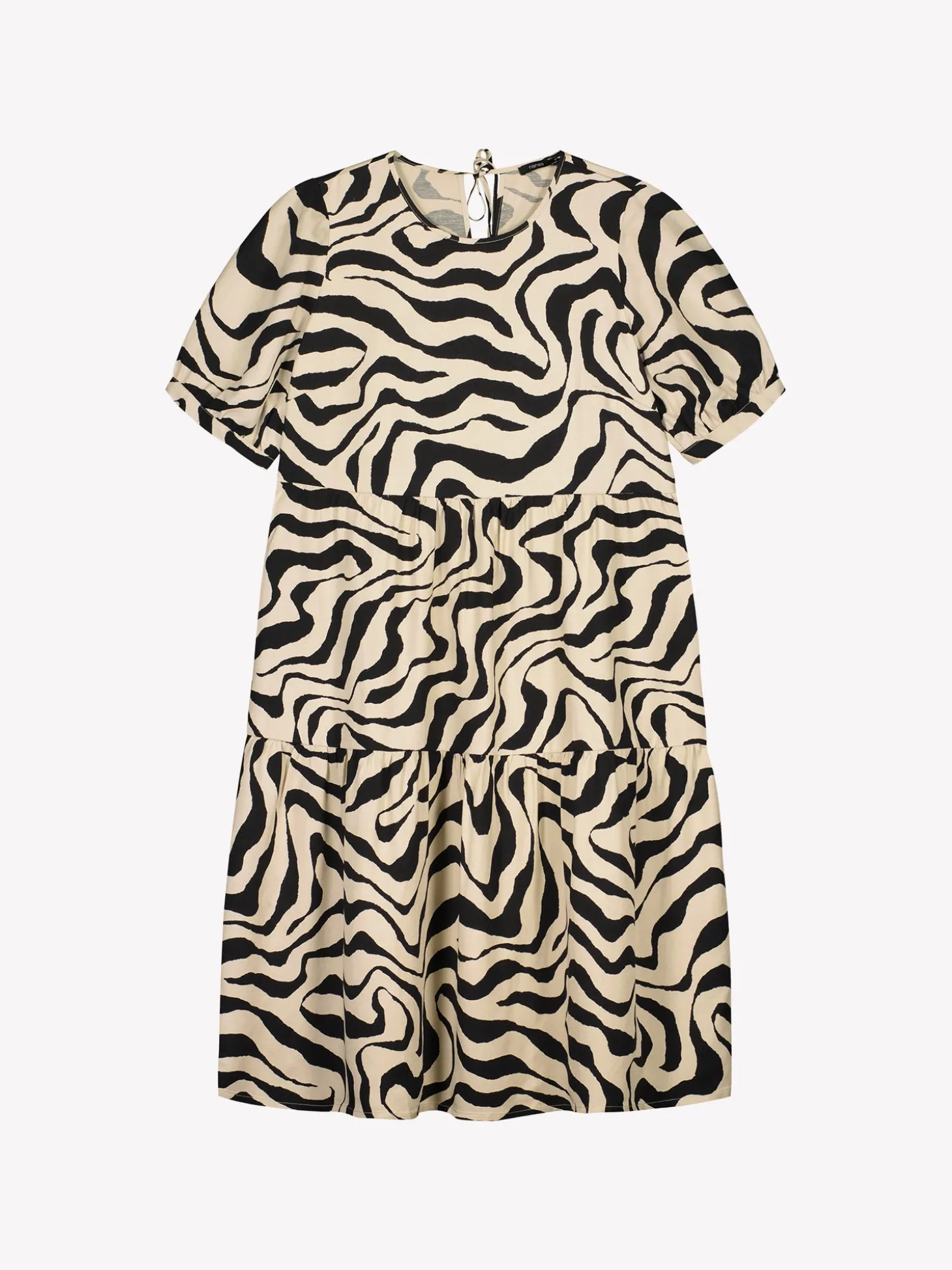 Naisten kaunis kuviollinen midi Savanna-mekko volyymisilla frillakerroksilla ja lyhyillä puhvihihoilla, joissa on napit säätövaralla. Mekossa on sivutaskut, pyöreä pääntie sekä niskassa pieni halkio ja solmittavat nyörit. Mekon pituus koossa M on noin 113 cm. Materiaalina on kudottua viskoosipellavakangas. Materiaalille on ominaista 3-5% kutistuminen ensimmäisessä pesussa.