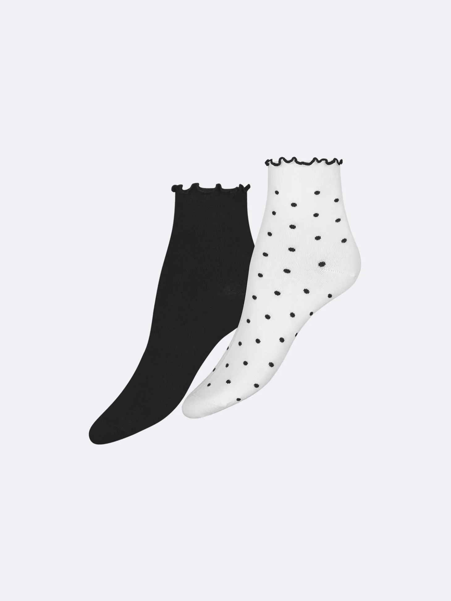 Voguen nilkkasukat pehmeästä, korkealaatuisesta luomupuuvillasta. Sukissa on kaunis frillareuna. Kahden parin pakkauksessa valkoisessa sukkaparissa on siro pilkkukuvio ja toinen sukkapari on yksivärinen musta.