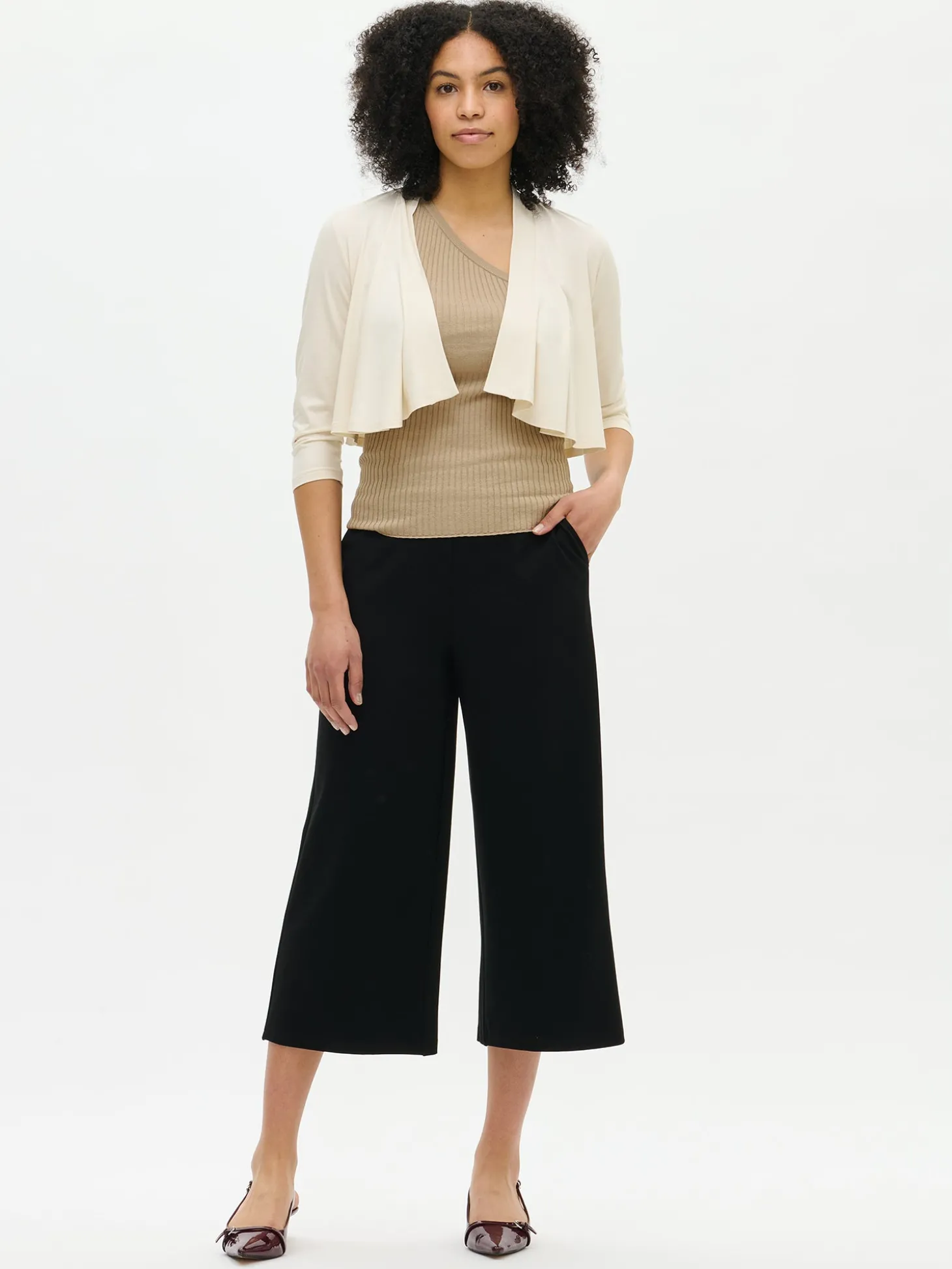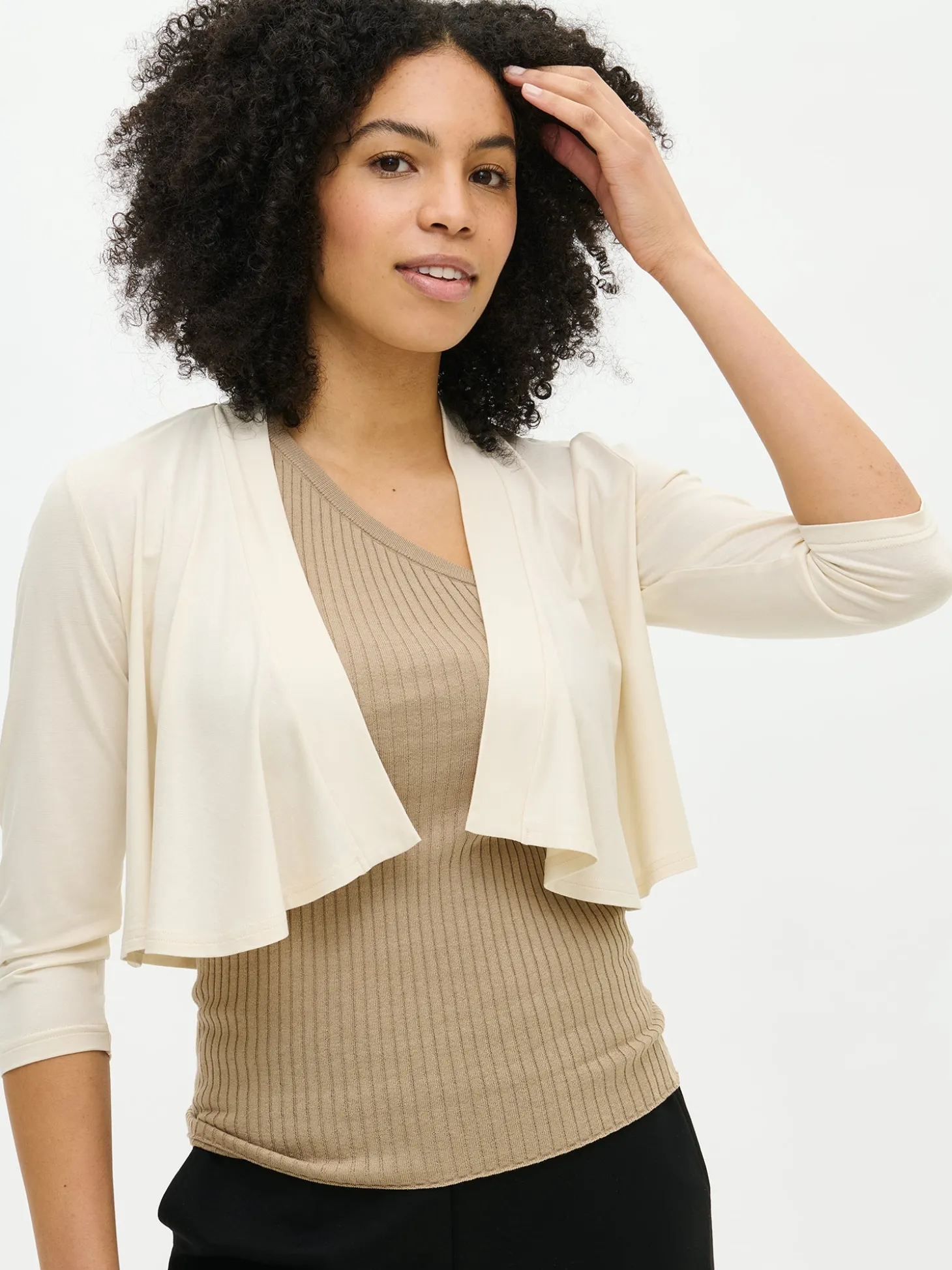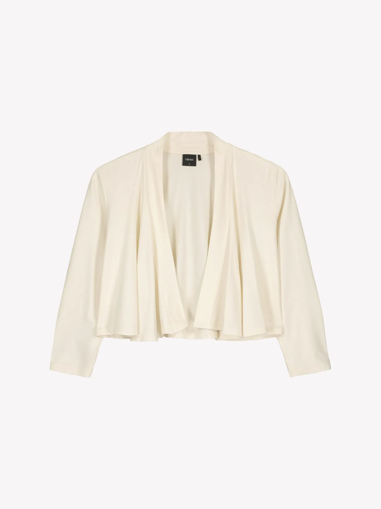 Naisten luonnonvalkoinen yksivärinen Serenadi-bolero. Lyhyessä bolerossa on listalla reunustettu pääntie ja kaarevat, kauniisti laskeutuvat etureunat sekä 3/4 pitkät hihat. Boleron pituus koossa M on noin 45 cm. Tuote on valmistettu laadukkaasta ja miellyttävän tuntuisesta Ecovero-viskoosi neuloksesta. Viskoosineulos on sähköistymätöntä ja helppohoitoista. Materiaalille on ominaista 3-5% kutistuminen ensimmäisessä pesussa. Monikäyttöinen bolero tuo tyylikkään lisän moneen asukokonaisuuteen, yhdistäen mukavuuden ja käytännöllisyyden vaivattomasti.