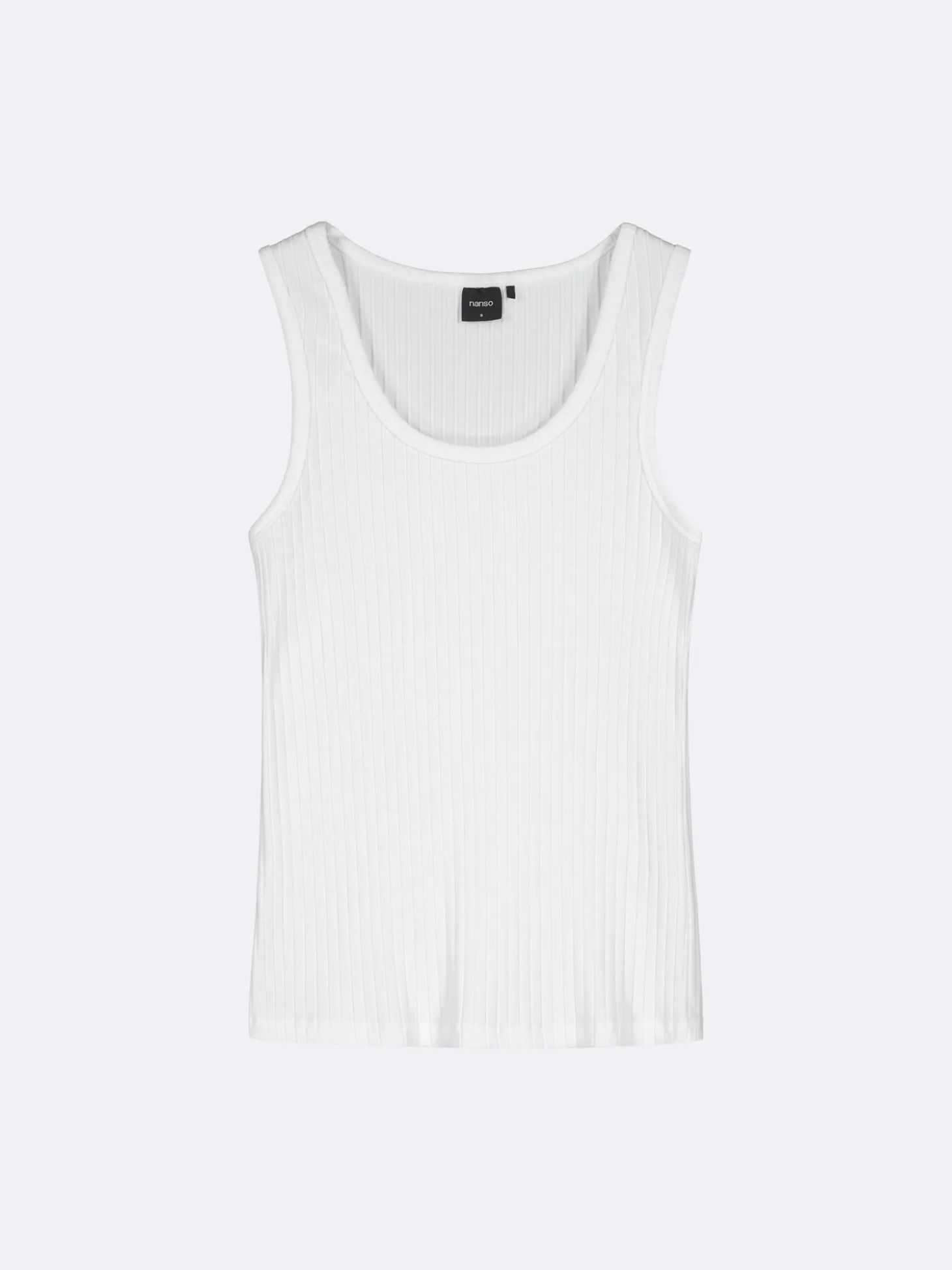 Naisten ajaton valkoinen Seri-toppi pyöreällä pääntiellä ja suoralla helmalla. Hihattoman topin pituus koossa M on noin 62 cm. Joustava ribbineulos on laadukasta ja iholla miellyttävän pehmeältä tuntuvaa puuvilla-elastaania. Pehmeä ja joustava toppi tuo täydellistä mukavuutta päivittäisiin asuihin, yhdistäen tyylin ja rentouden vaivattomasti.