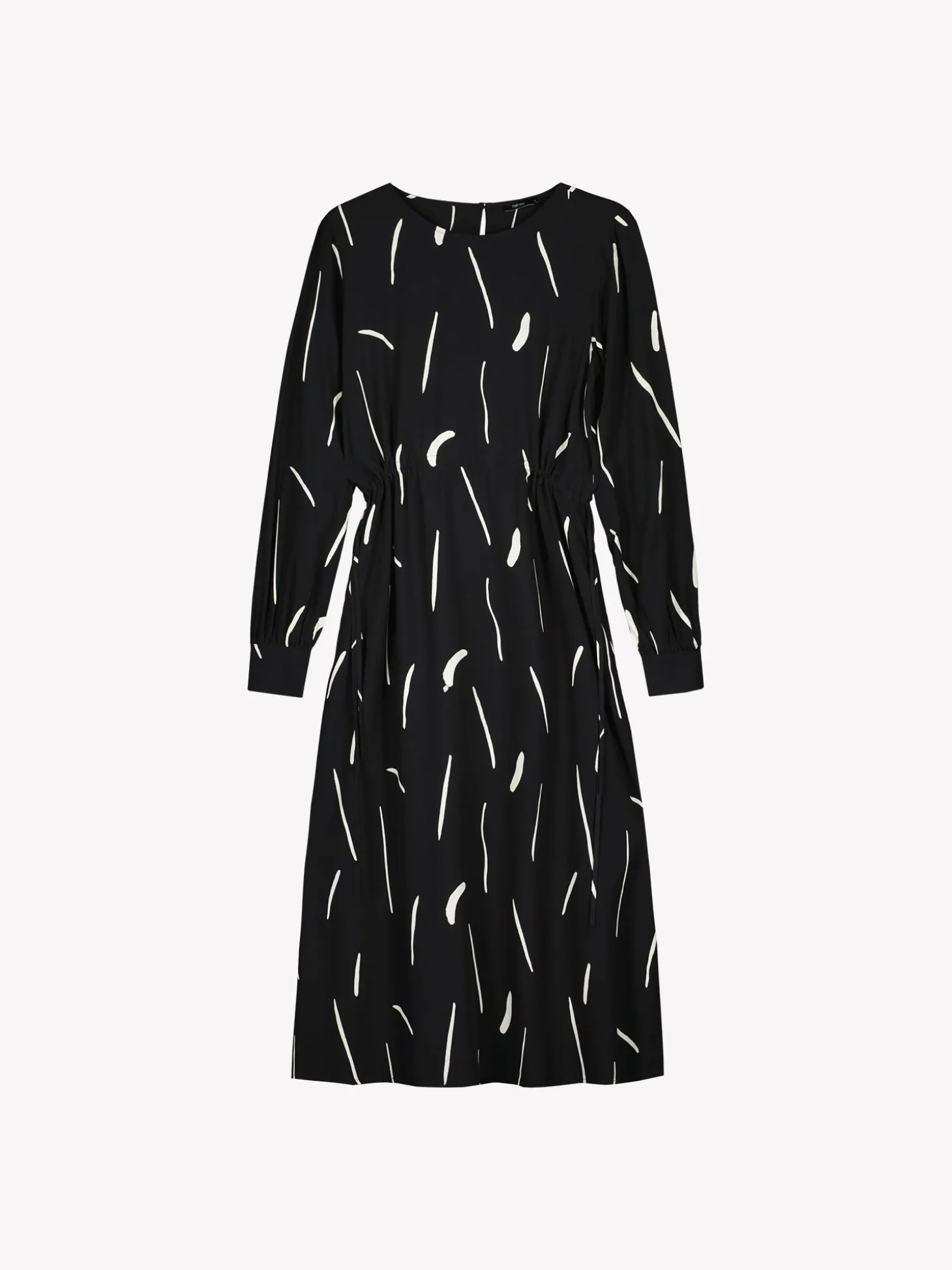 Naisten kuosillinen mustavalkoinen pitkä Sivellin-mekko. Mekossa on pyöreä pääntie, jossa takana pisaran muotoinen nappihalkio. Mekossa on sivutaskut ja kapeat sivuista solmittavat vyöt vyötäröllä. Täyspitkät hihat poimuttuvat hihansuun leveän nappikalvosimen yläpuolella. Mekon pituus koossa 38 on noin 125 cm. Materiaali on kauniisti laskeutuvaa kudottua 100 % viskoosikangasta. Materiaalille on ominaista 3-5 % kutistuminen ensimmäisessä pesussa.
