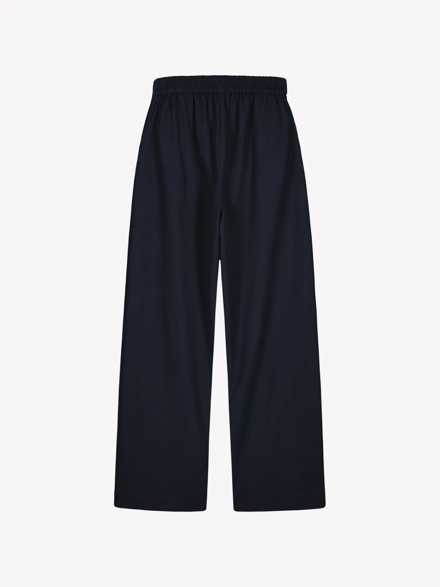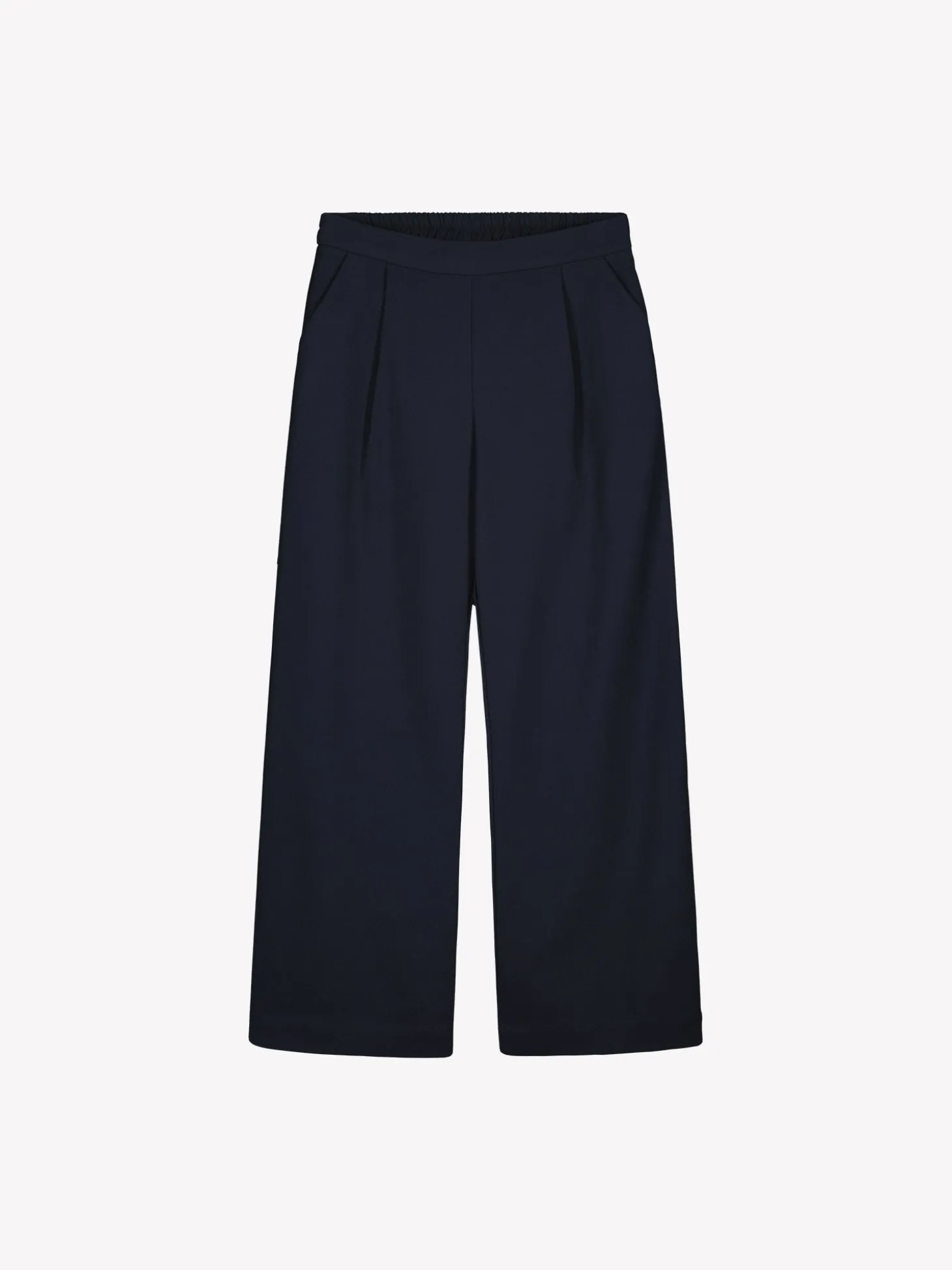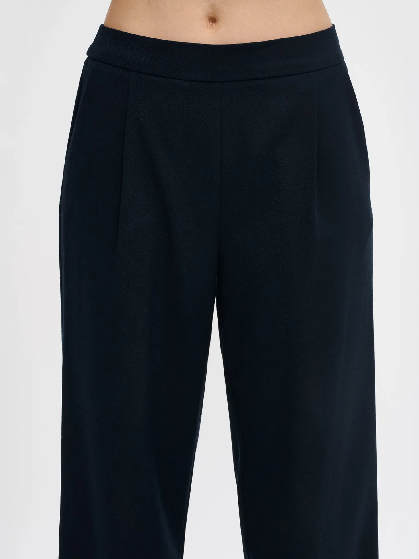Naisten tummansiniset pitkät Sointu-housut. Tyylikkäät ja mukavat housut ovat arjen luottovaate. Housuissa on edessä vyötäröllä laskokset, sivuissa taskut ja joustava vyötärö. Housuissa on täyspitkät leveät lahkeet ja lahkeen sisäpituus koossa 38 on noin 78 cm. Kauniisti laskeutuvien housujen materiaali on laadukasta ja miellyttävän tuntuista polyesteri-viskoosi-sekoitekangasta, jossa on hieman elastaania antamassa joustoa. Kankaan mattapinta on twill sidoksinen.